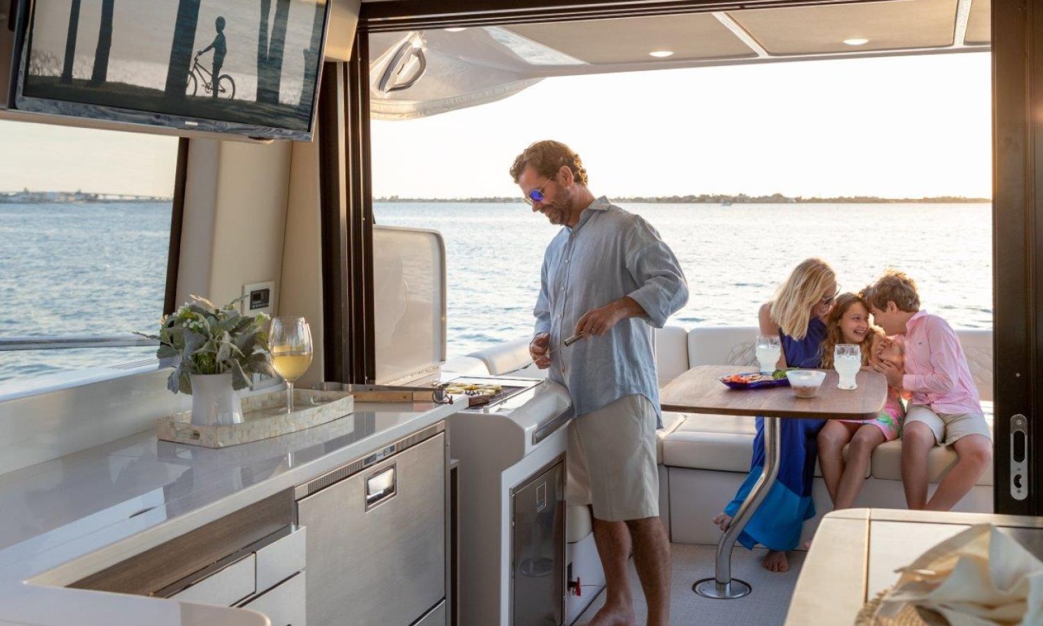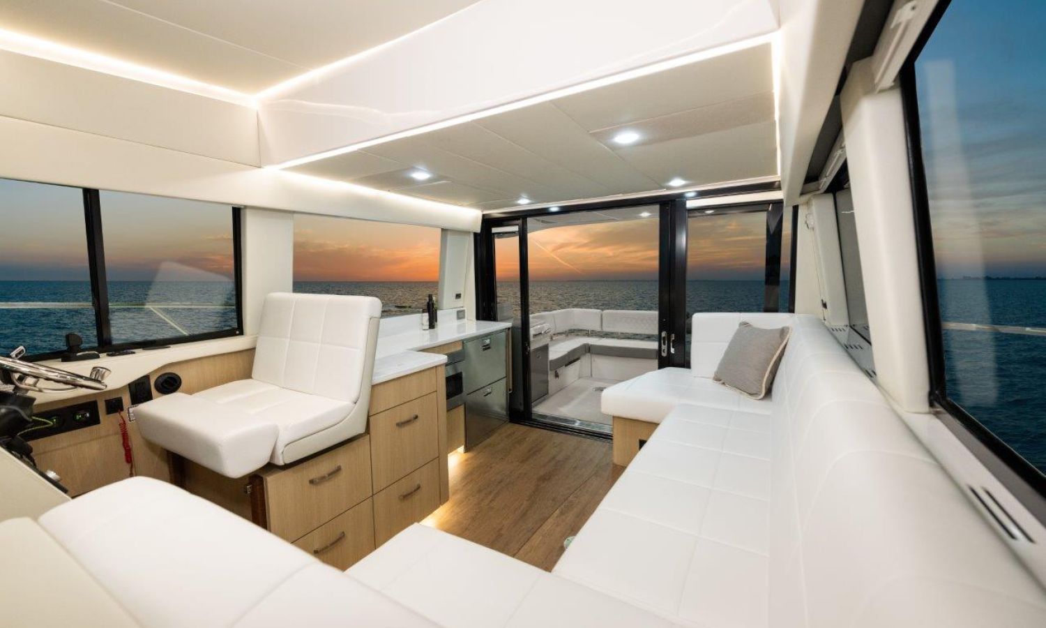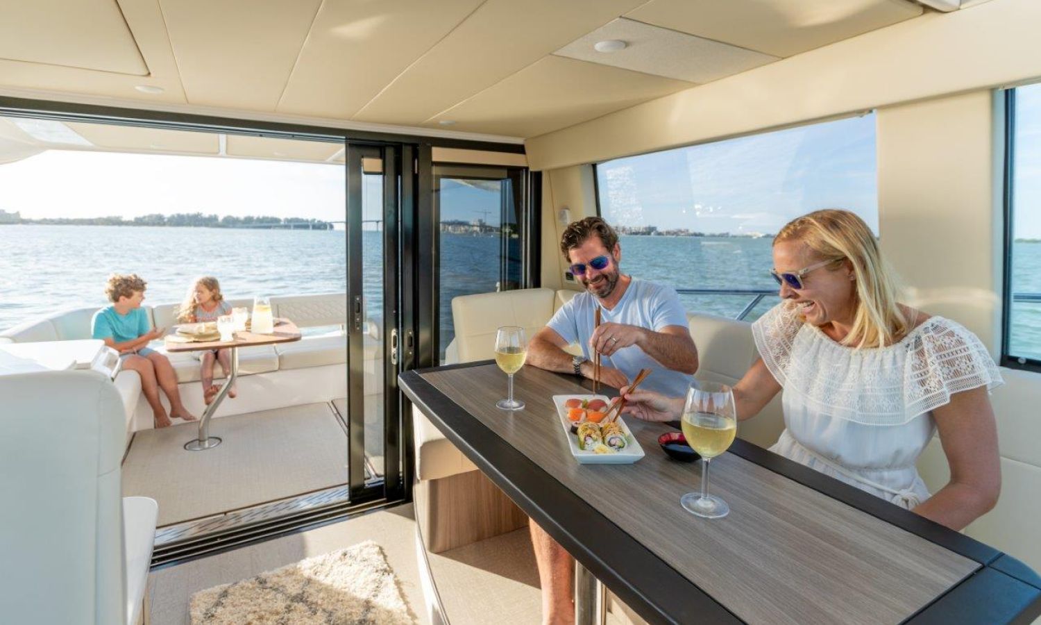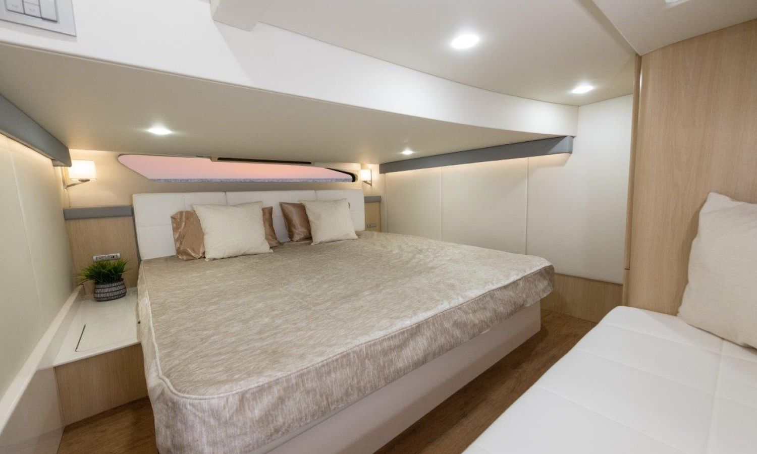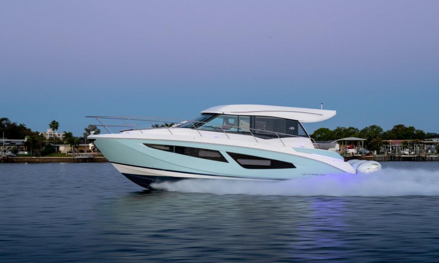Open up new horizons with the 42 XO. Its beautifully crafted cabin features a spacious layout with options of a second head or lower refreshment center. The standard on-suite head boasts of premium materials and a separate walk-in shower. Upstairs, the full-beam retractable hardtop, opening side windows, and sliding glass doors combine the upper salon and aft patio to ultimately embrace outdoor living and entertaining.