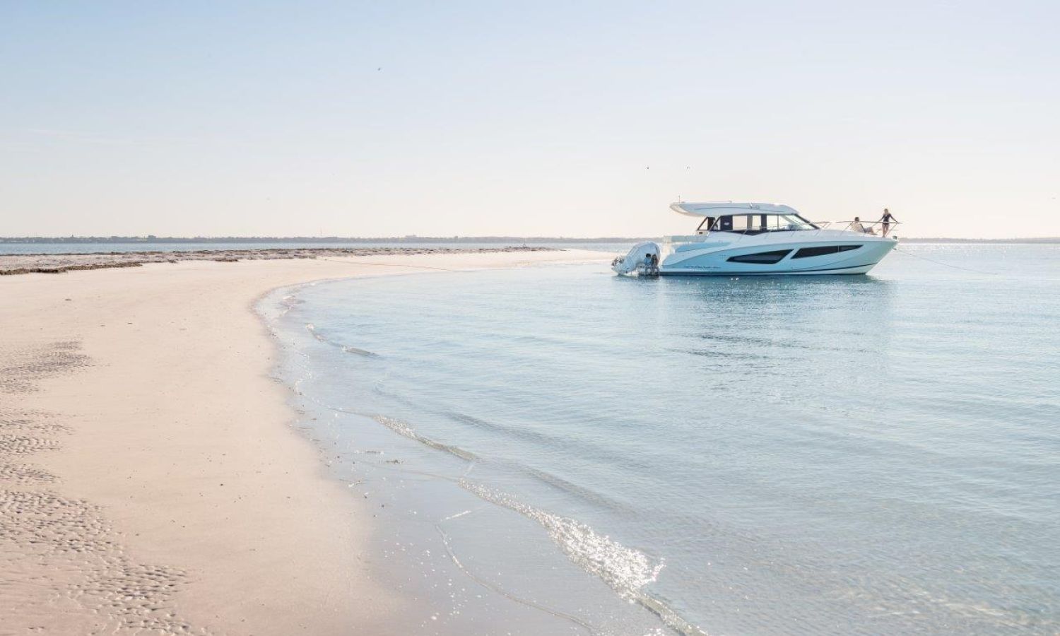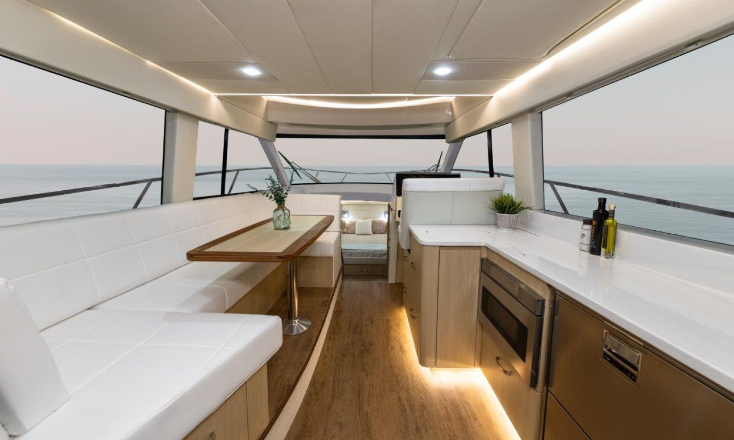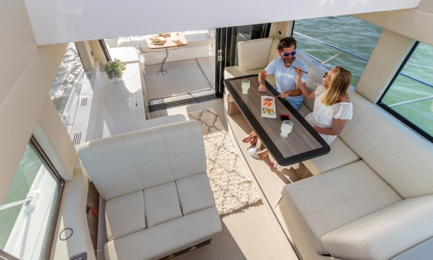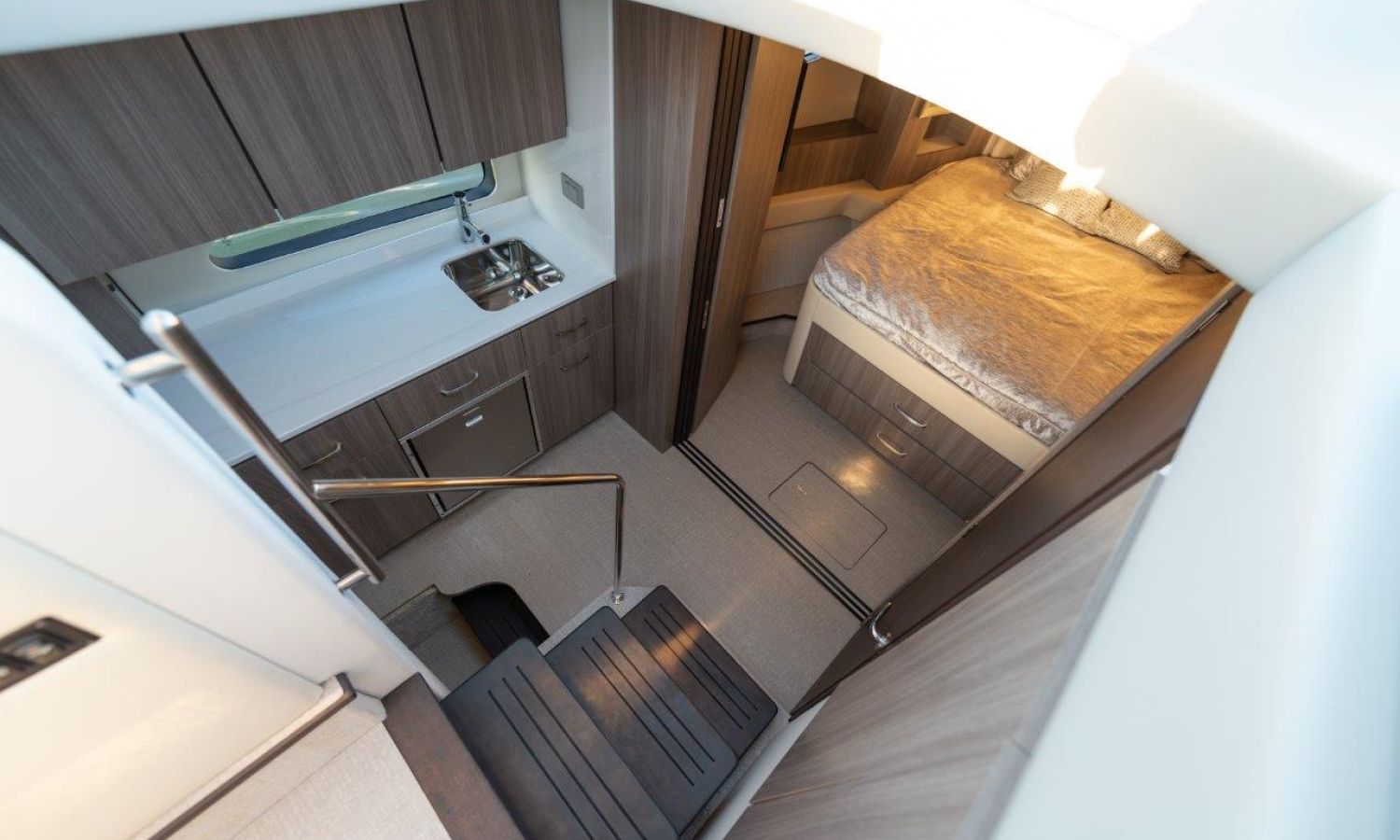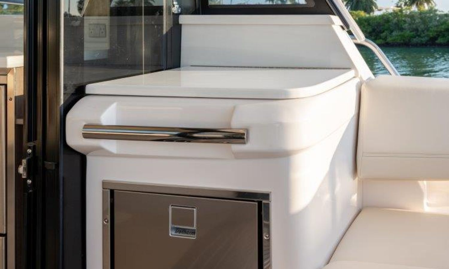 Open up new horizons with the 42 XO. Its beautifully crafted cabin features a spacious layout with options of a second head or lower refreshment center. The standard on-suite head boasts of premium materials and a separate walk-in shower. Upstairs, the full-beam retractable hardtop, opening side windows, and sliding glass doors combine the upper salon and aft patio to ultimately embrace outdoor living and entertaining.
