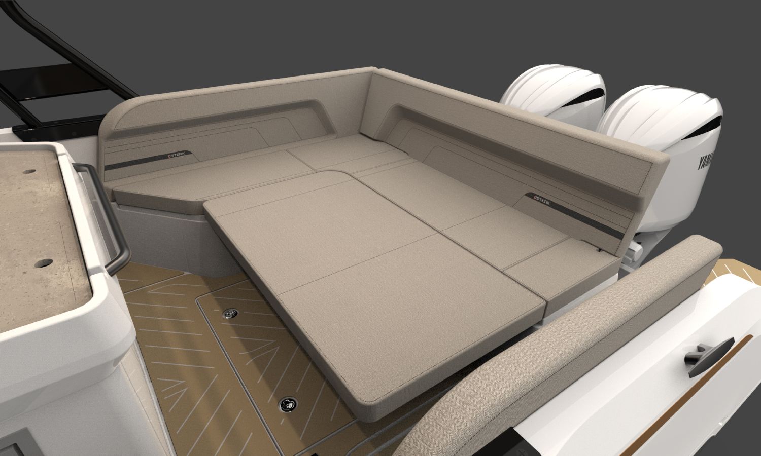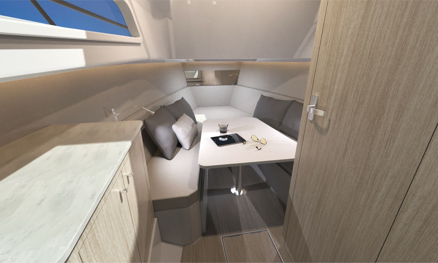 Electric windlass with anchor and chain - Bow thruster - Leaning post in cockpit with sink, refrigerator and gas stove - GRP T-Top, POLISHED frame with navigation lights - Ski mast - Storage space instead of table in interior cabin - Bathroom with toilet and holding tank - Foldable side seat in portside cockpit - Compass - Q Display 210 electronic equipment - Depth sounder - Nautical chart - Stern boom for T-Top - Console and cockpit seat covers - Mooring kit - Builder's certificate - Transport from the shipyard to the Costa Brava - Preparation, assembly and launch with sea trials - Antifouling paint.Boat description