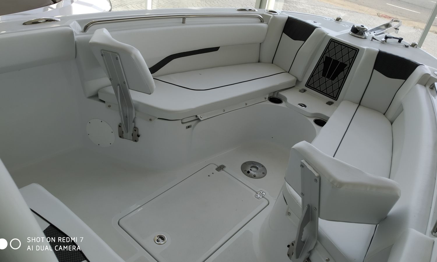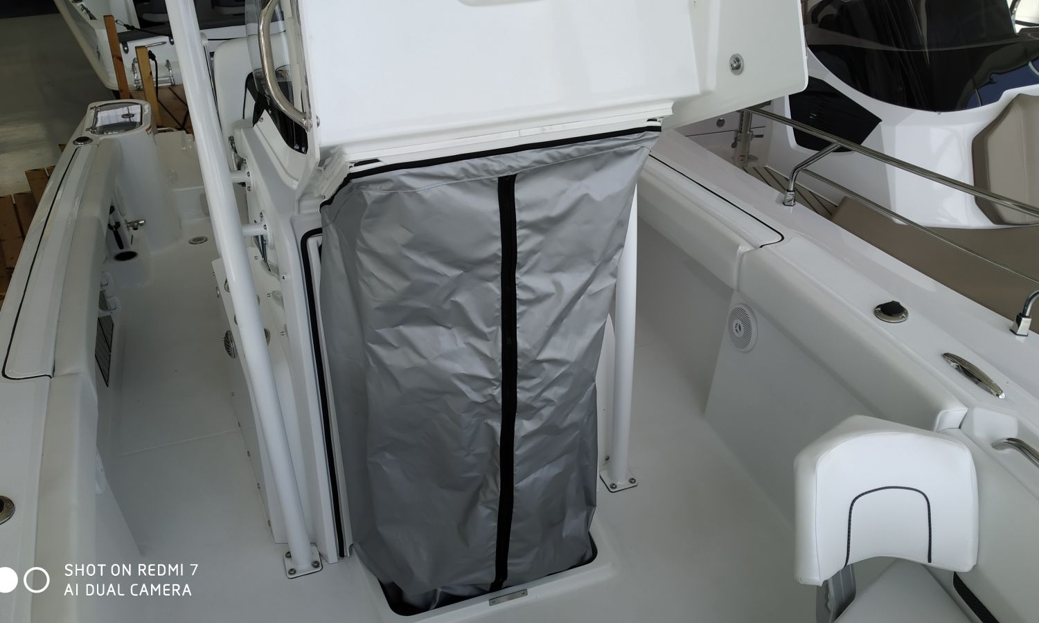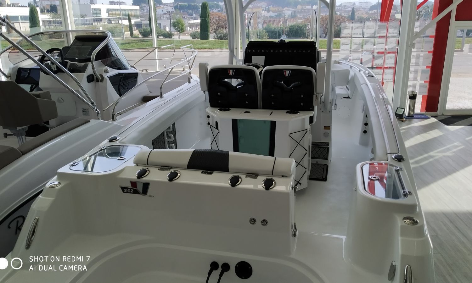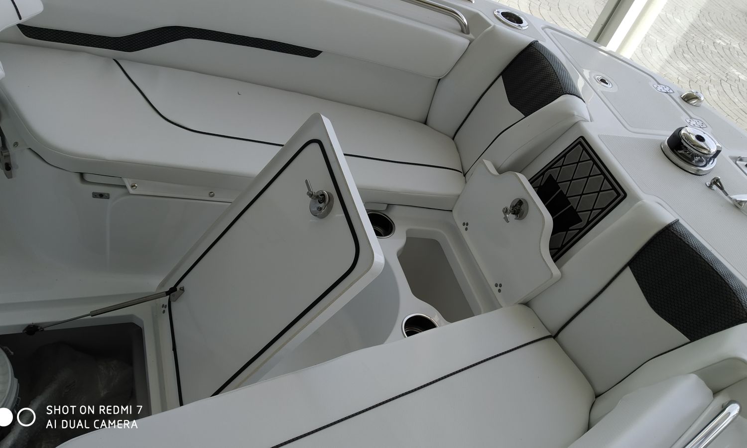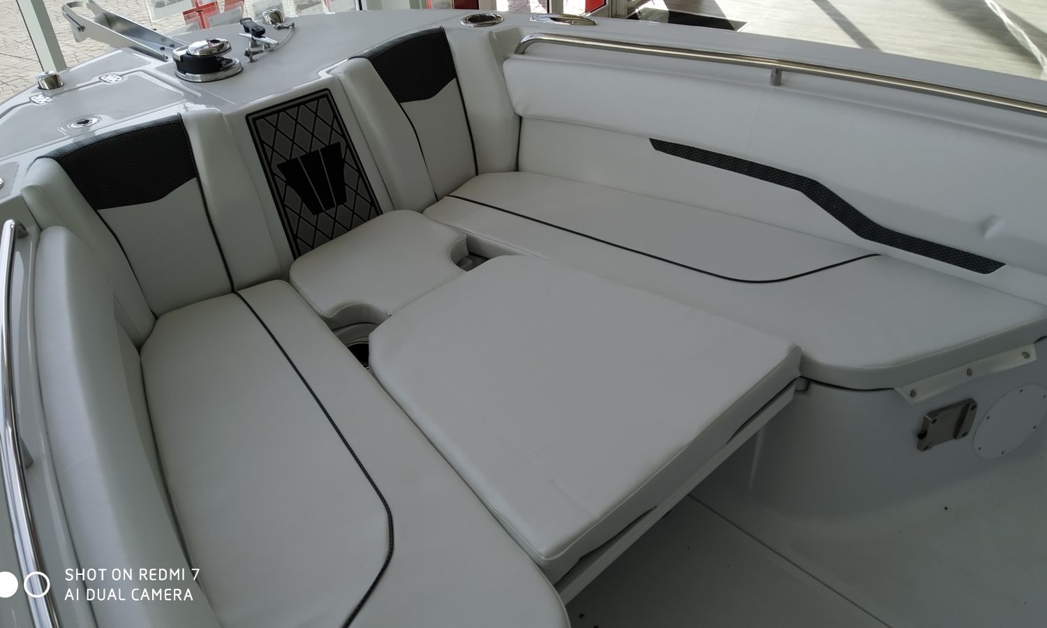 Two tone hull colour (Blue hull under white) - T-Top Deluxe - Carbon Fiber interior upholstery - Bow seat pack (includes bow cushion, console cushion and backrest) - Deluxe sound system for T-top Deluxe - Electric windlass - Bow sundeck extension cushion - Bow table - Cockpit sink and shower, Synthetic cutting board at stern with nursery - Marine toilet with black water tank with macerator and flushing system - Console and seating canvas - Haima type awning at bow with carbon masts - Underwater spotlights - Cockpit tapestry with rod storage - Premium cockpit - Removable backrests at bow - Battery charger + holders and switch - Battery charger + holders and switch - Transport Shipyard-Costa-Brava.Boat description