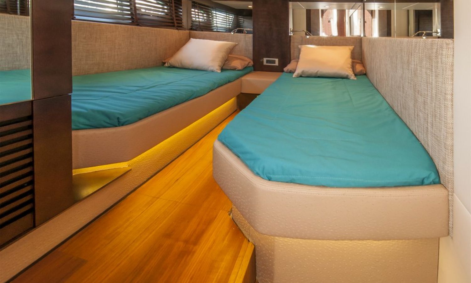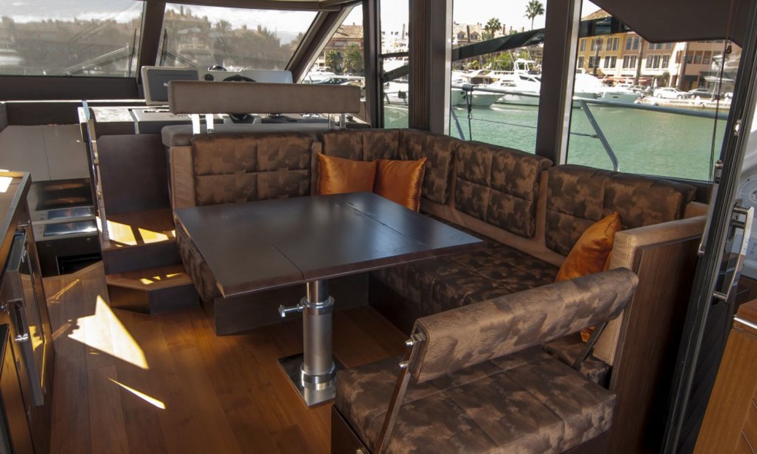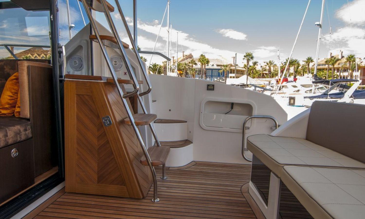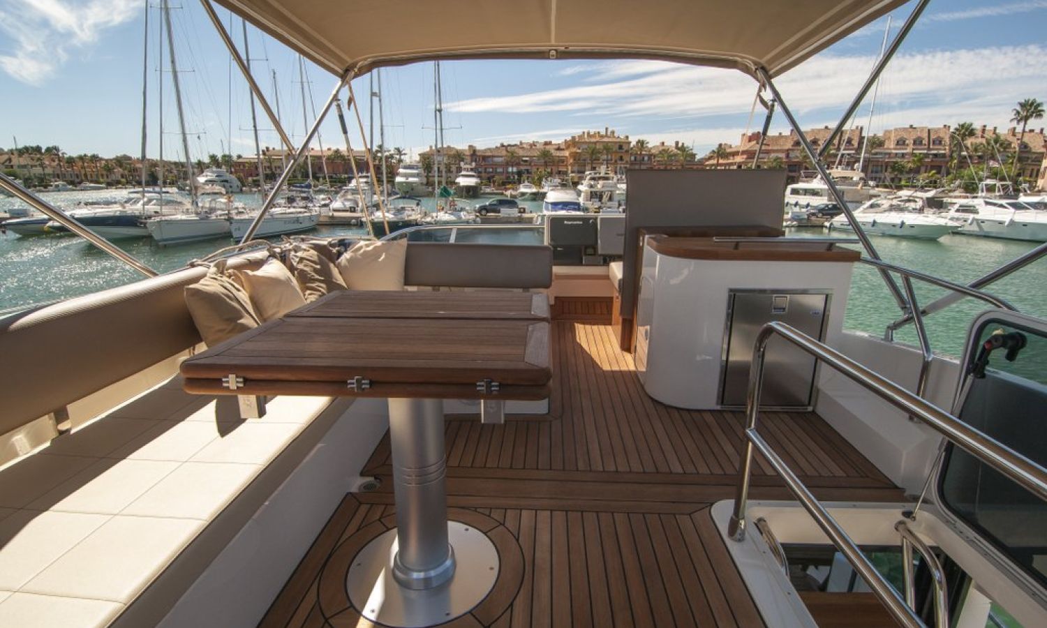 Toldo bimini en Flybridge - 3 cabinas - Ducha en popa - Plataforma de baño hidráulica con escalera - Solárium de popa - Mesa en la bañera - Solárium de proa - Mueble-bar con fregadero - Bañera en teka - Cargador de baterias - Toma de puerto 220 V. - Generador - Aire acondicionado - Nevera/Congelador - Placa vitrocerámica - Microondas - Lavavajillas - Gps/Plotter/Sonda - VHF - Piloto automático - Joystick de amarre en popa - Radar Raymarine 15" - Tv en el salón - Equipo de audio - Luces sub-acuáticas - Molinete eléctrico con ancla y cadena - 2 WC eléctricos con depósito de aguas negras - Antifouling.Estabilizador giroscópico