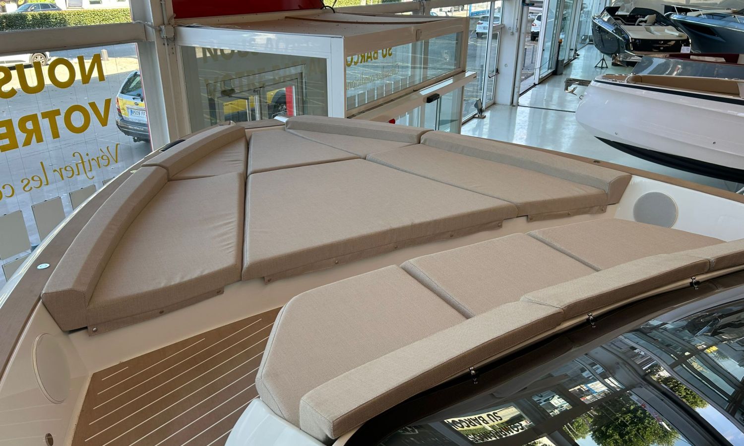 Pintura sólo línea de belleza - Color casco bajo línea de belleza (antracita) - Hard top con pintura en fibra de carbono y sistema de luces - Toldo parasol a popa con palos de carbono - Nevera en bañera - Segunda nevera en bañera - Horno microondas - Doble pantalla Glass Cockpit Simrad Chartplotter GPS 15 - Joystick Volvo Penta - Piloto automático Simrad - VHF Simrad - Sistema de sonido estéreo JL - Hélice de proa - Mando a distancia molinete con contador cadena - Preparación, botadura y entrega con prueba de mar - Transporte de astillero a Costa Brava.Descripción embarcación