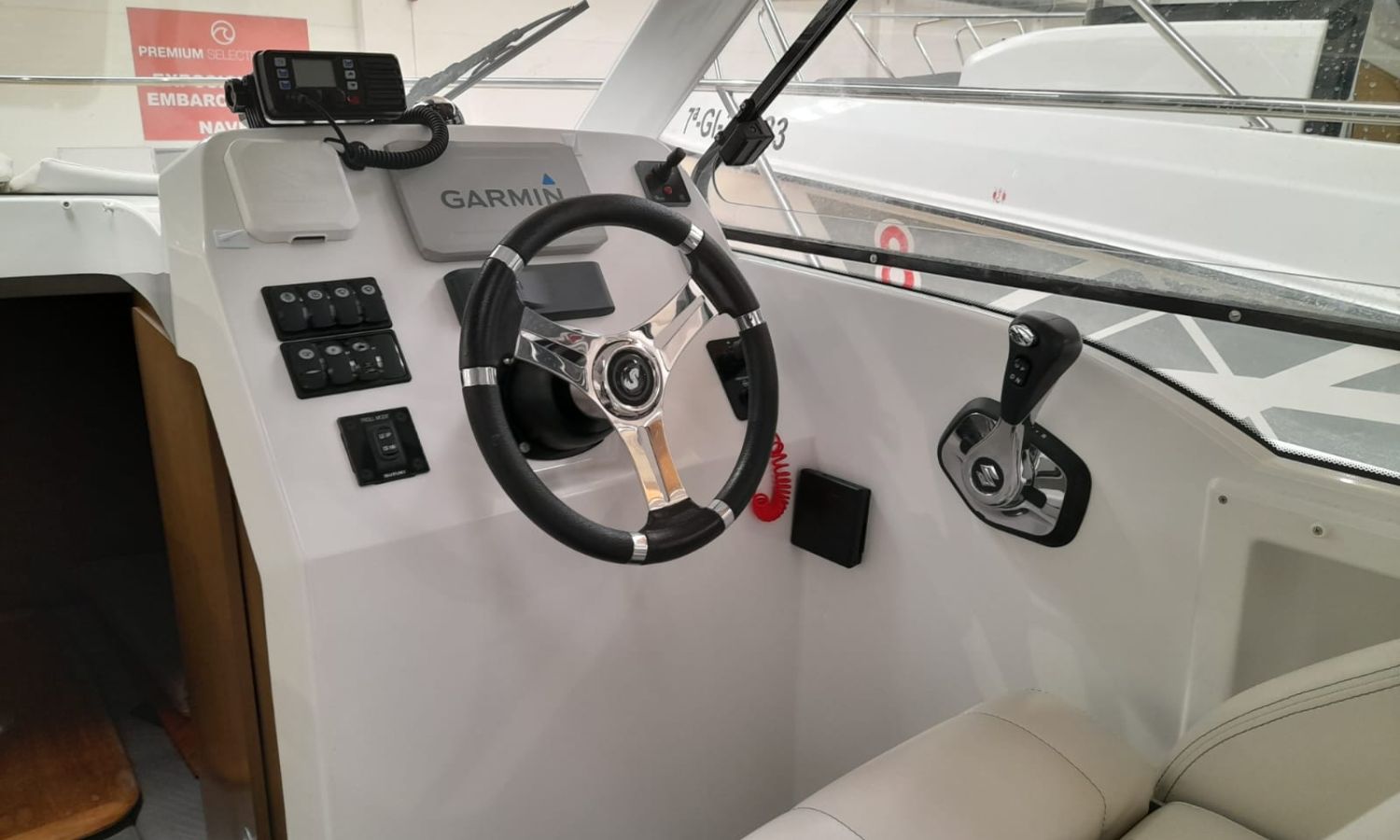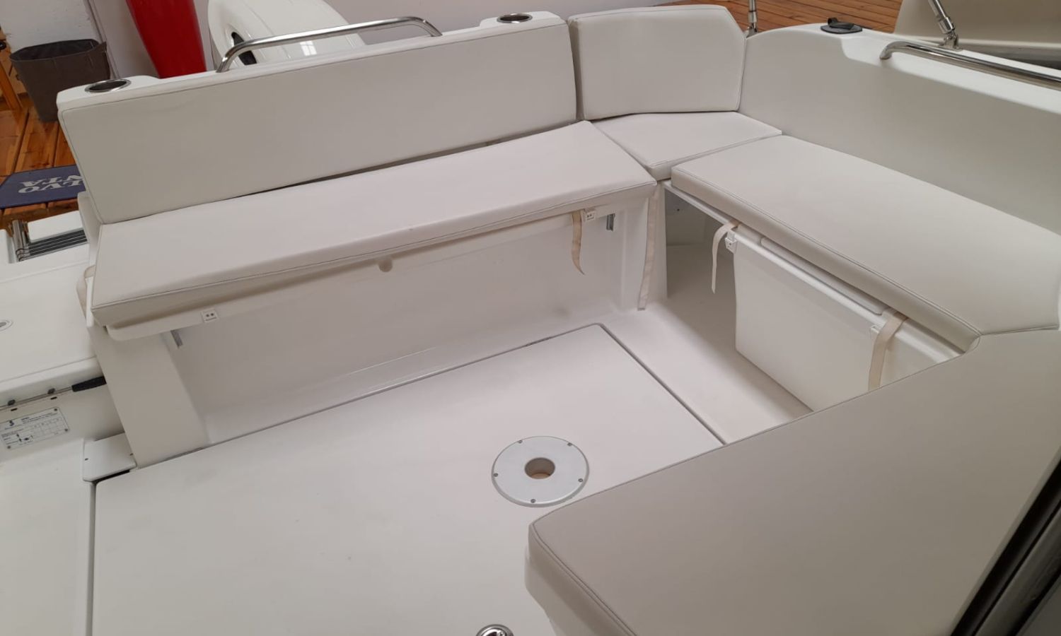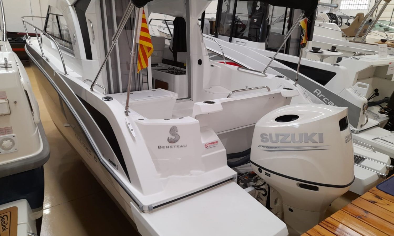 Toldo parasol - Ducha en popa - Escalera de baño - Solárium de proa - Mesa en la bañera - Mueble-bar con fregadero - Nevera 12 V - Molinete eléctrico con ancla y cadena - Hélice de proa - Gps/Plotter/Sonda - VHF - Compás - Equipo de audio - Toma de puerto 220 V - Cargador de baterías - Flaps - WC eléctrico con depósito de aguas negras - Cabina - Antifouling.