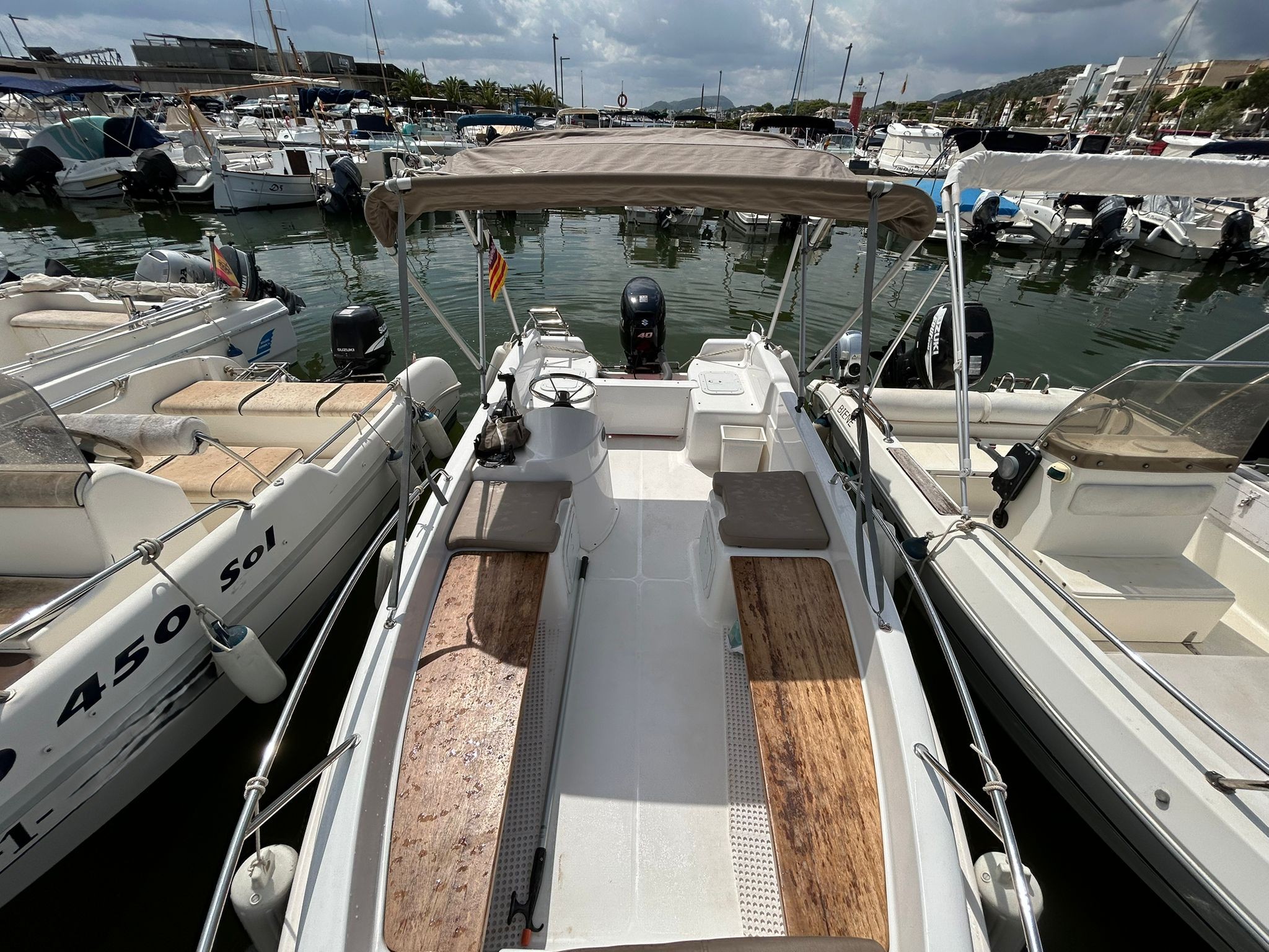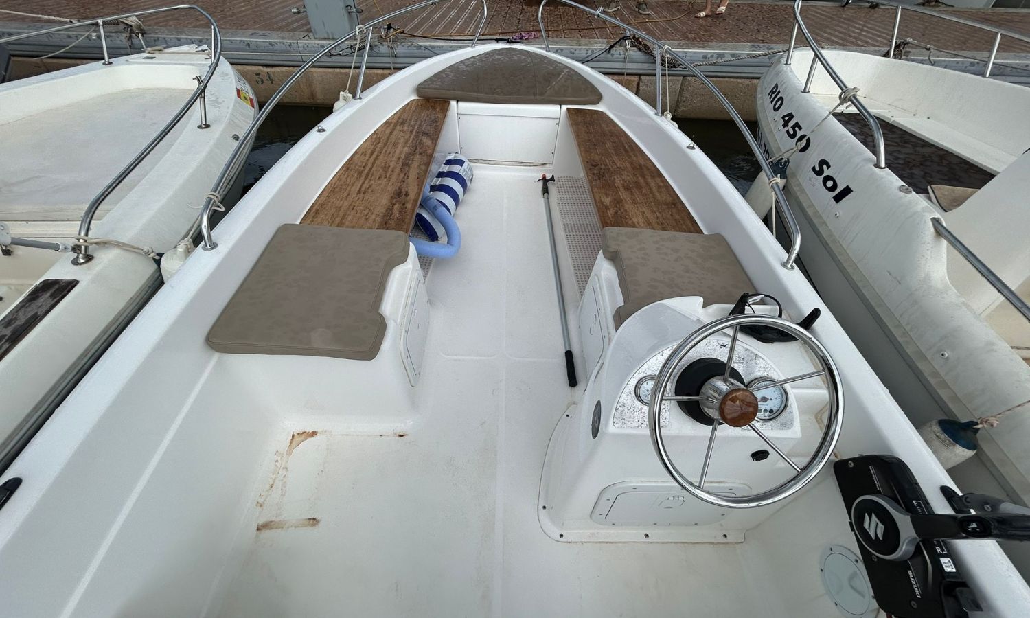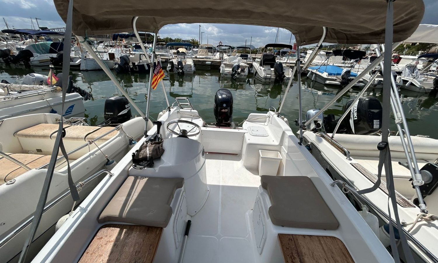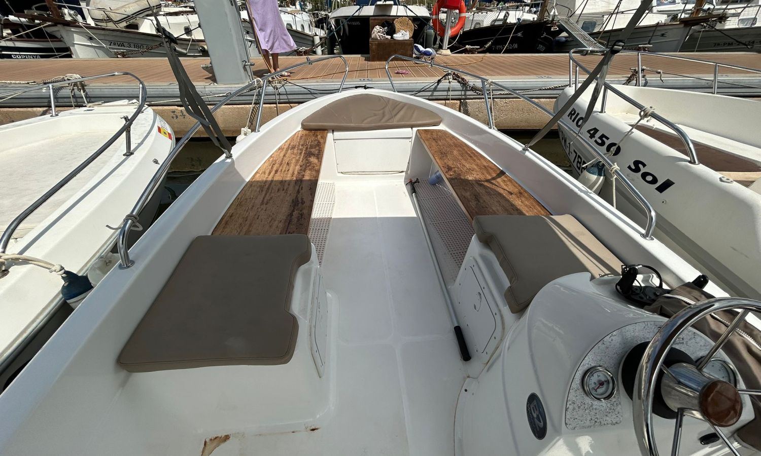 Escalera de baño - Toldo Bimini - Sonda Garmín - 2 puertos USB - 2 bancos de madera - 2 fundas verano e invierno - Cojines - Ancla y cadena - Remolque - Antifouling.Descripción embarcación