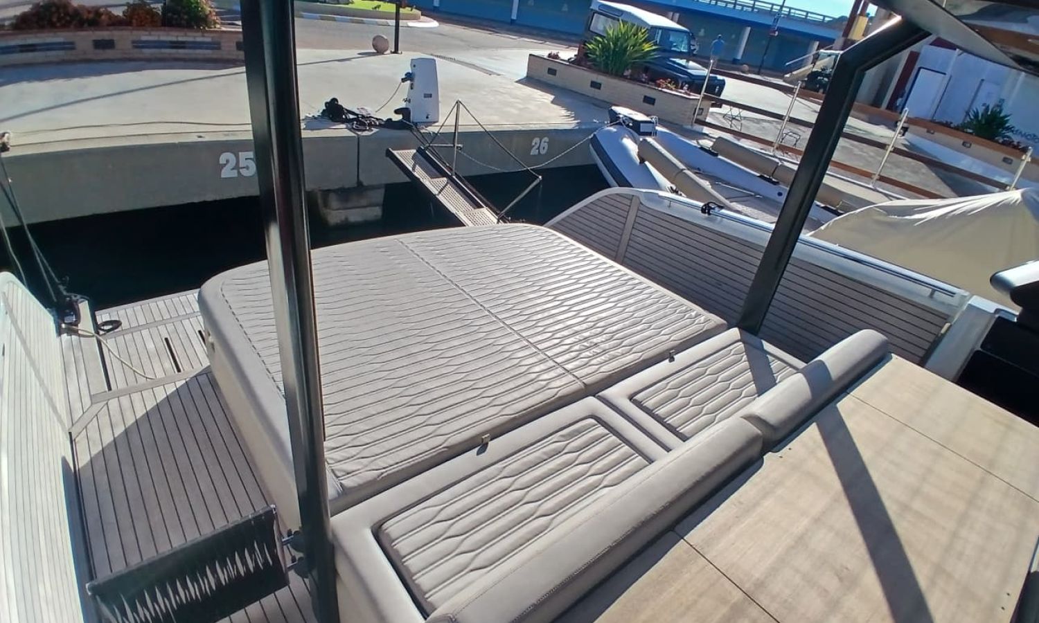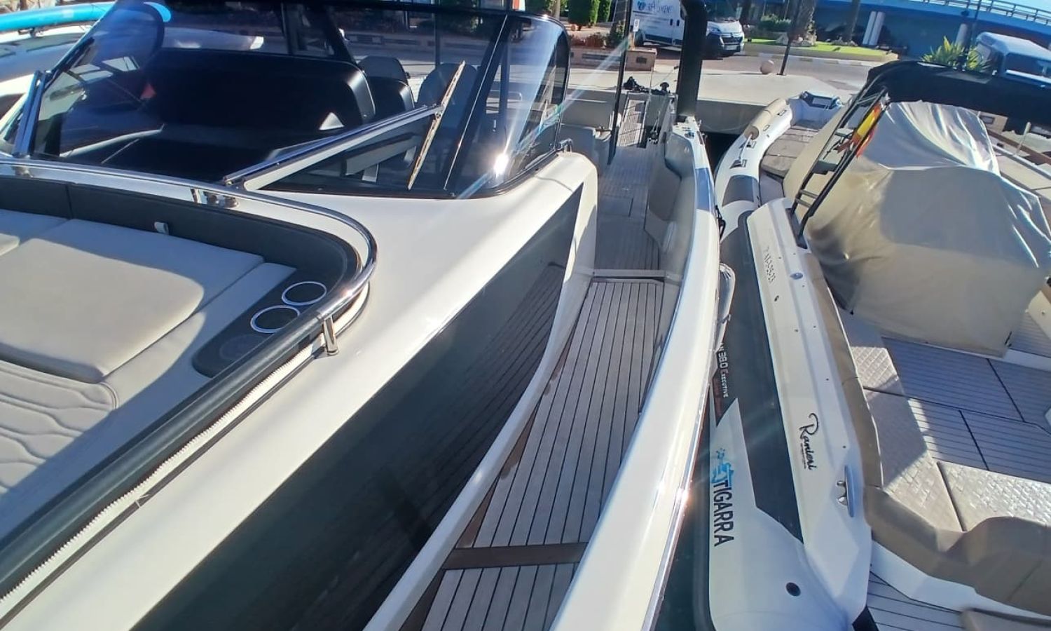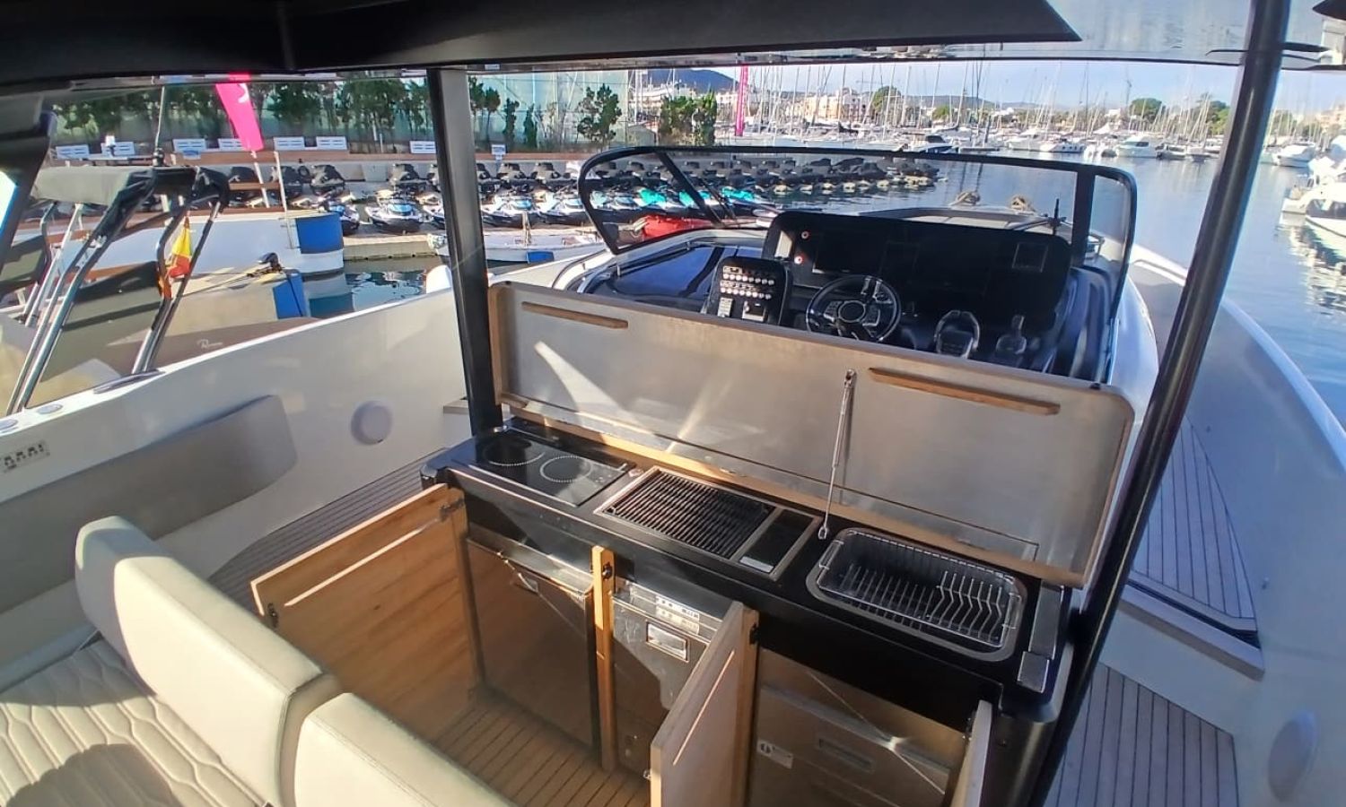 Depósito de aguas negras - Aire acondicionado 16.000 BTU en cabina con bomba de calor - Fundas (para cuadro de mandos, asiento piloto, sofá, mesa muebles y solárium de popa) - Correctores Automatic List + correctores de viraje Coordinated Turn Control - Hélice de proa - Nevera en bañera - Generador 8 kW - Barbacoa eléctrica en bañera - Máquina de hielo - Paredes laterales de popa plegables - Pasarela hidráulica - Piloto automático - Plataforma hidráulica subida/bajada - Bañera y paredes laterales plegables en teka - Superficie de teka en los trancaniles laterales - T-Top - VHF - Certificado CE - Banda de popa (marco lateral y plataforma) lacada - T-Top lacado - Preparación, botadura y entrega con prueba de mar - Transporte astillero a Costa Brava.Descripción embarcación