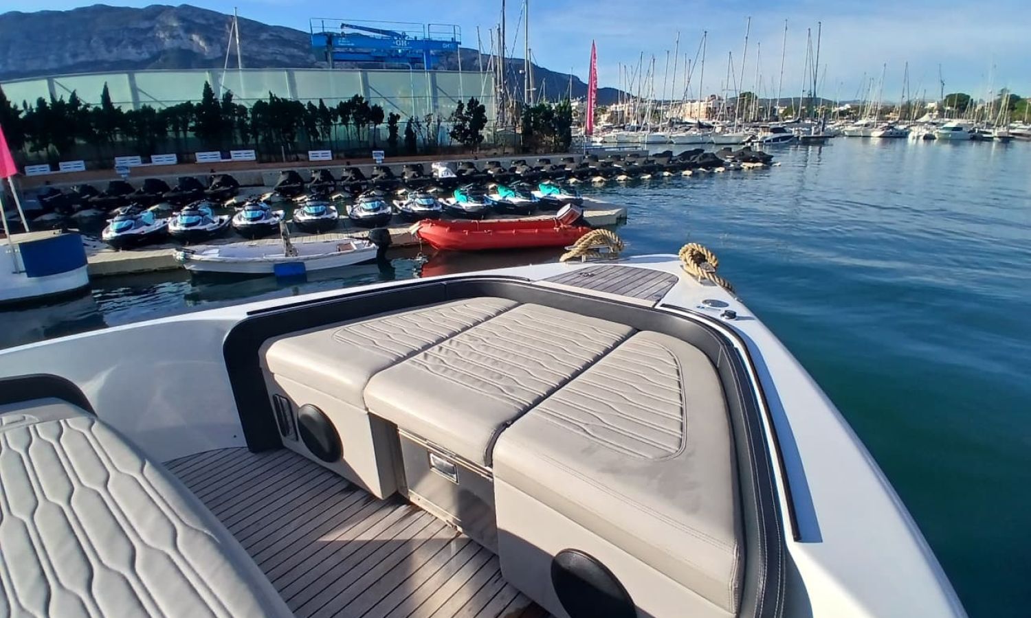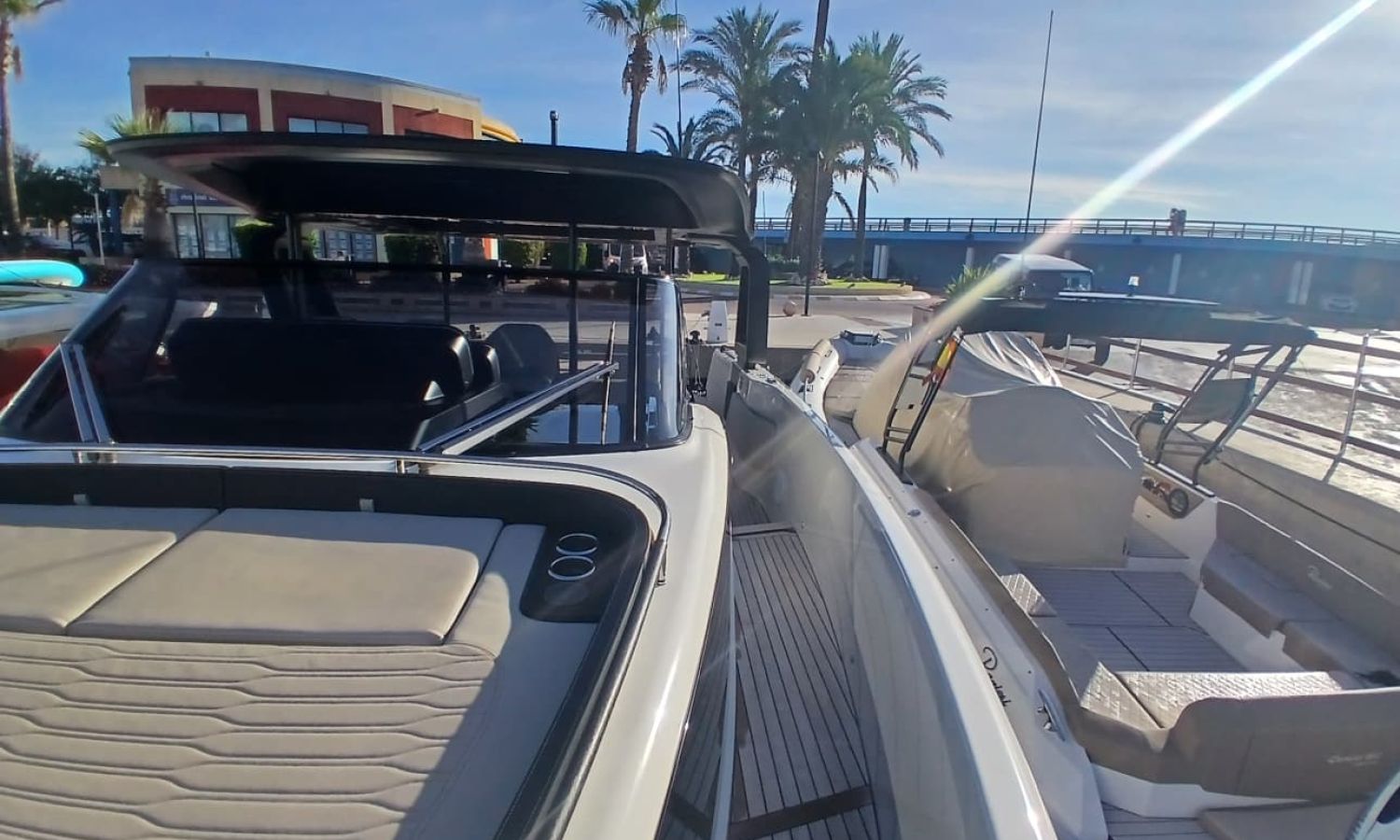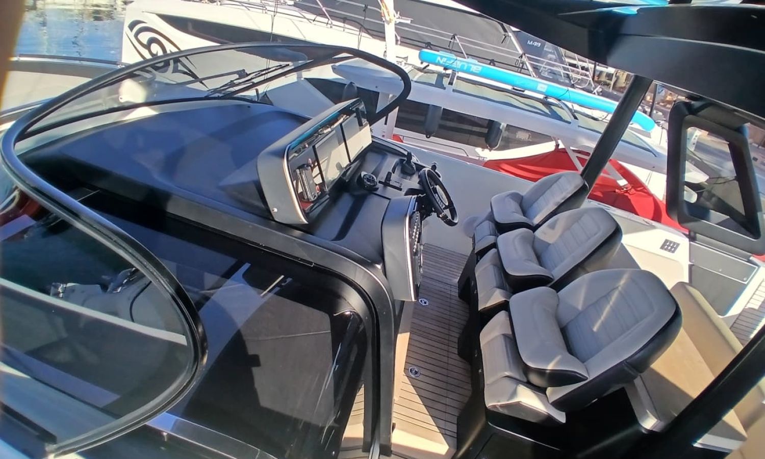 Depósito de aguas negras - Aire acondicionado 16.000 BTU en cabina con bomba de calor - Fundas (para cuadro de mandos, asiento piloto, sofá, mesa muebles y solárium de popa) - Correctores Automatic List + correctores de viraje Coordinated Turn Control - Hélice de proa - Nevera en bañera - Generador 8 kW - Barbacoa eléctrica en bañera - Máquina de hielo - Paredes laterales de popa plegables - Pasarela hidráulica - Piloto automático - Plataforma hidráulica subida/bajada - Bañera y paredes laterales plegables en teka - Superficie de teka en los trancaniles laterales - T-Top - VHF - Certificado CE - Banda de popa (marco lateral y plataforma) lacada - T-Top lacado - Preparación, botadura y entrega con prueba de mar - Transporte astillero a Costa Brava.Descripción embarcación