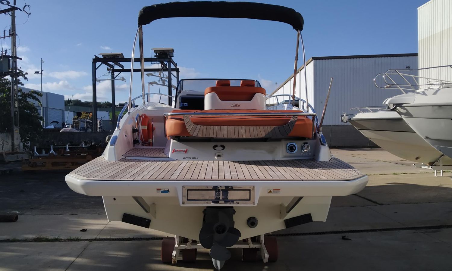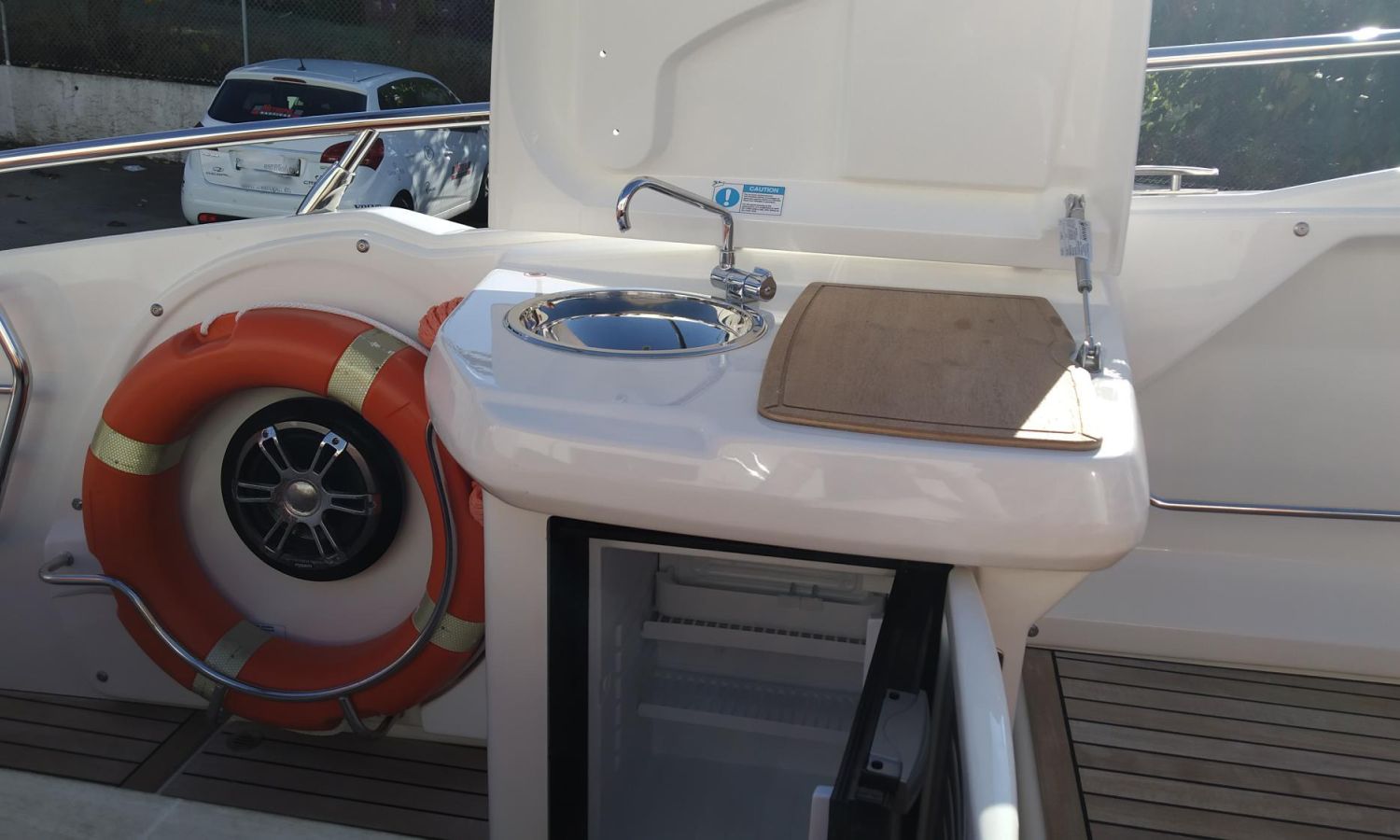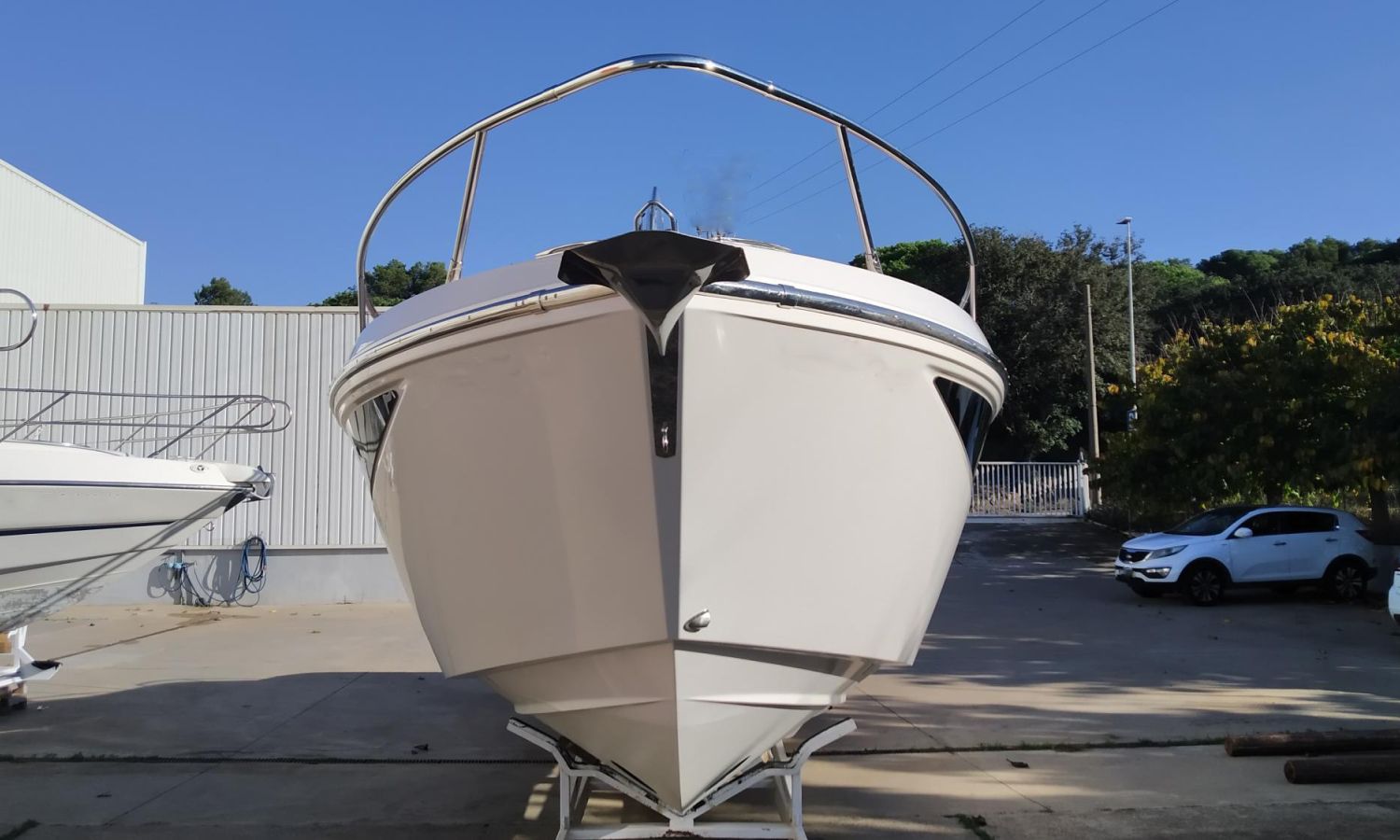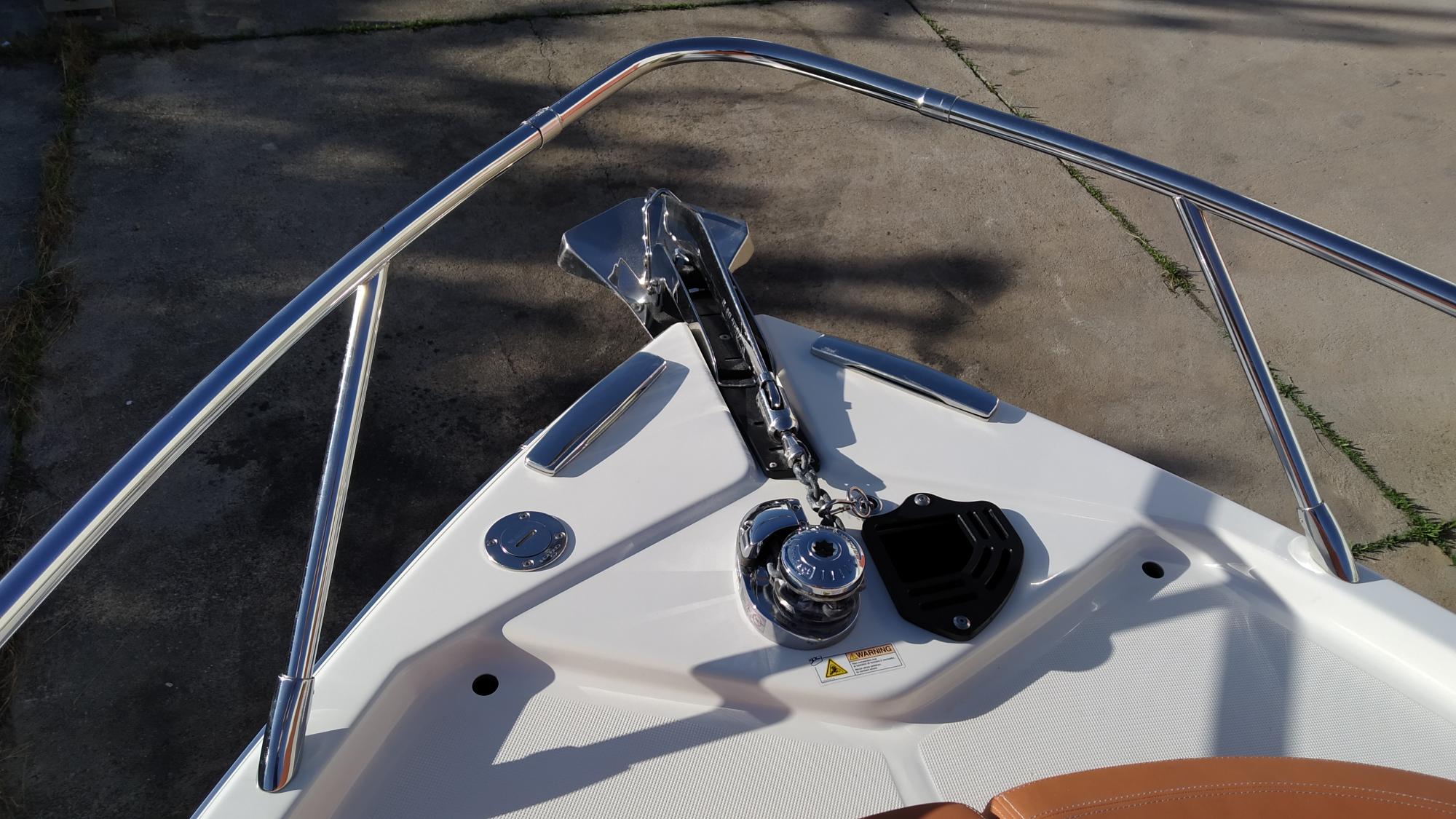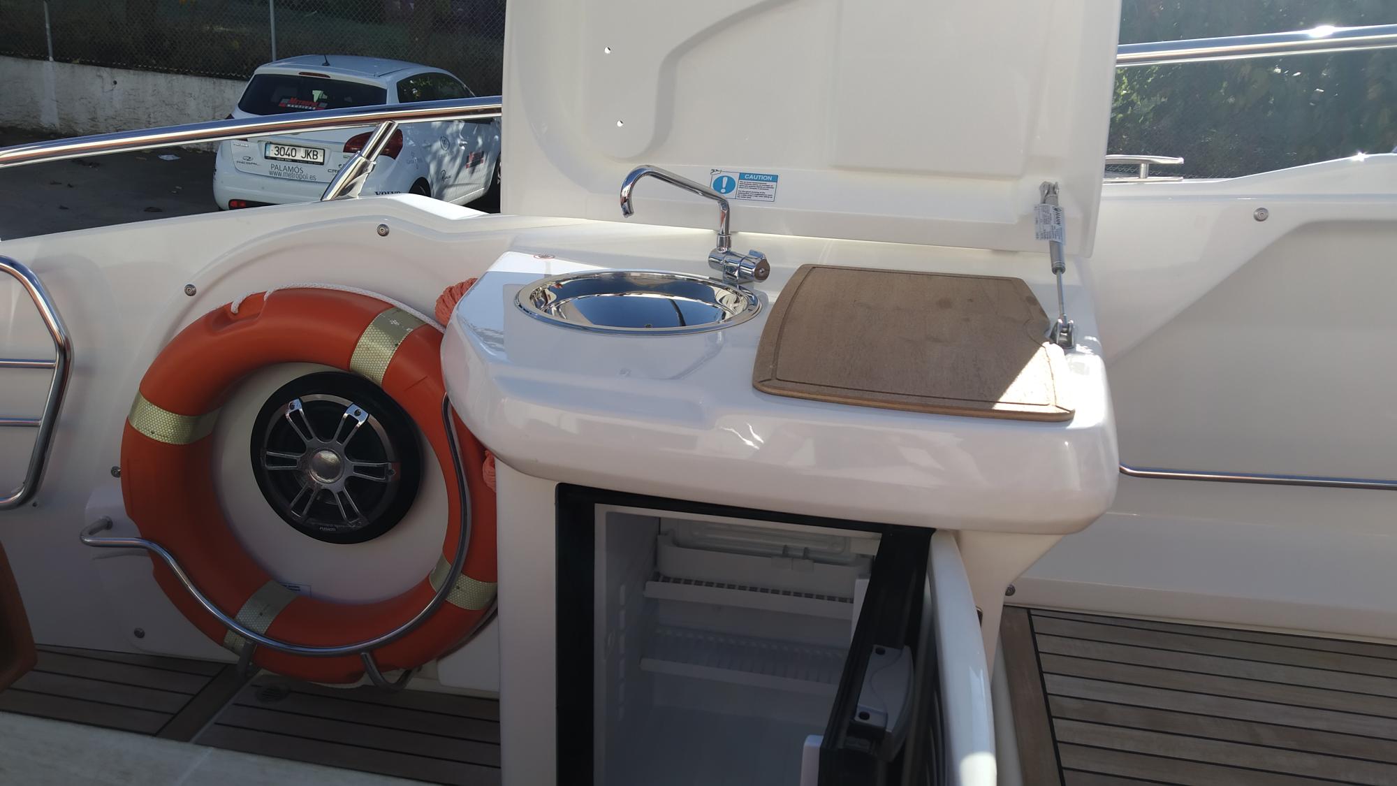Hélice de proa - Molinete eléctrico con ancla, cadena, mando a distancia y cuentametros cadena - GPS Garmin - Instalación eléctrica 230 V con cargador de baterías - Toma puerto con cable de conexión - Toldo parasol con arquillada en inox - Bañera en teka - Plataforma de baño en teka con escalera - Colchoneta de proa y funda - Lona de fondeo - Nevera en bañera - Horno microondas - Radio Fusion con Bluetooth/USB, altavoces en cabina y bañera, amplificador, subwoofer y mando a distancia en la bañera - Mesa interior convertible en cama - WC con depósito de aguas negras - Antifouling.Descripción embarcación