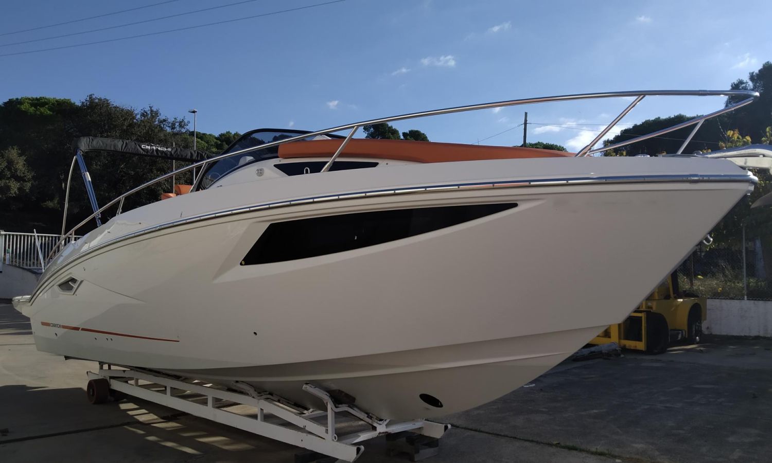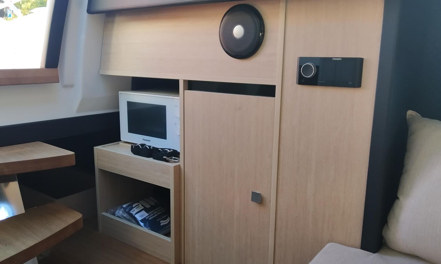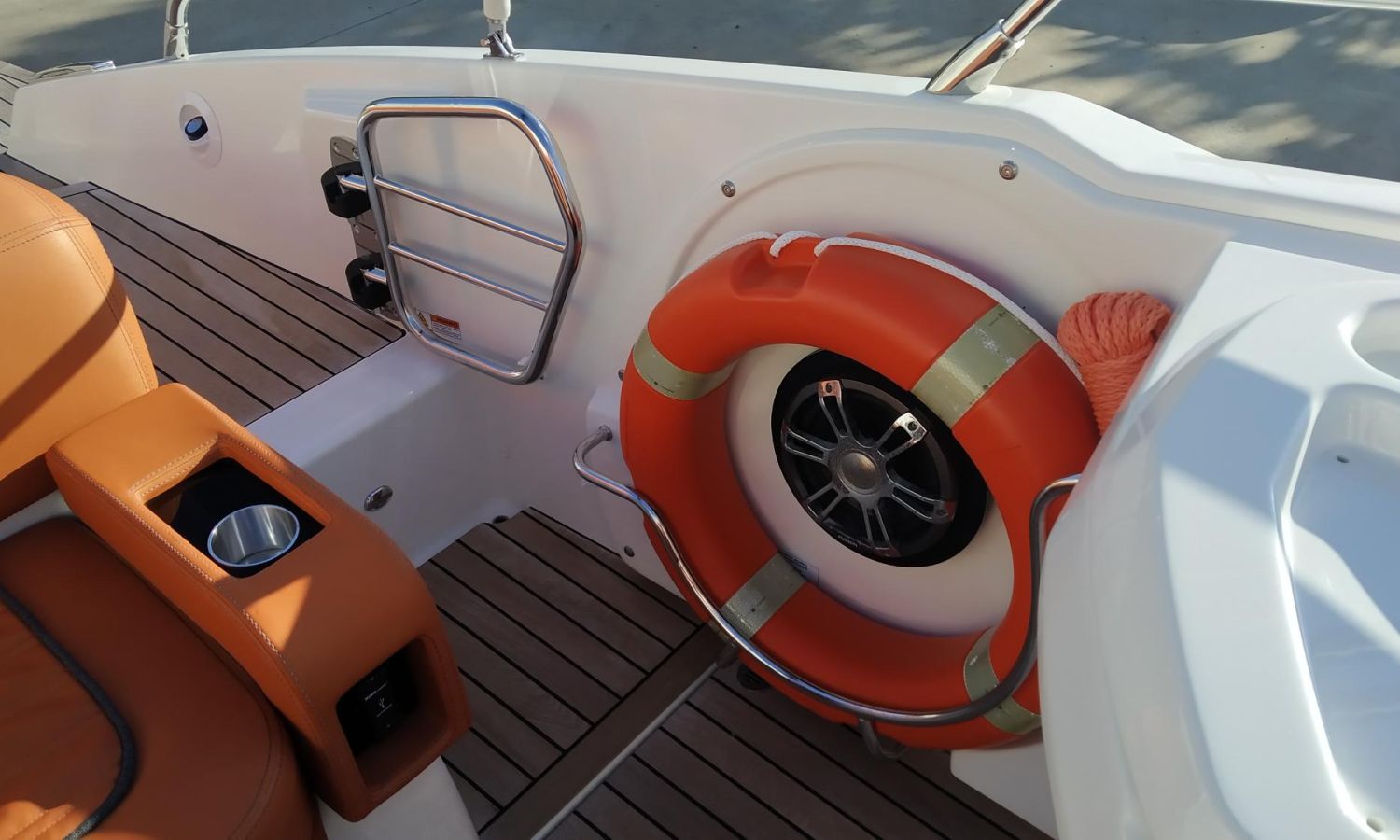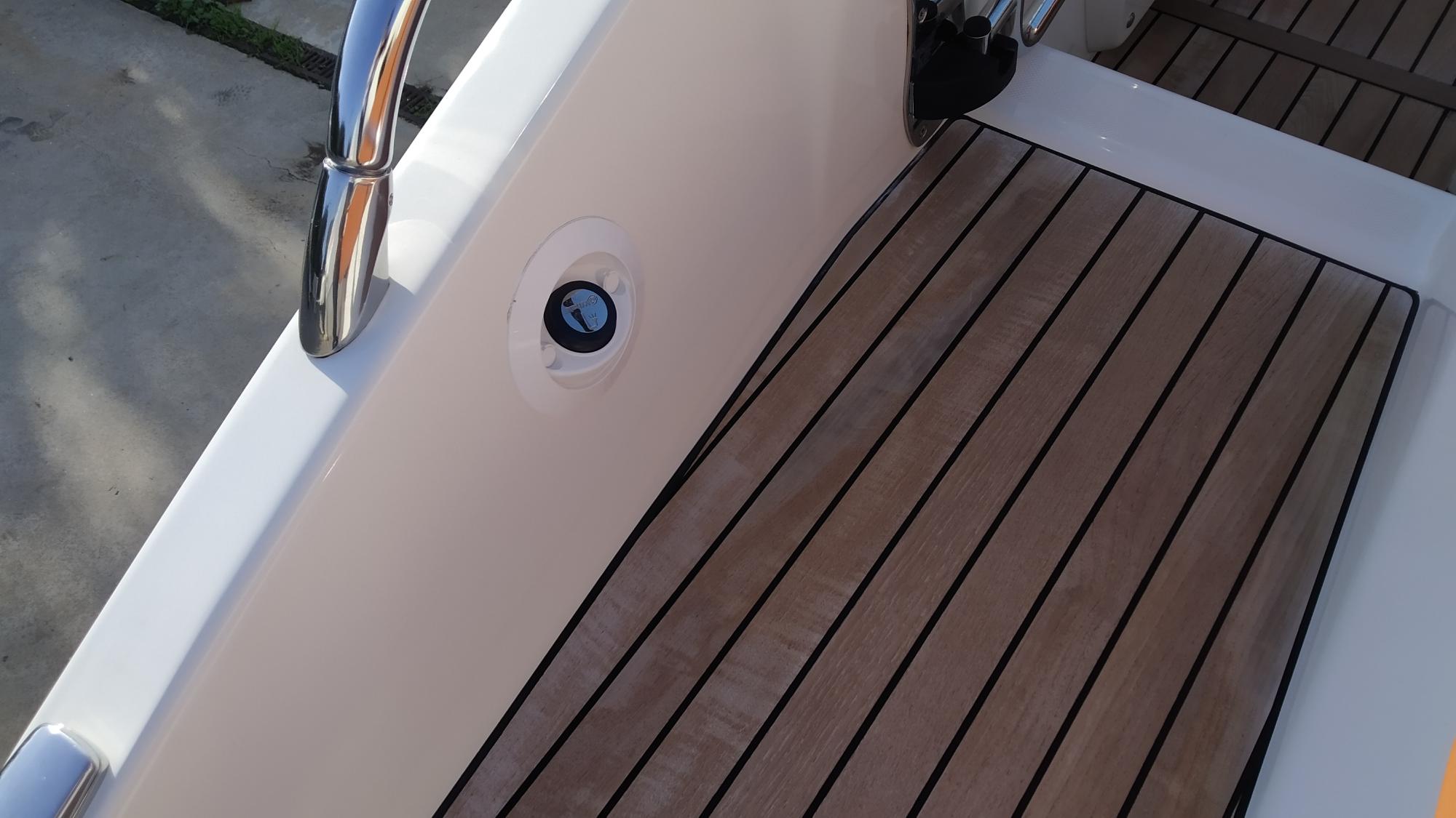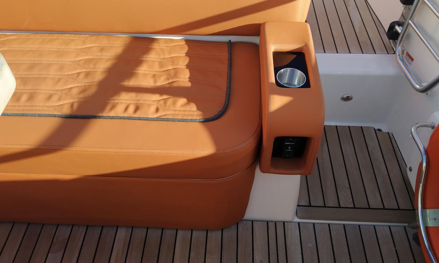 Hélice de proa - Molinete eléctrico con ancla, cadena, mando a distancia y cuentametros cadena - GPS Garmin - Instalación eléctrica 230 V con cargador de baterías - Toma puerto con cable de conexión - Toldo parasol con arquillada en inox - Bañera en teka - Plataforma de baño en teka con escalera - Colchoneta de proa y funda - Lona de fondeo - Nevera en bañera - Horno microondas - Radio Fusion con Bluetooth/USB, altavoces en cabina y bañera, amplificador, subwoofer y mando a distancia en la bañera - Mesa interior convertible en cama - WC con depósito de aguas negras - Antifouling.Descripción embarcación