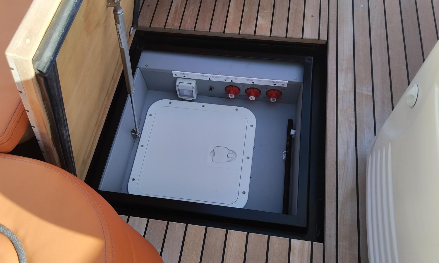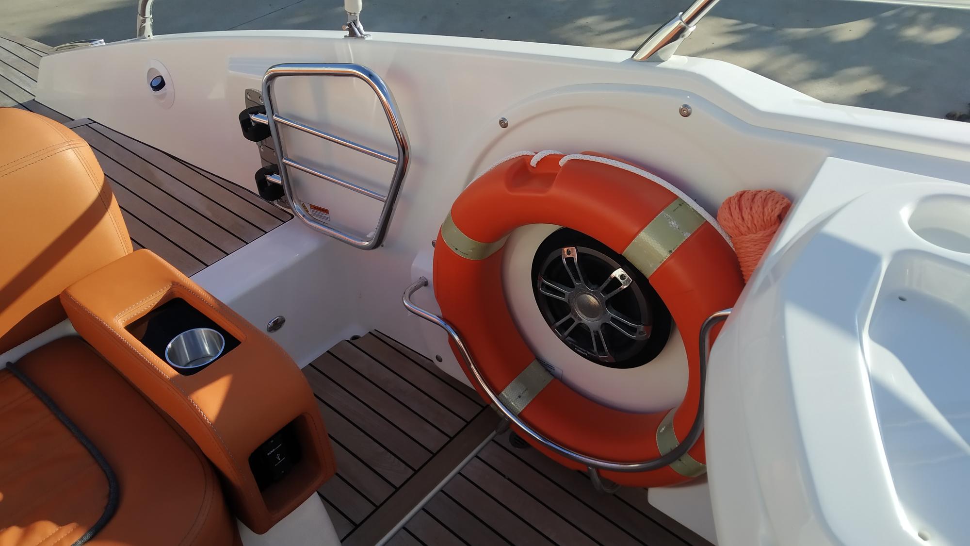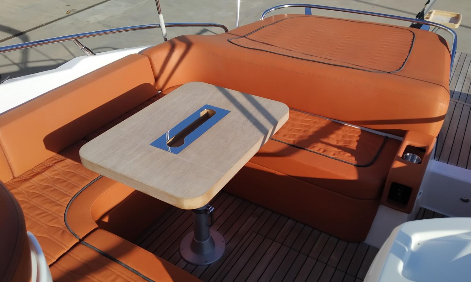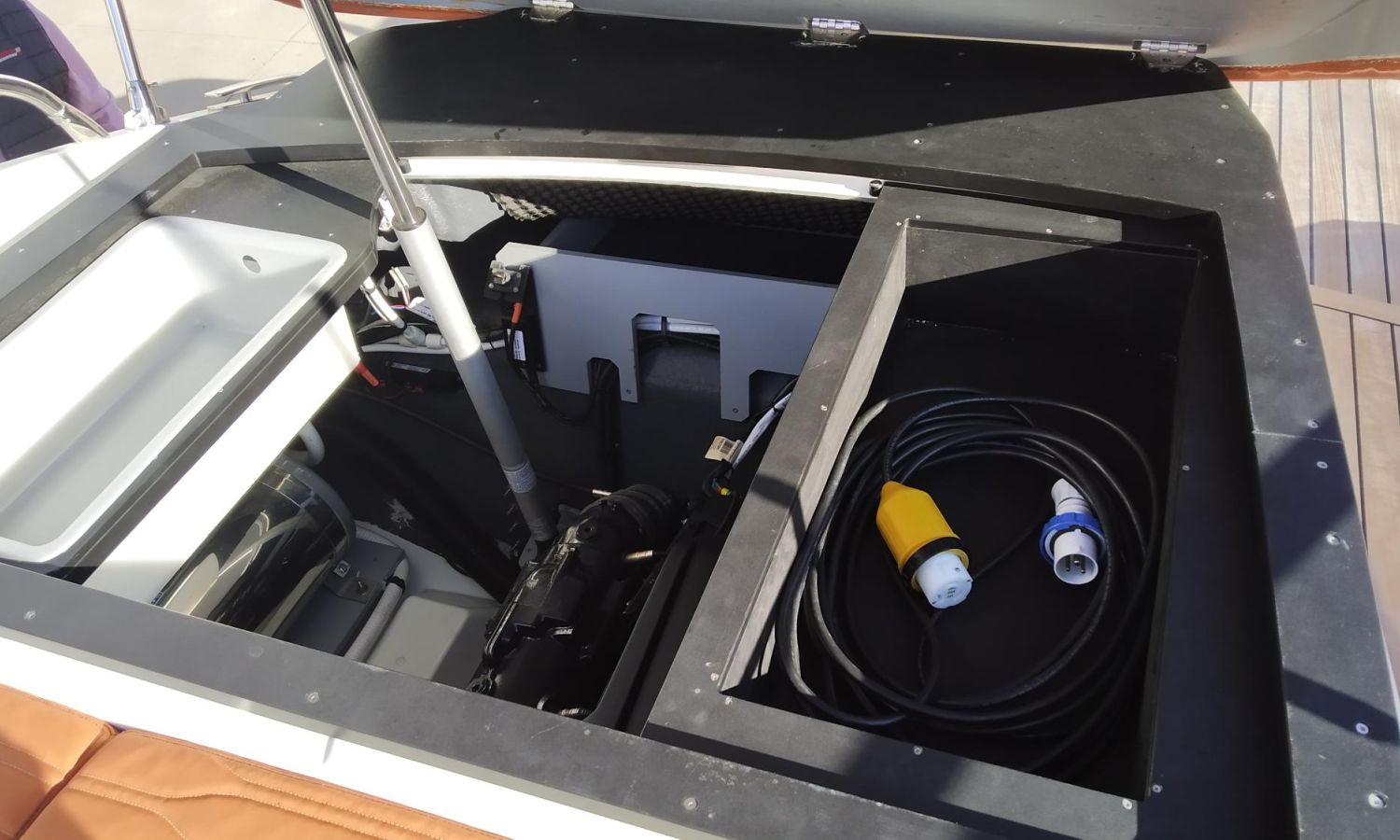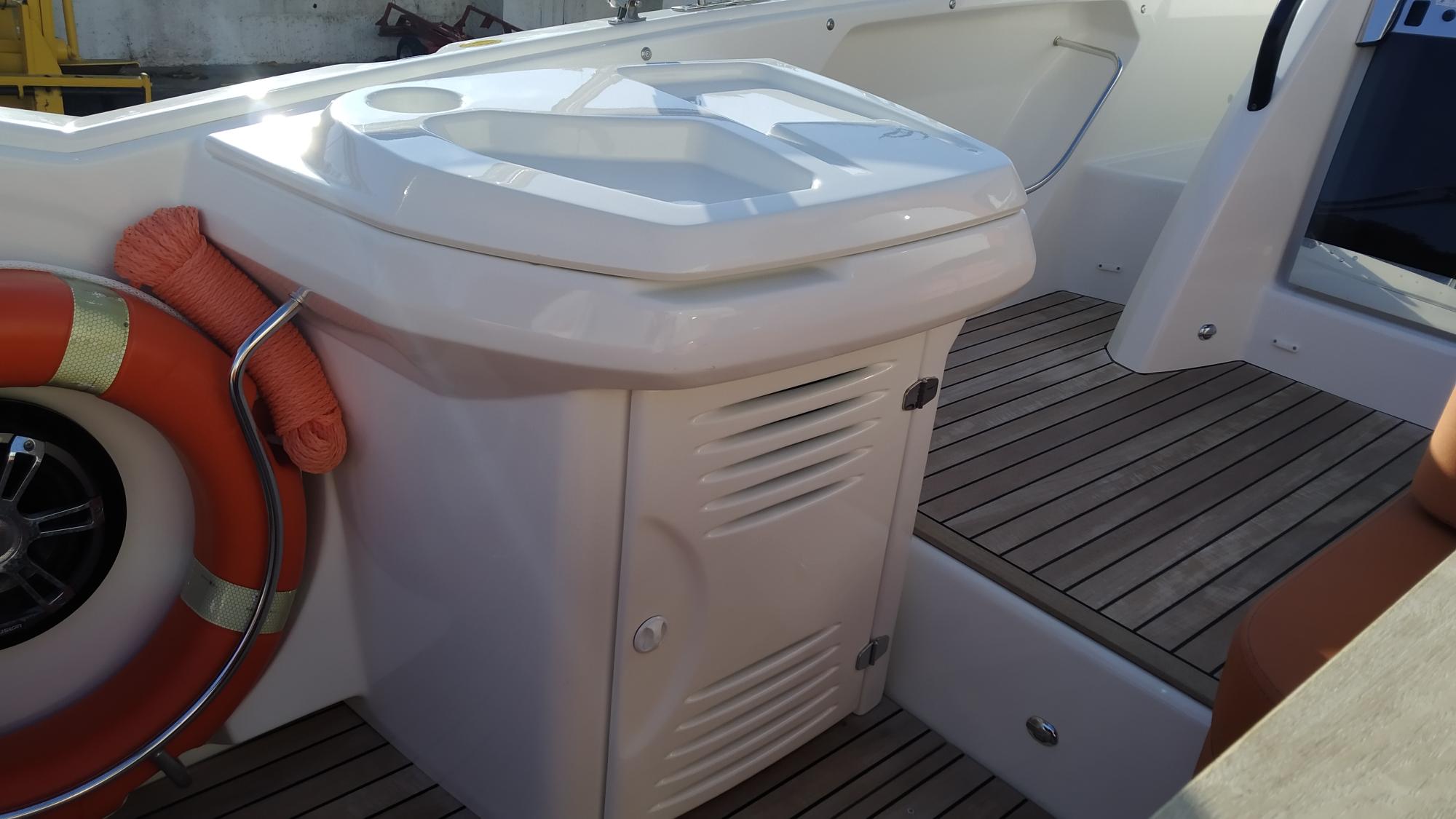 Hélice de proa - Molinete eléctrico con ancla, cadena, mando a distancia y cuentametros cadena - GPS Garmin - Instalación eléctrica 230 V con cargador de baterías - Toma puerto con cable de conexión - Toldo parasol con arquillada en inox - Bañera en teka - Plataforma de baño en teka con escalera - Colchoneta de proa y funda - Lona de fondeo - Nevera en bañera - Horno microondas - Radio Fusion con Bluetooth/USB, altavoces en cabina y bañera, amplificador, subwoofer y mando a distancia en la bañera - Mesa interior convertible en cama - WC con depósito de aguas negras - Antifouling.Descripción embarcación