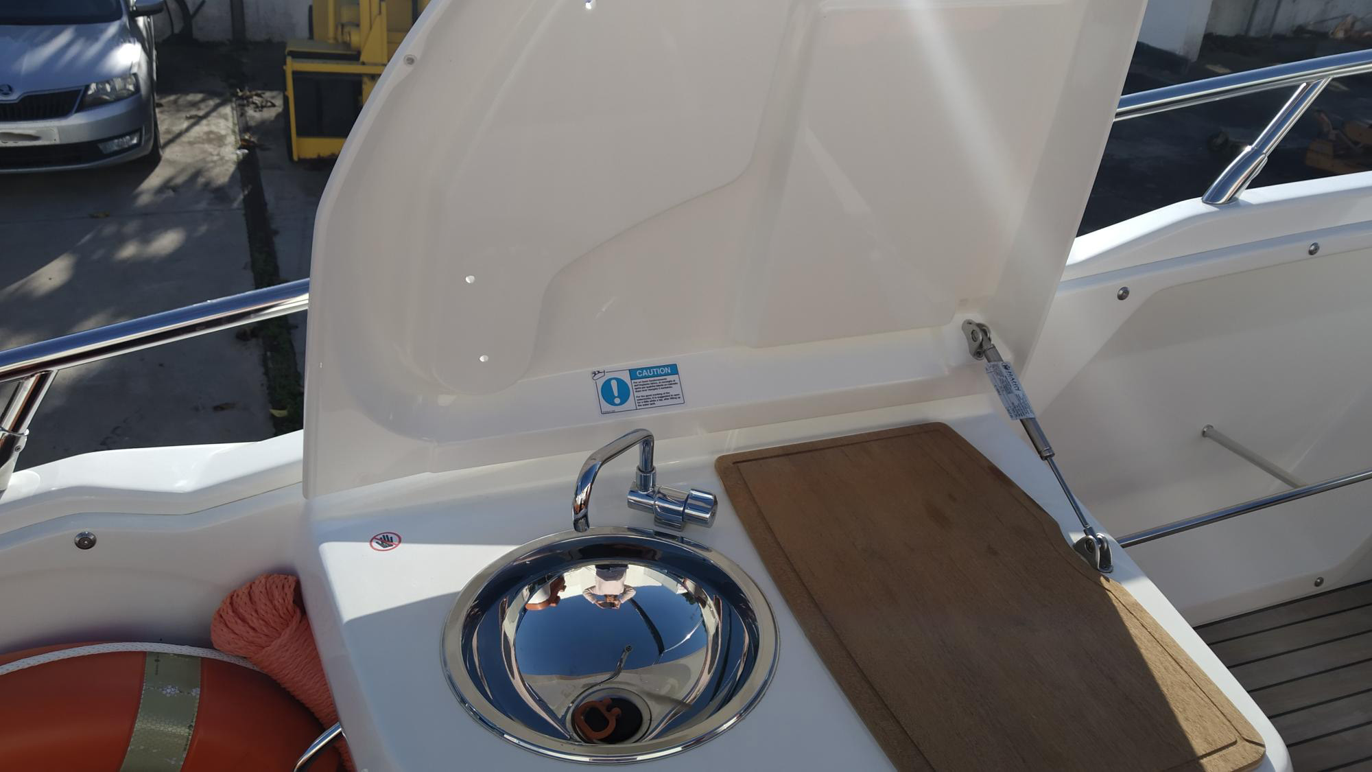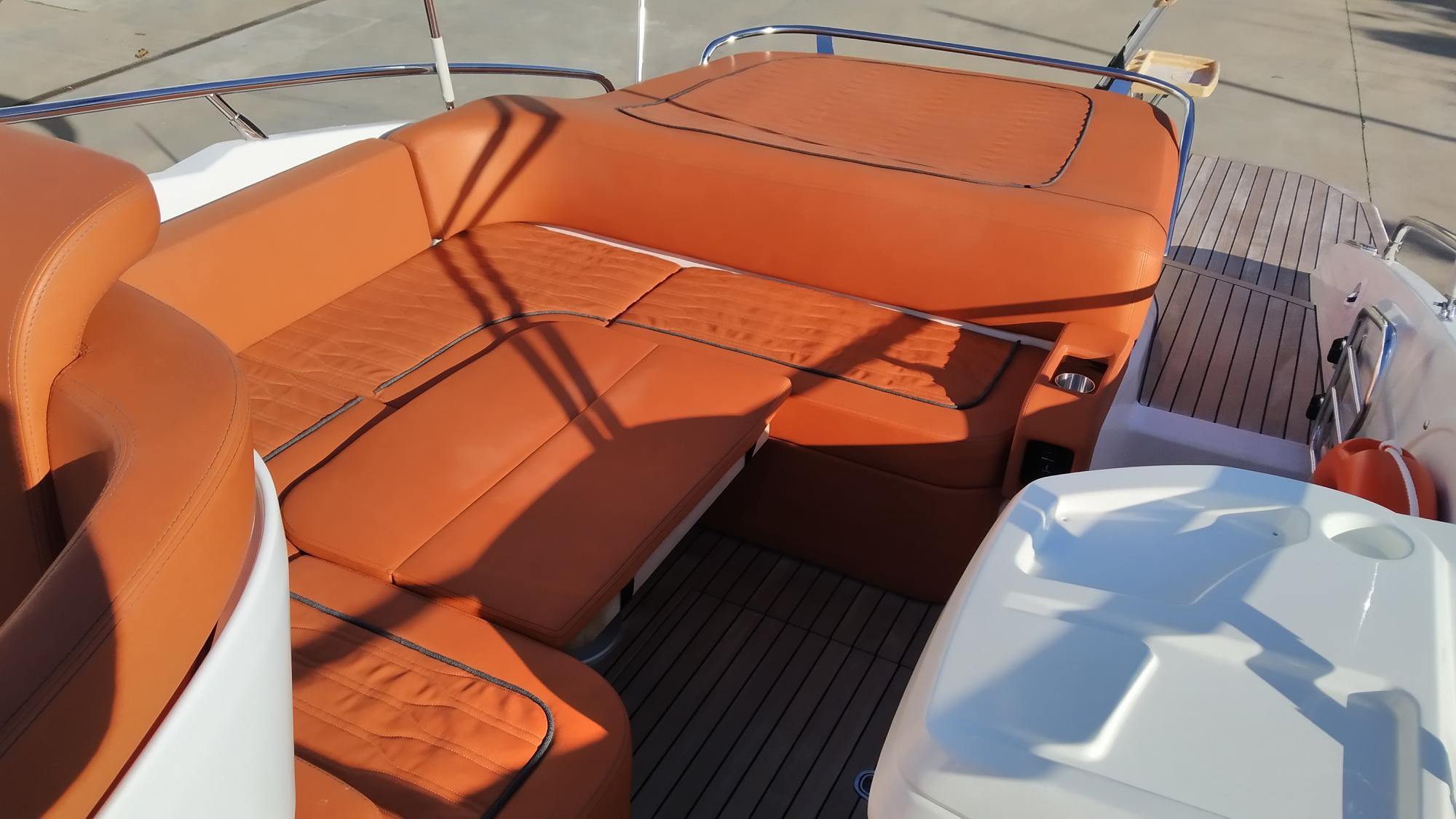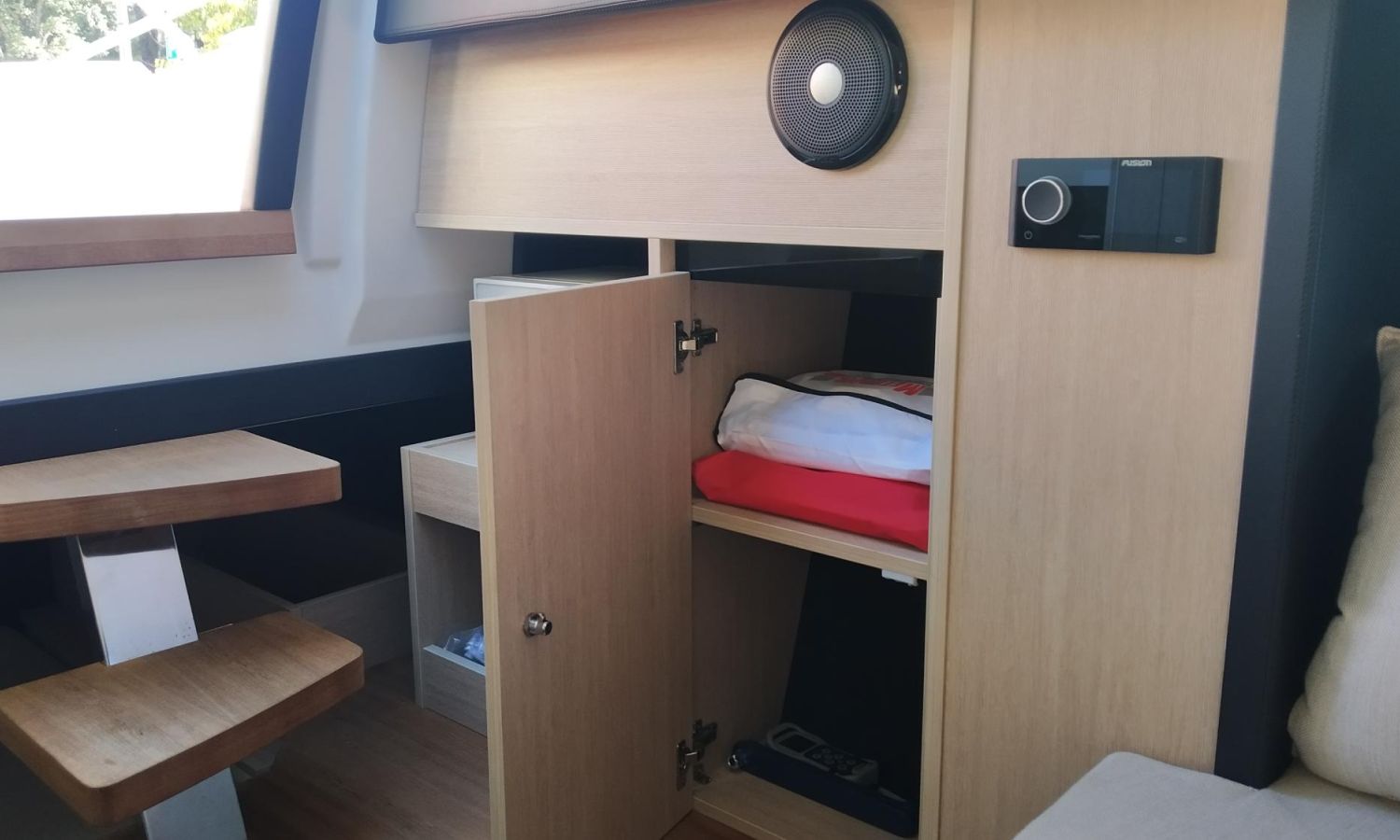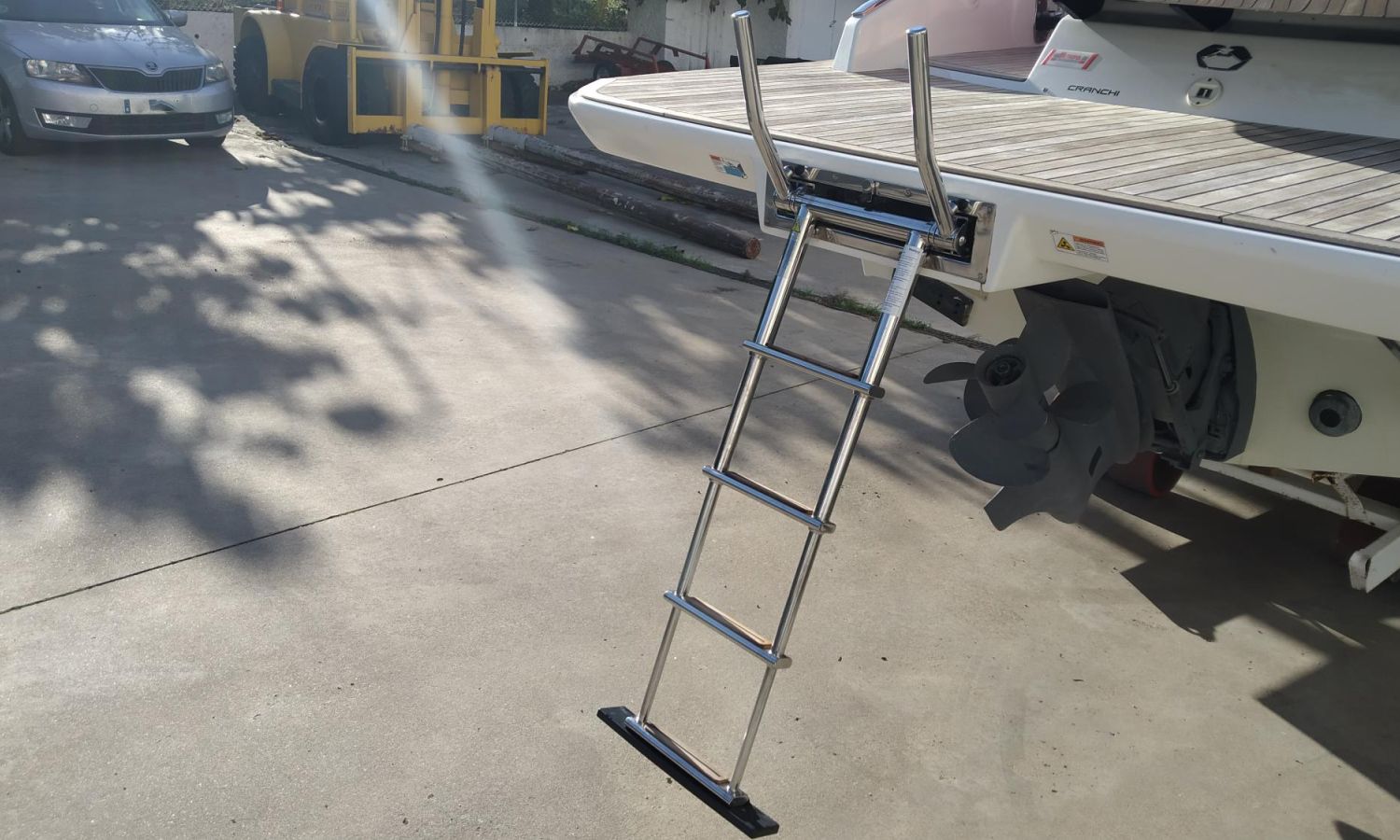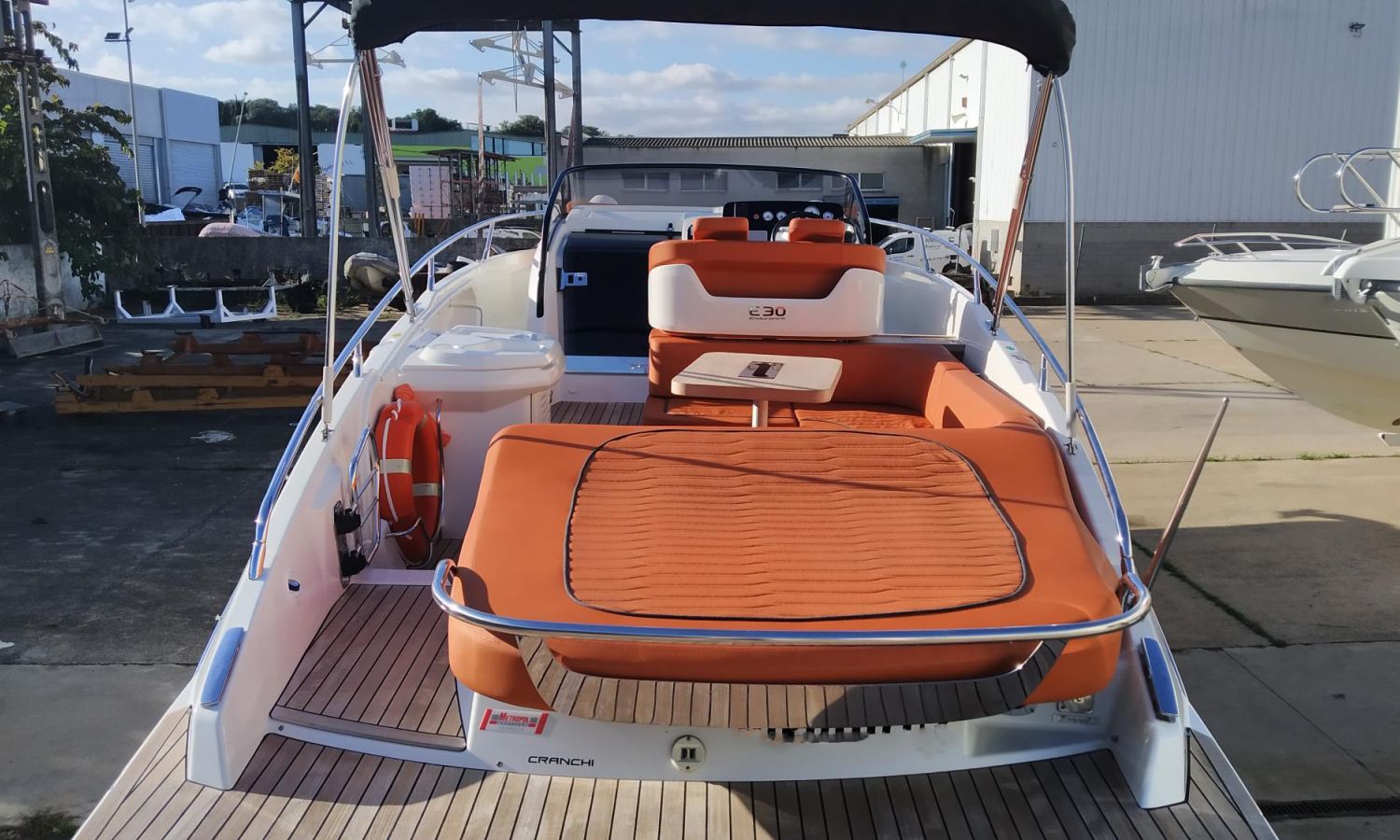 Hélice de proa - Molinete eléctrico con ancla, cadena, mando a distancia y cuentametros cadena - GPS Garmin - Instalación eléctrica 230 V con cargador de baterías - Toma puerto con cable de conexión - Toldo parasol con arquillada en inox - Bañera en teka - Plataforma de baño en teka con escalera - Colchoneta de proa y funda - Lona de fondeo - Nevera en bañera - Horno microondas - Radio Fusion con Bluetooth/USB, altavoces en cabina y bañera, amplificador, subwoofer y mando a distancia en la bañera - Mesa interior convertible en cama - WC con depósito de aguas negras - Antifouling.Descripción embarcación