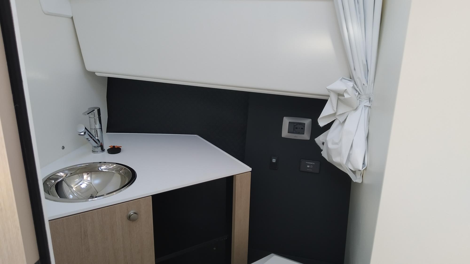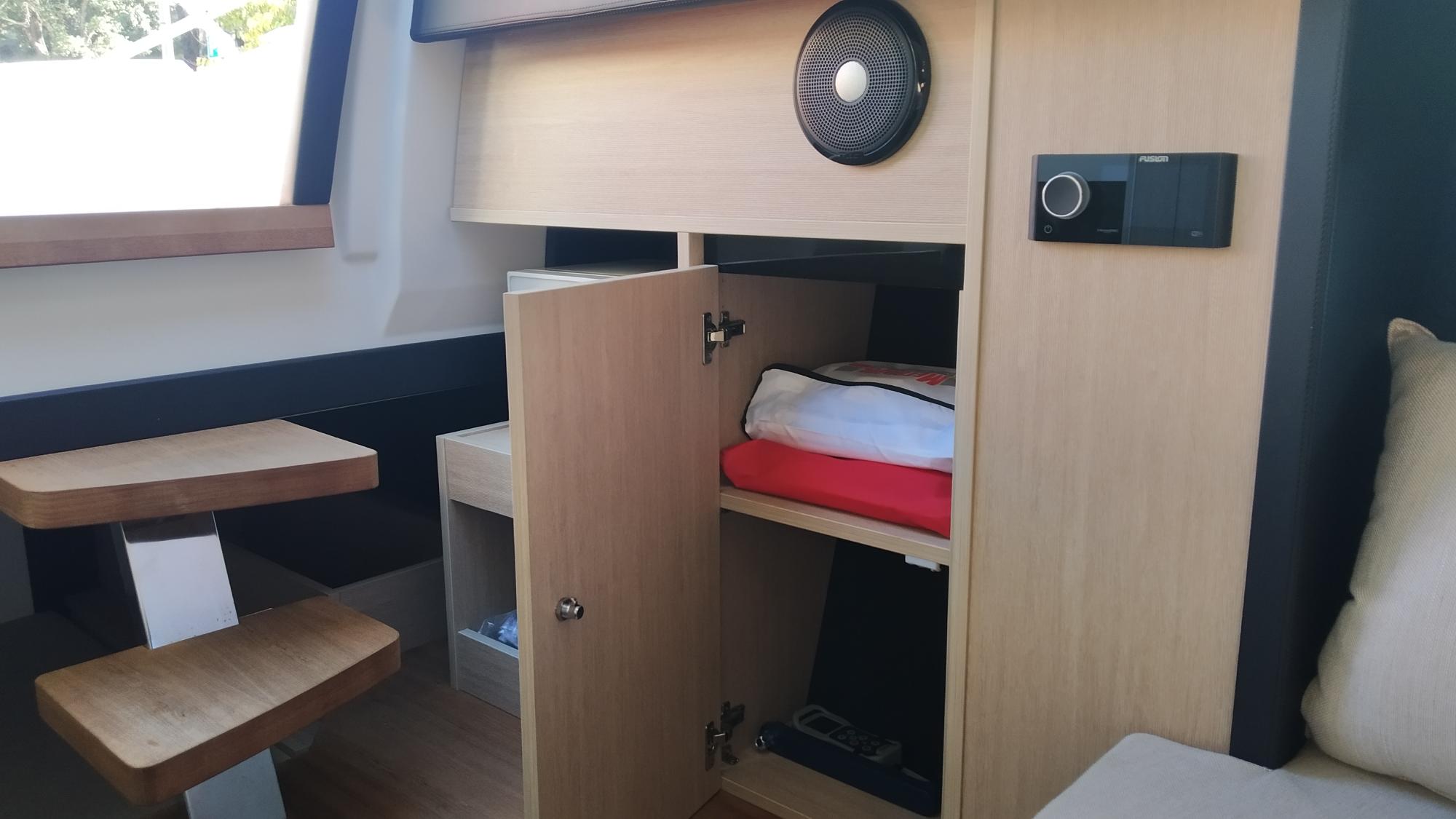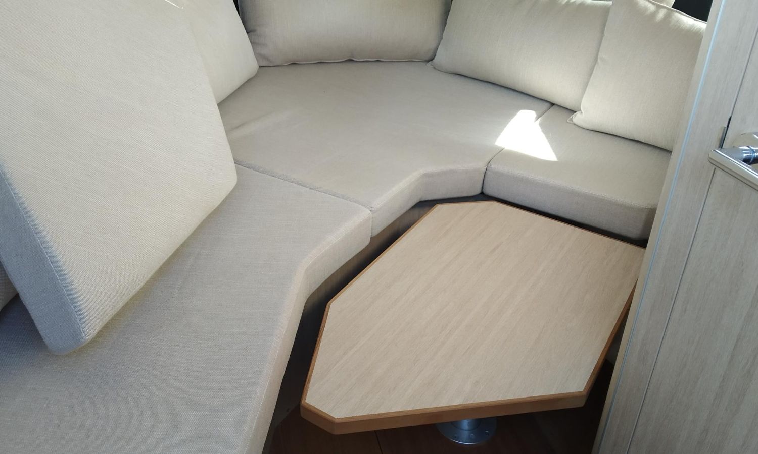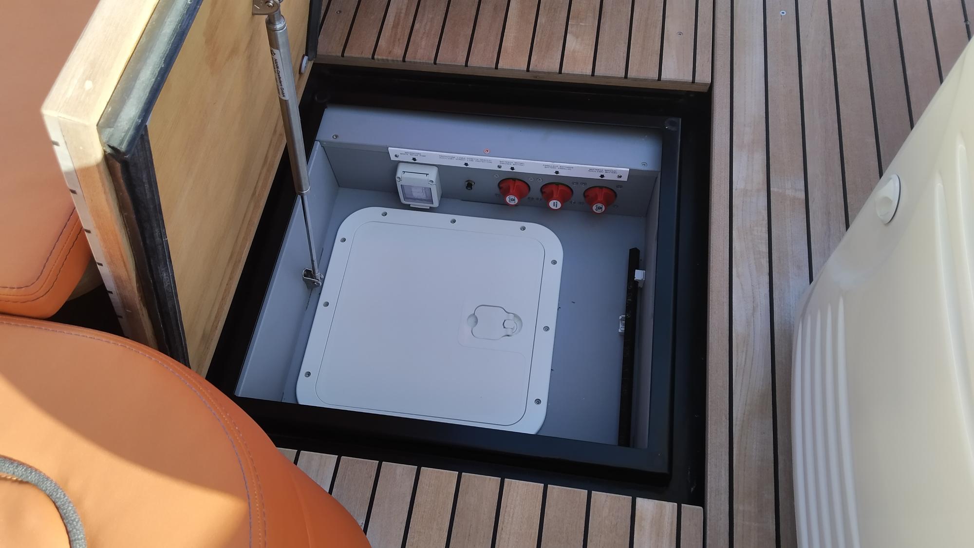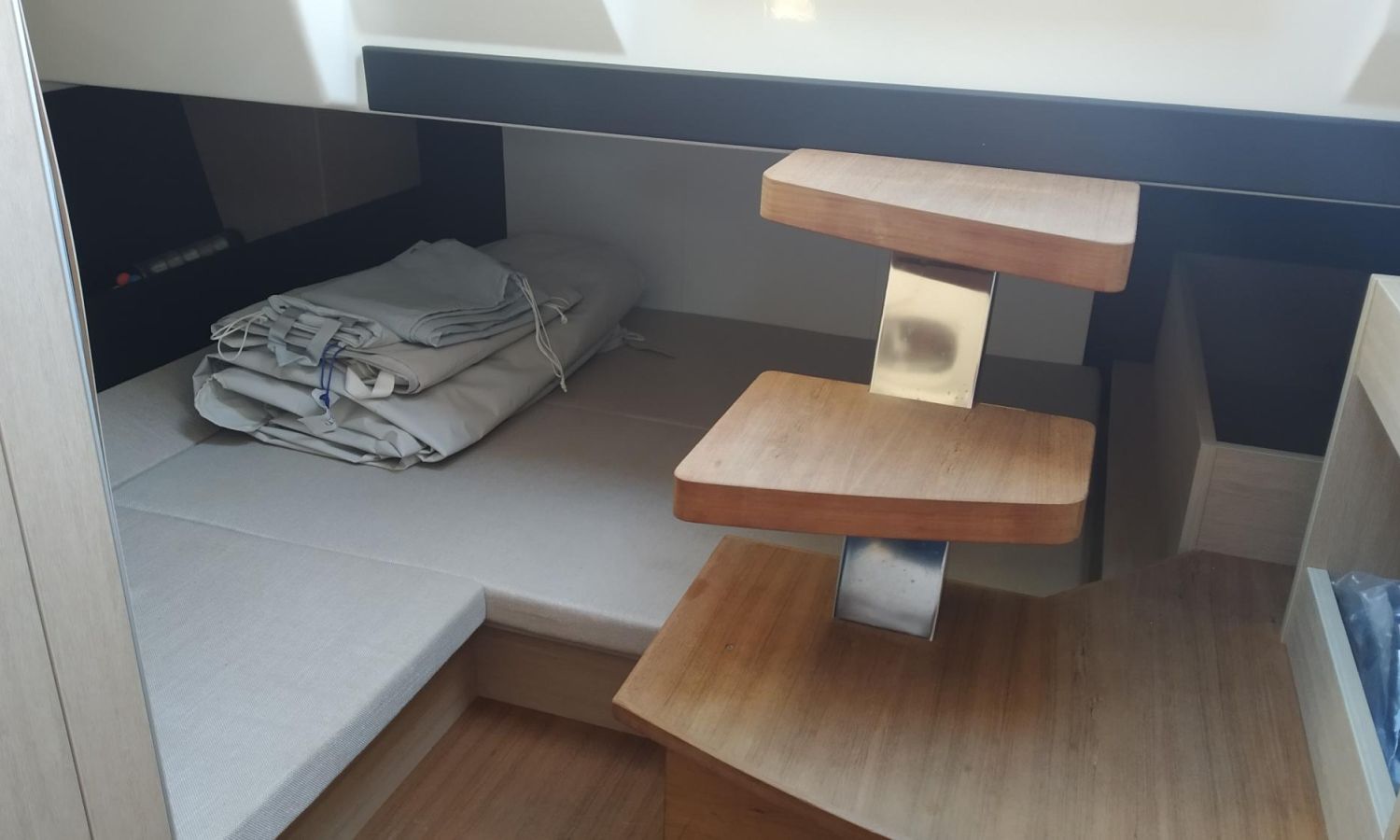 Hélice de proa - Molinete eléctrico con ancla, cadena, mando a distancia y cuentametros cadena - GPS Garmin - Instalación eléctrica 230 V con cargador de baterías - Toma puerto con cable de conexión - Toldo parasol con arquillada en inox - Bañera en teka - Plataforma de baño en teka con escalera - Colchoneta de proa y funda - Lona de fondeo - Nevera en bañera - Horno microondas - Radio Fusion con Bluetooth/USB, altavoces en cabina y bañera, amplificador, subwoofer y mando a distancia en la bañera - Mesa interior convertible en cama - WC con depósito de aguas negras - Antifouling.Descripción embarcación