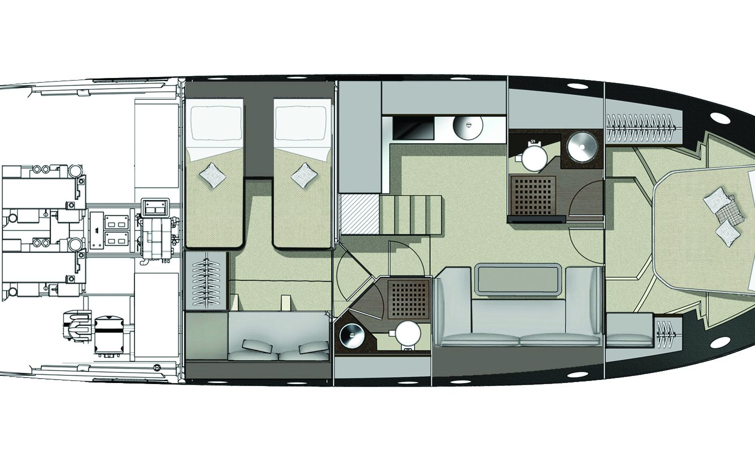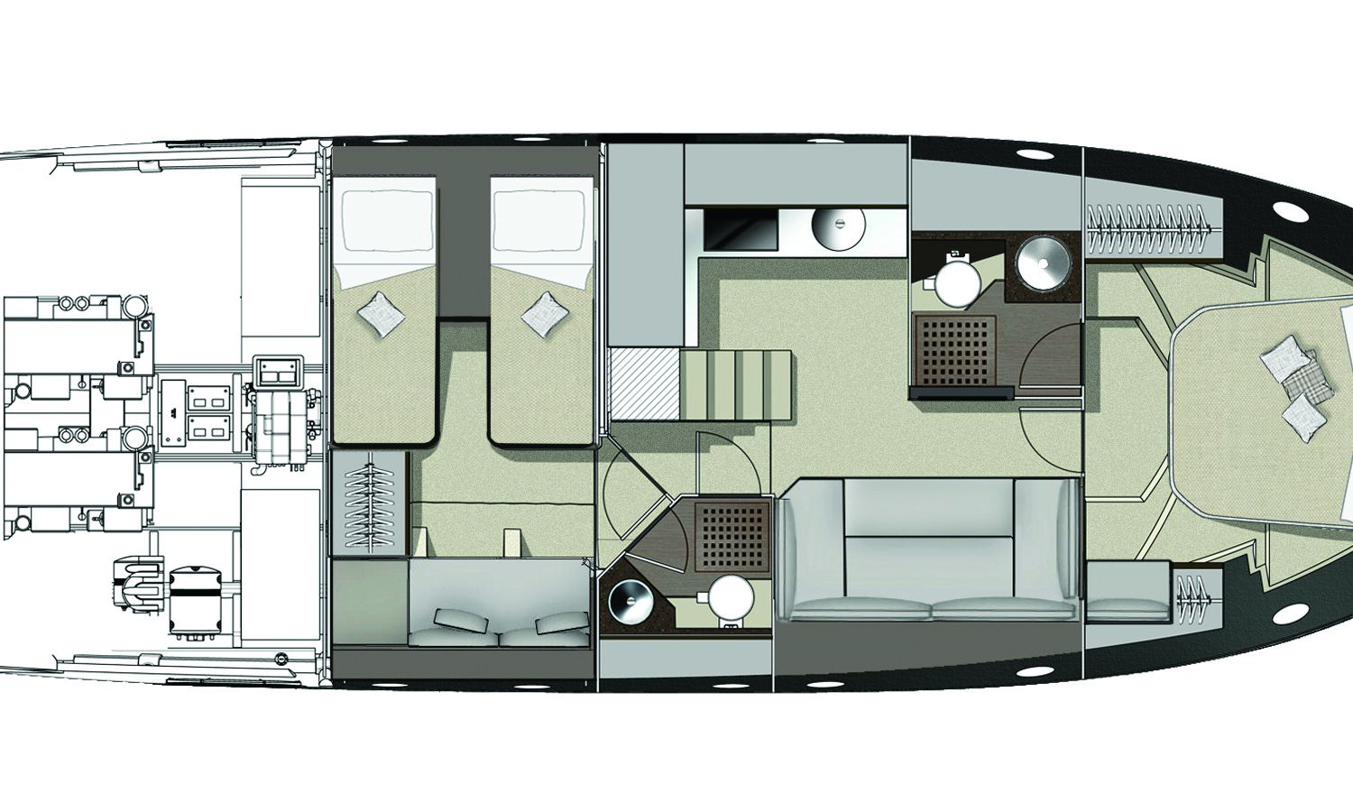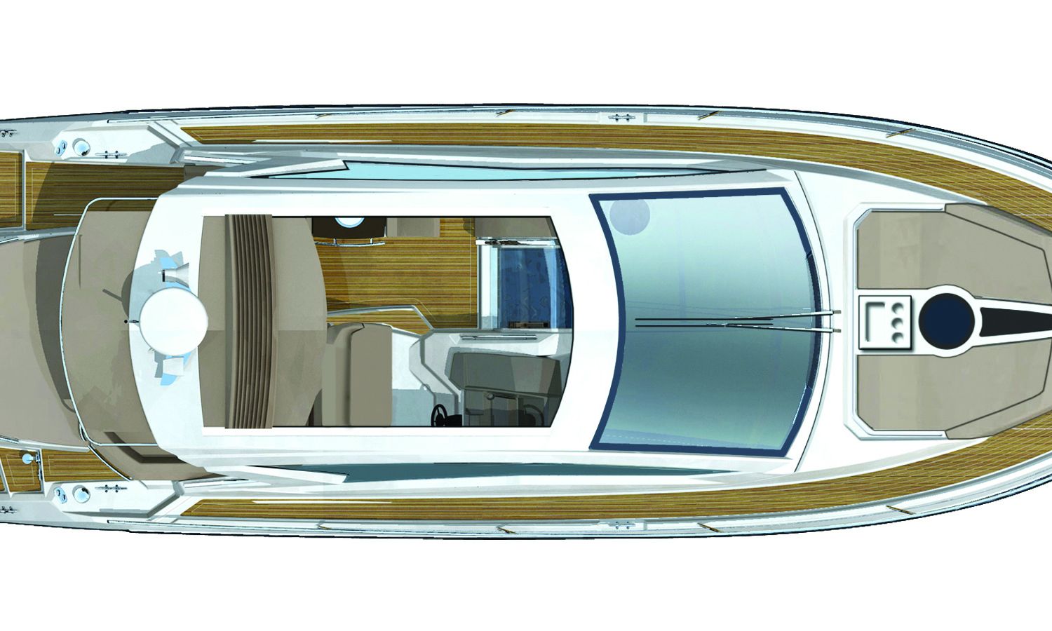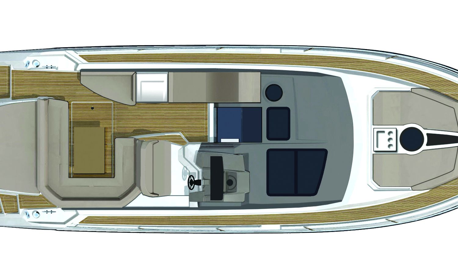 Embarcación con hard top y techo corredero de tela. Los grandes espacios interiores que incluyen 2 camarotes, 2 baños, una cocina y un salón proporcionan una inmediata sensación de confort y bienestar. La bañera tiene una capacidad excepcional, con 2 plazas en el puente de mando, un diván a babor, un amplio sofá, un mueble-bar y un gran solárium de popa bajo el cual está ubicado el garaje para la neumática auxiliar.