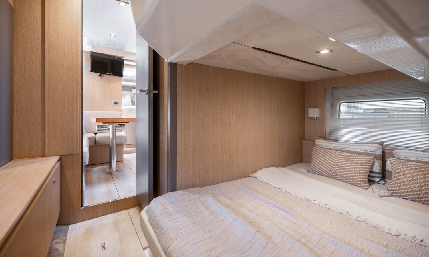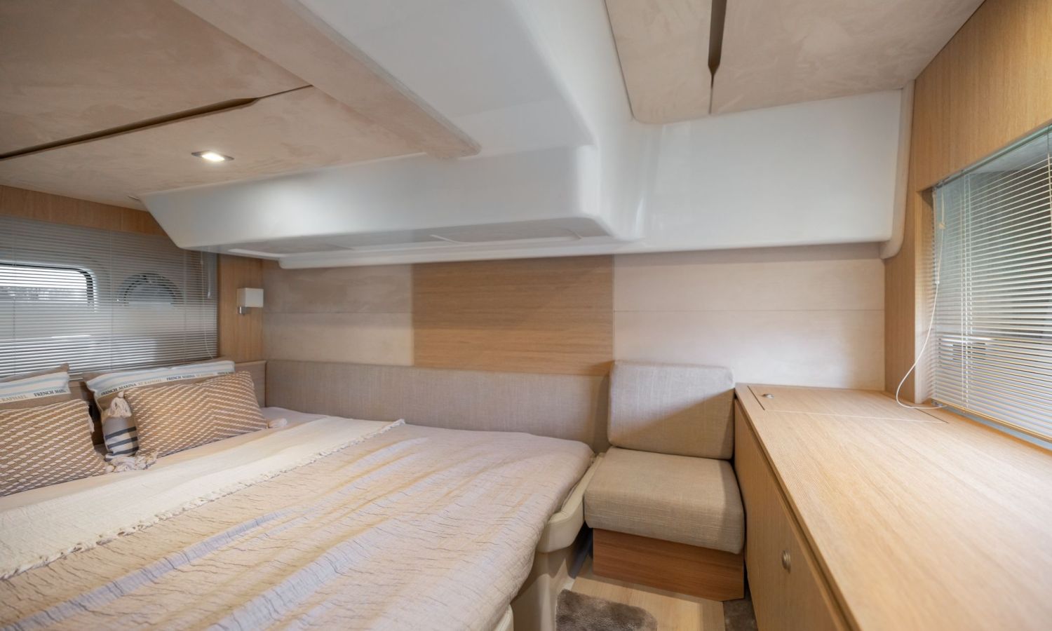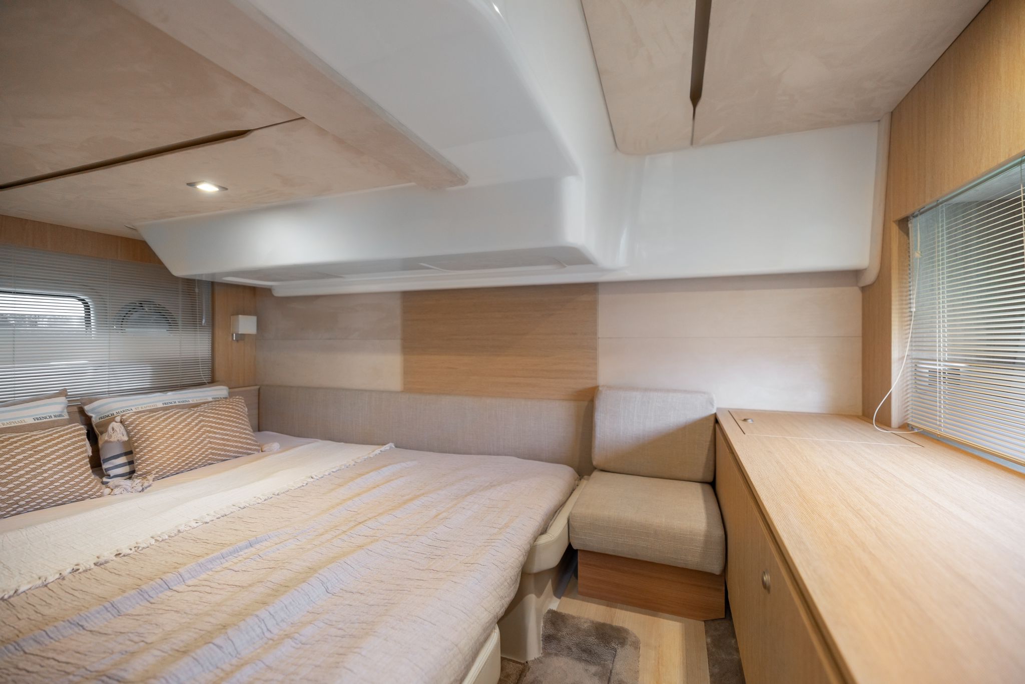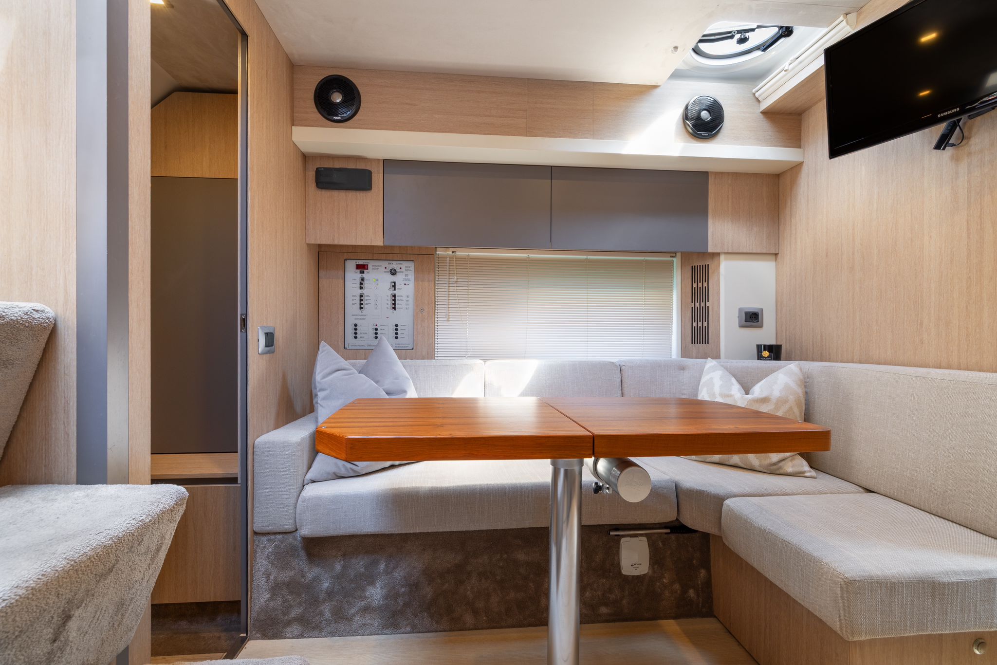 Toldo bimini - Passarela - Ducha de agua caliente - Dos neveras - Picnic de teca - Mesa - Cargador de baterias 220 v. - Tv - Inodoro marino - Ducha con manpara - Suelo de cubierta de teca - Equipo de audio - 2 camarotes - Cubierta para tomar el sol en proa y popa - Joystick - Gps/Plotter/Sonda - Piloto automático - Molinete de ancla eléctrico - Antifouling.Descripción embarcación