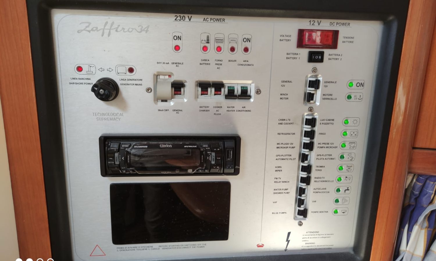 Lona de fondeo - Capota de sol - WC electrico con depósito aguas negras - Radio VHF - GPS+Plotter - Radar - Generador - Aire acondicionado - Pasarela hidraulica - Cargador de baterías - Hélice de proa - Frigo interior y exterior - Horno microondas - Plataforma de baño en teka - Solárium proa - Toma corriente puerto - Molinete eléctrico con ancla y cadena .Descripción embarcación