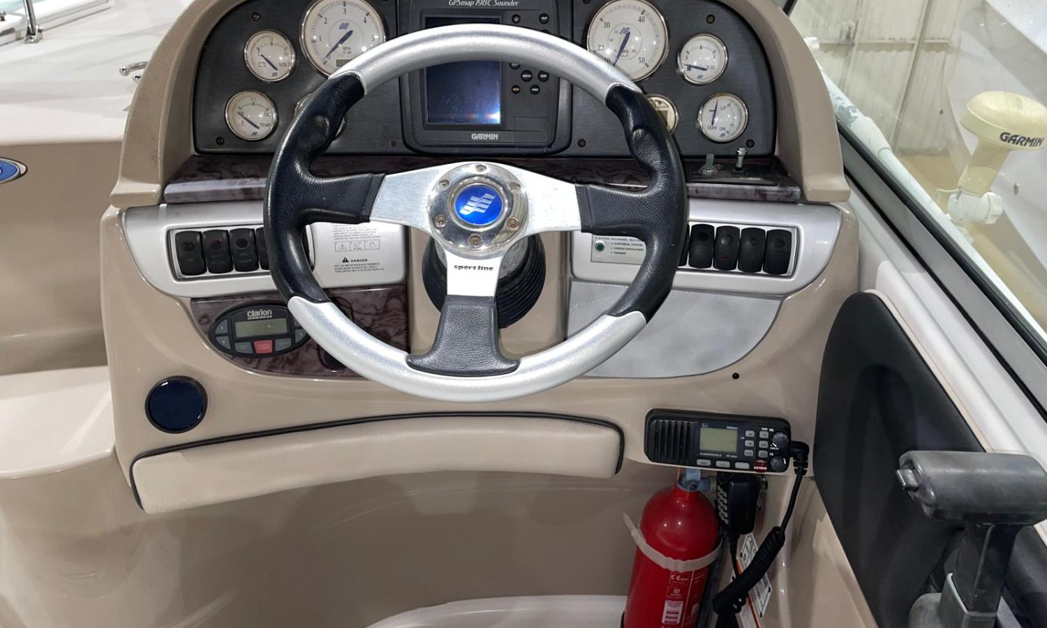 Toldo parasol - Lona de fondeo - Plataforma de baño con escalera - Ducha en la bañera - Mesa en la bañera - Fregadero - Nevera en la bañera - Solárium de proa - Toma de puerto - Cargador de baterias - Gps/Plotter/Sonda - VHF - Compás - Equipo de audio - 2 Cabinas - Nevera 12 V.- Cocina a gas - Microondas - Molinete de ancla eléctrico - Wc marino con depósito de aguas negras - Antifouling.Descripción embarcación