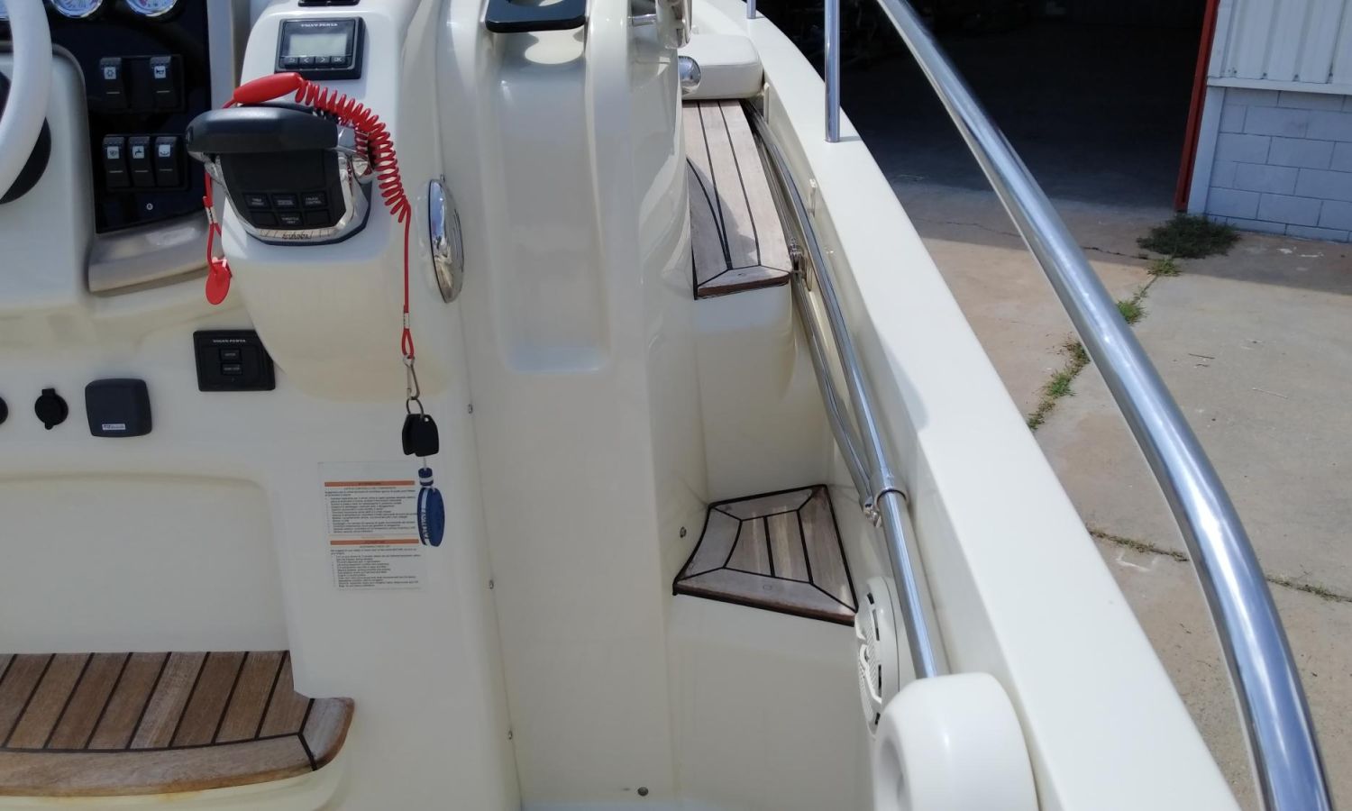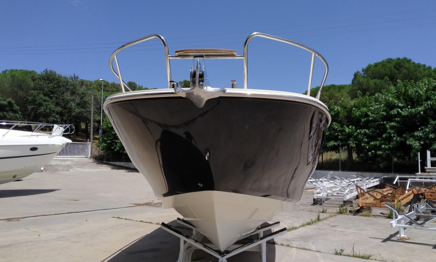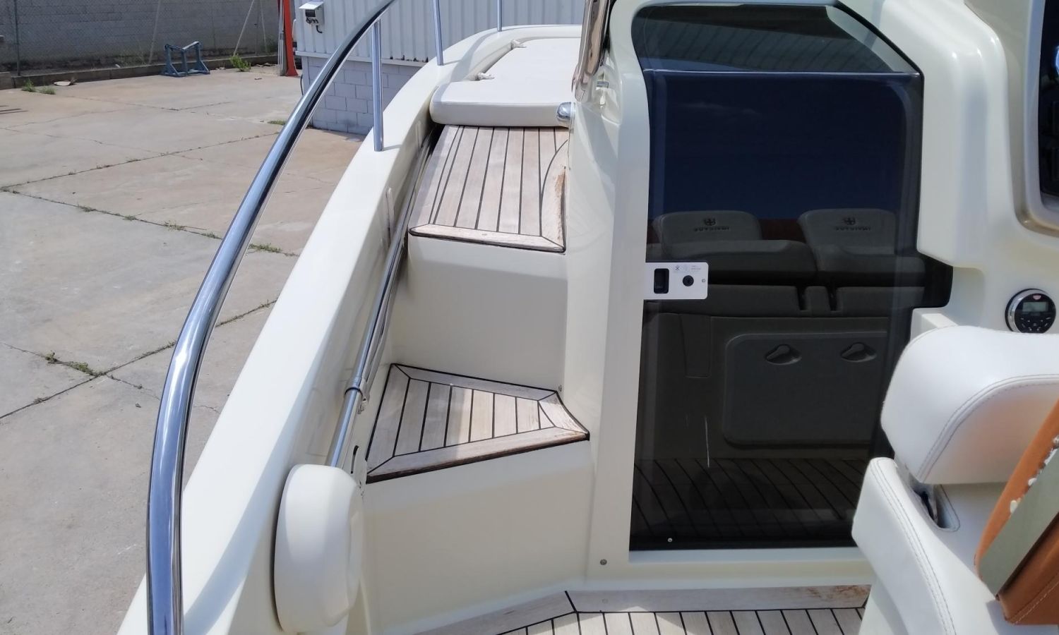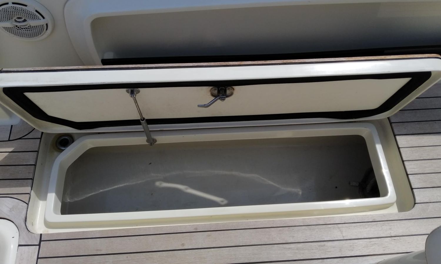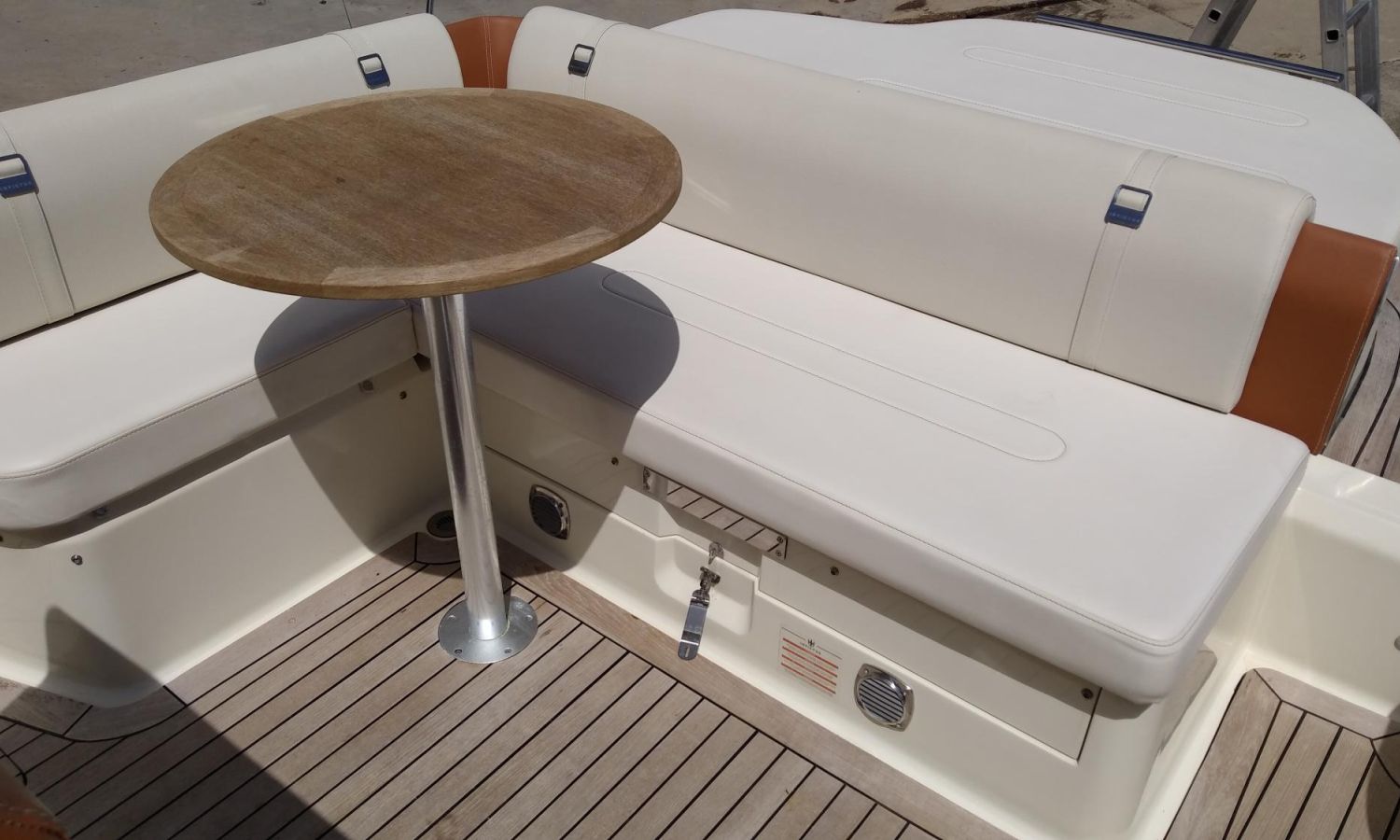 Toldo parasol - Solárium de popa - Colchonetas solárium de proa - Ducha a popa - Mesa de teca en bañera - Plataforma de baño en teca con escalera - Bañera en teca - Molinete eléctrico con ancla y cadena - Hélice de proa - GPS - Brújula - Nevera en la cabina - WC con lavabo y depósito de aguas negras.Descripción embarcación