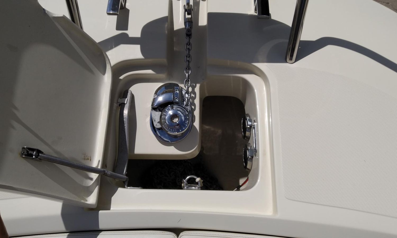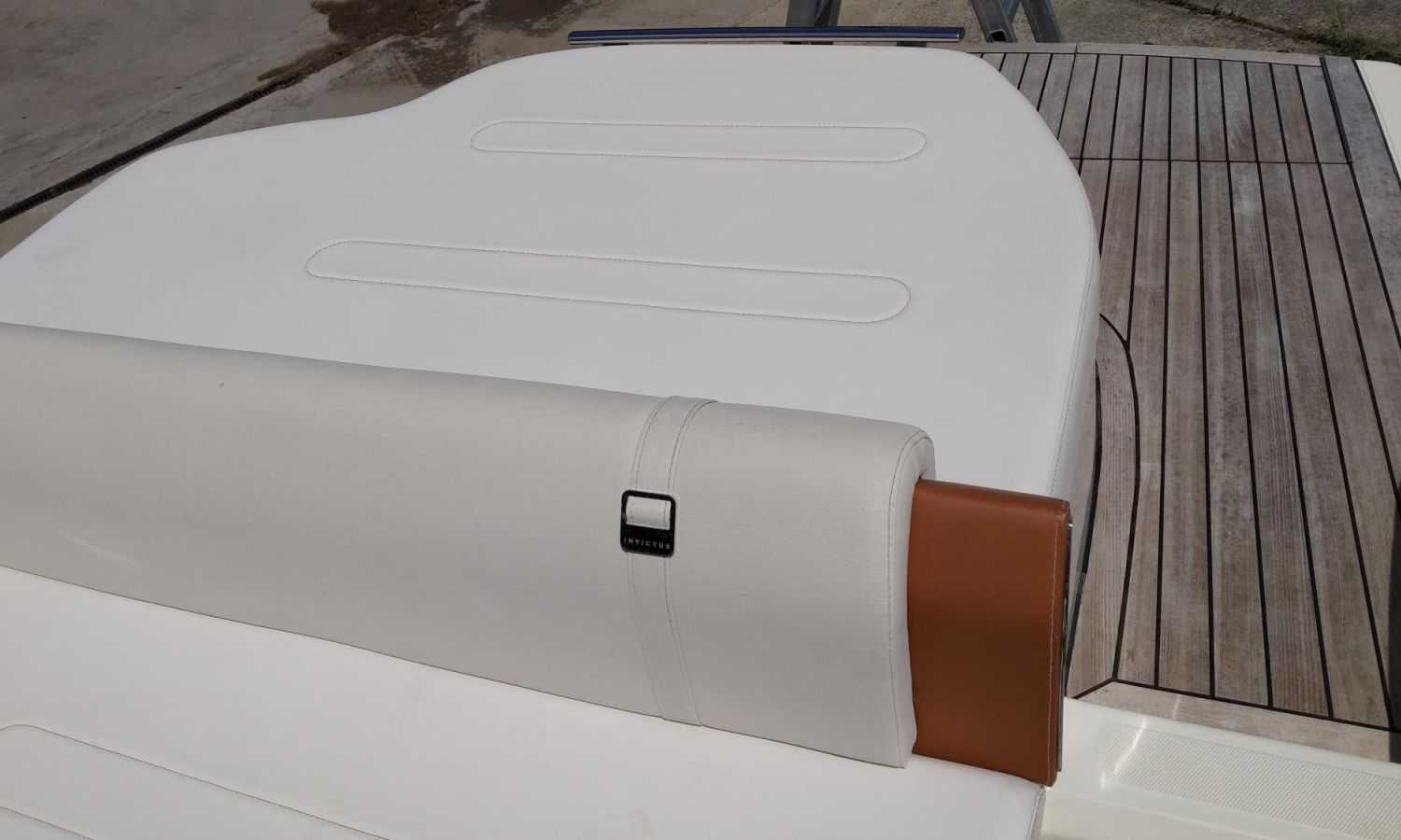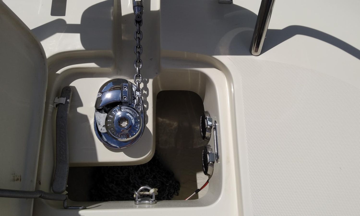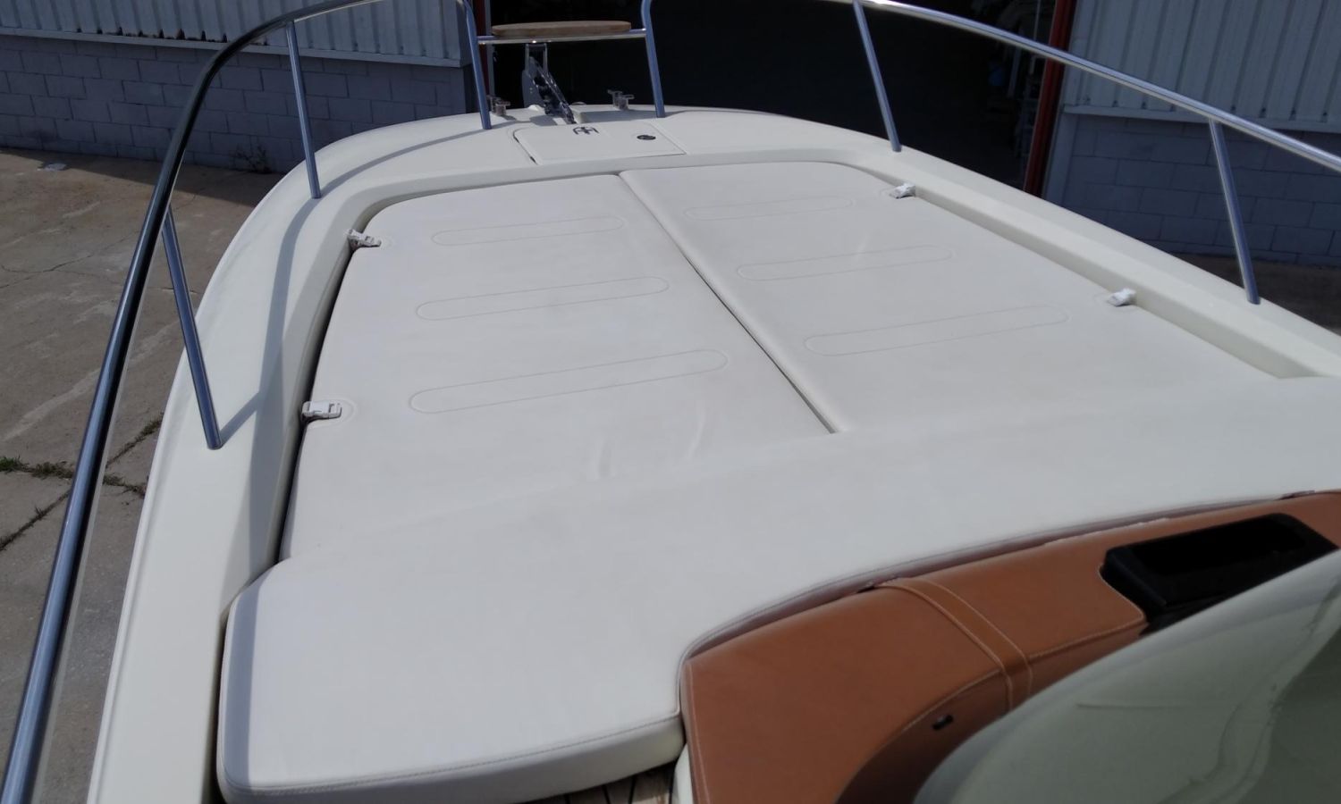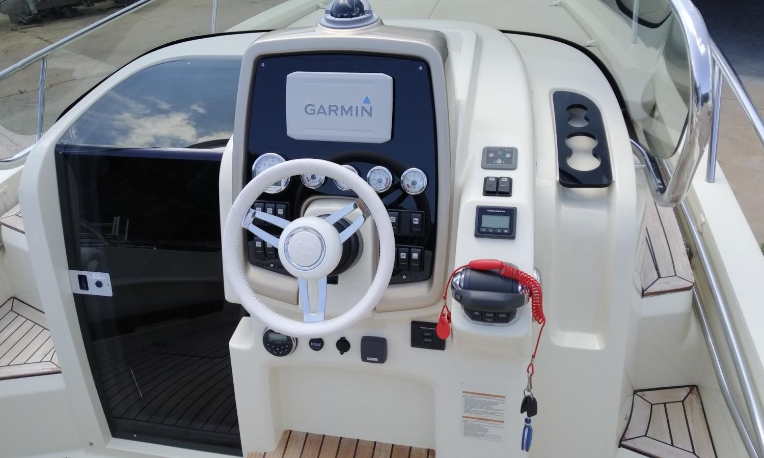 Toldo parasol - Solárium de popa - Colchonetas solárium de proa - Ducha a popa - Mesa de teca en bañera - Plataforma de baño en teca con escalera - Bañera en teca - Molinete eléctrico con ancla y cadena - Hélice de proa - GPS - Brújula - Nevera en la cabina - WC con lavabo y depósito de aguas negras.Descripción embarcación