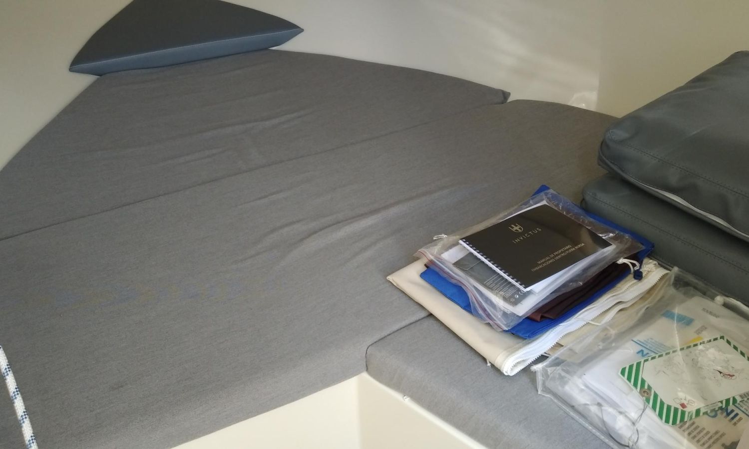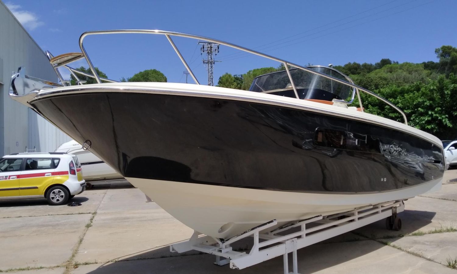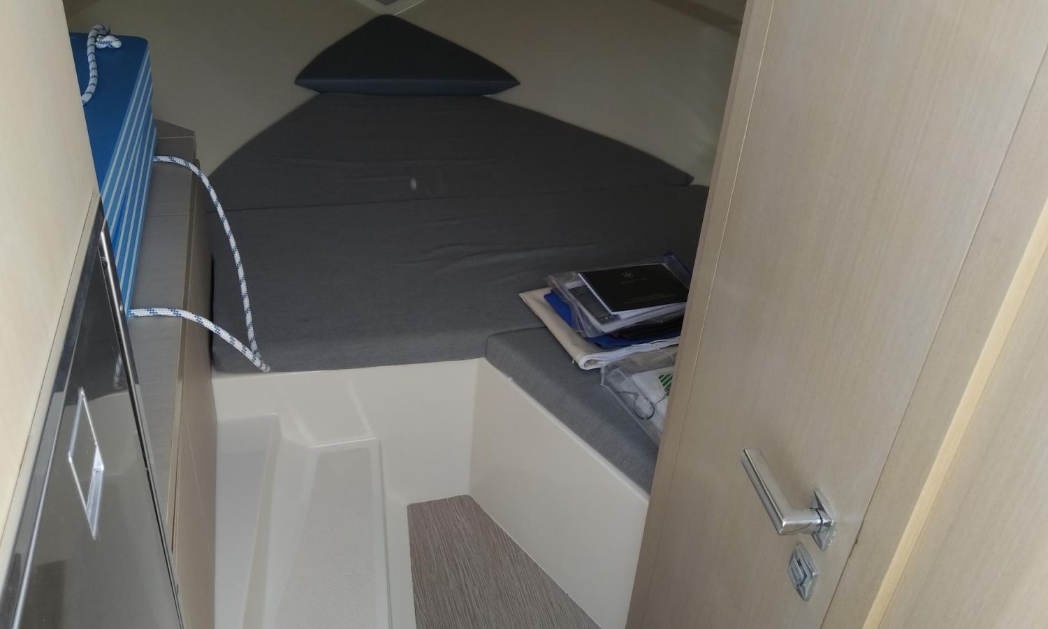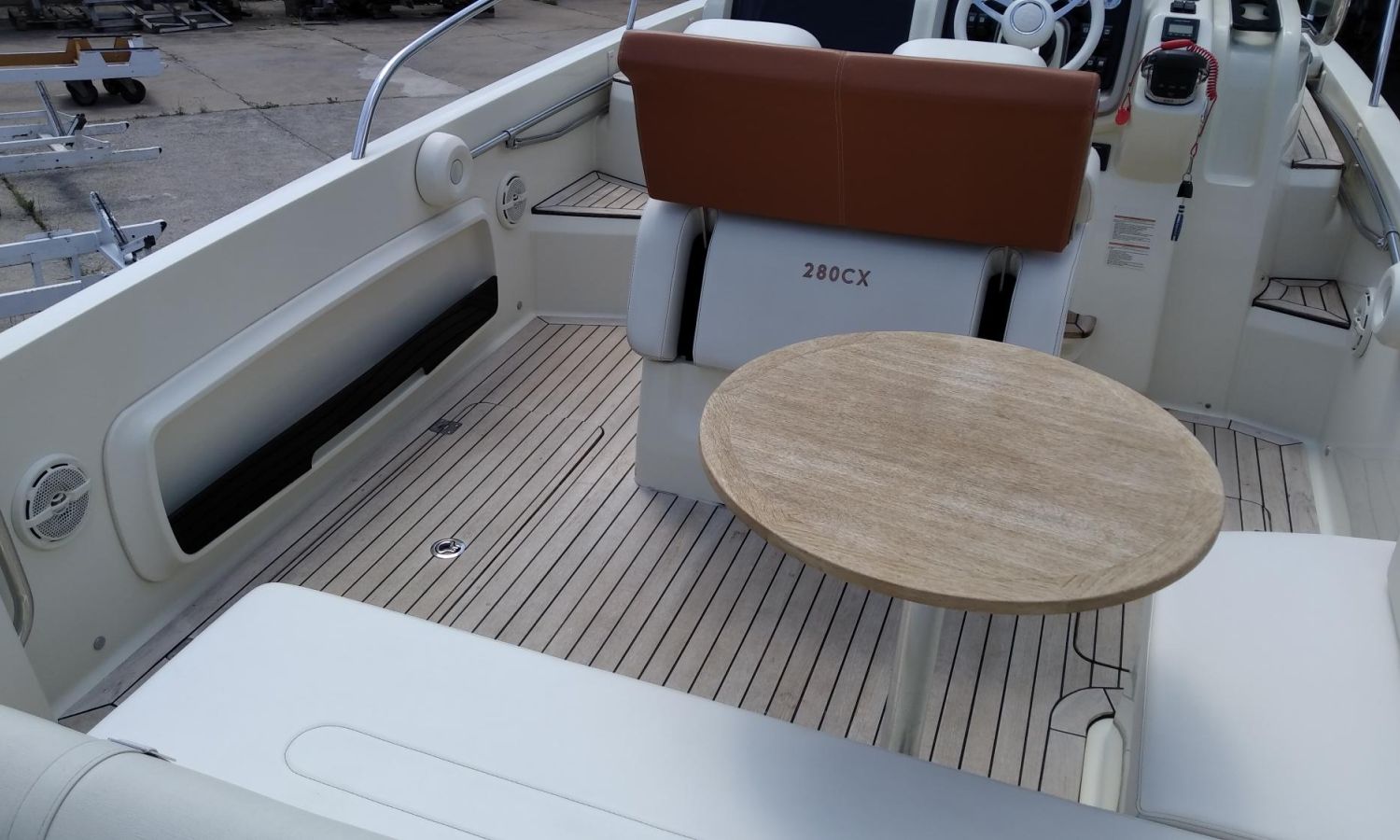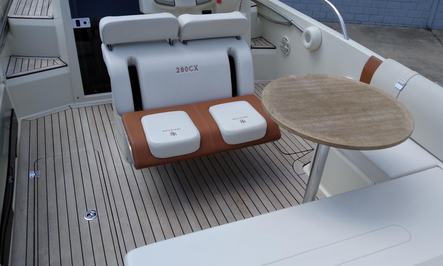 Toldo parasol - Solárium de popa - Colchonetas solárium de proa - Ducha a popa - Mesa de teca en bañera - Plataforma de baño en teca con escalera - Bañera en teca - Molinete eléctrico con ancla y cadena - Hélice de proa - GPS - Brújula - Nevera en la cabina - WC con lavabo y depósito de aguas negras.Descripción embarcación