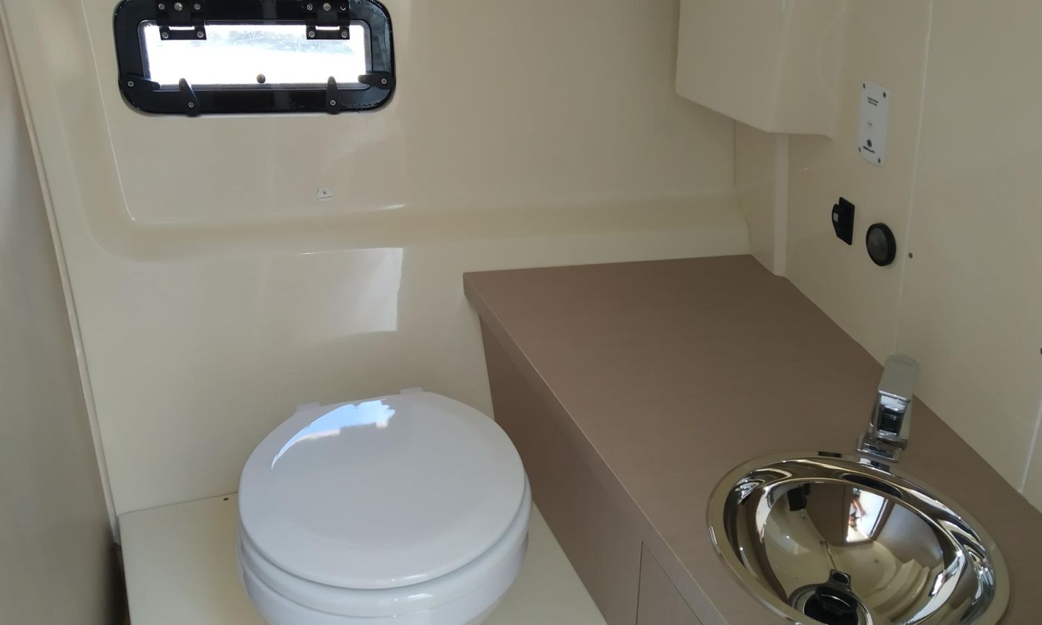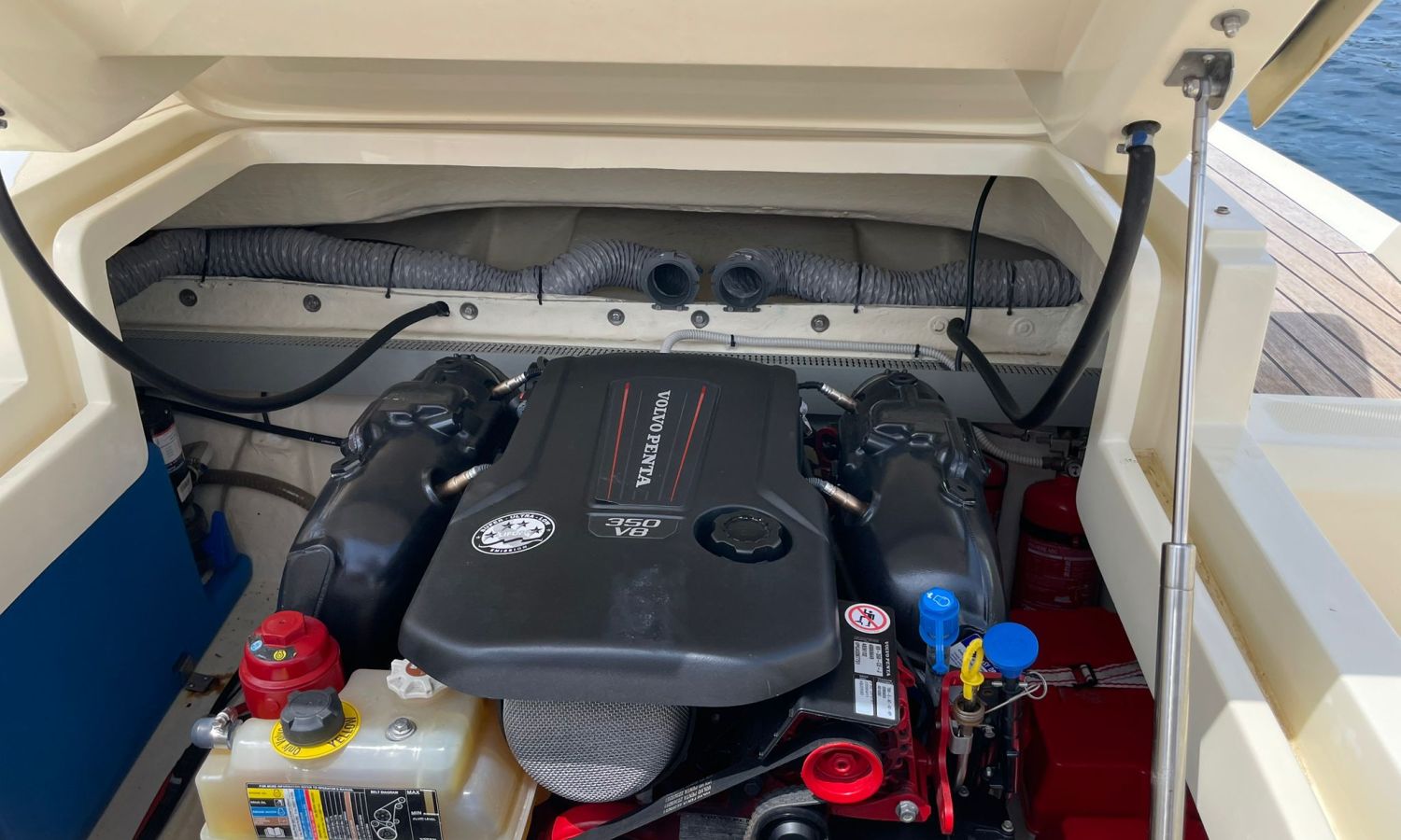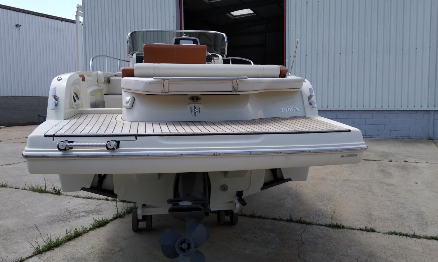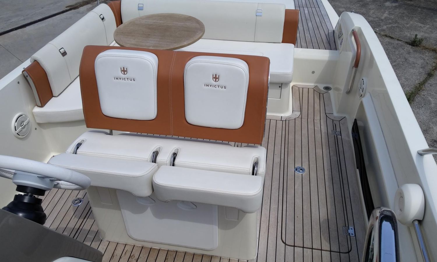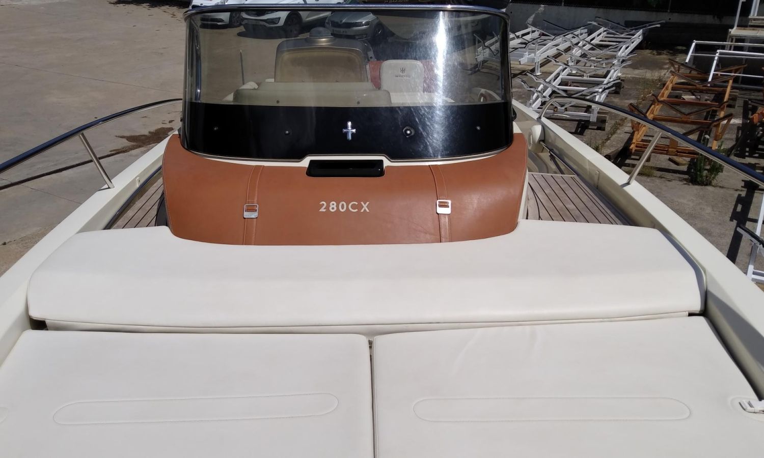 Toldo parasol - Solárium de popa - Colchonetas solárium de proa - Ducha a popa - Mesa de teca en bañera - Plataforma de baño en teca con escalera - Bañera en teca - Molinete eléctrico con ancla y cadena - Hélice de proa - GPS - Brújula - Nevera en la cabina - WC con lavabo y depósito de aguas negras.Descripción embarcación