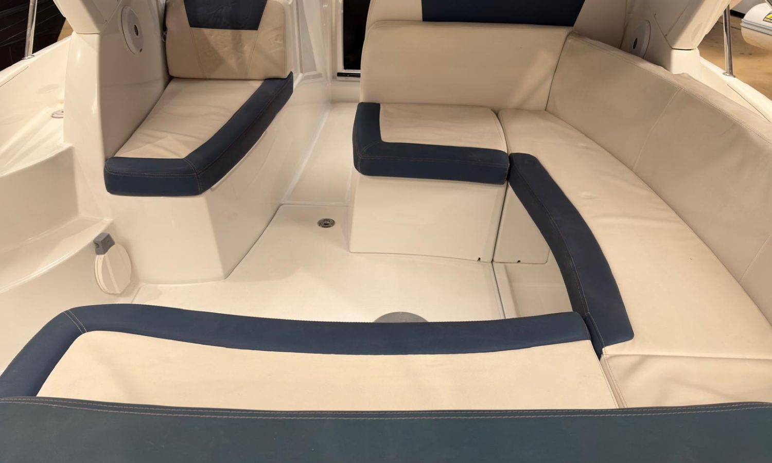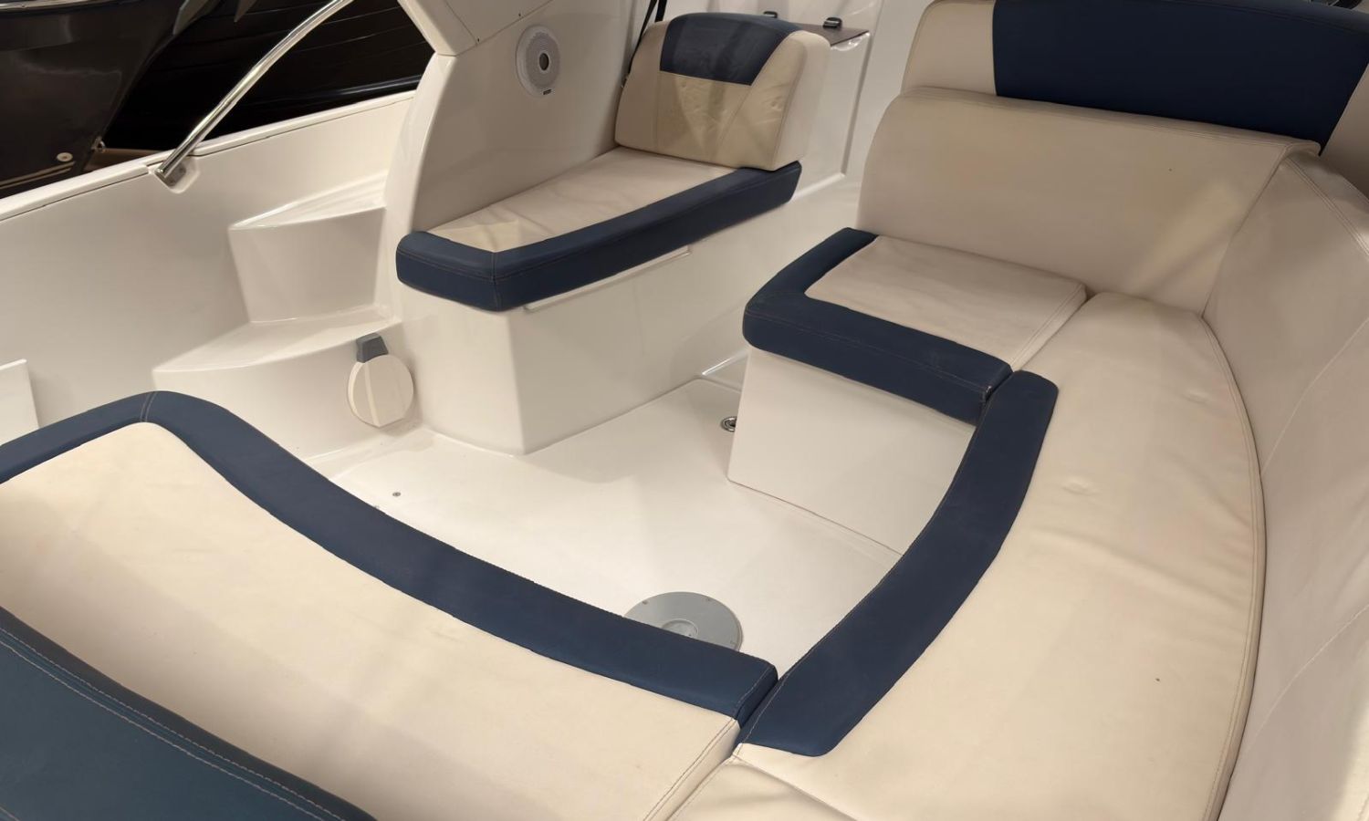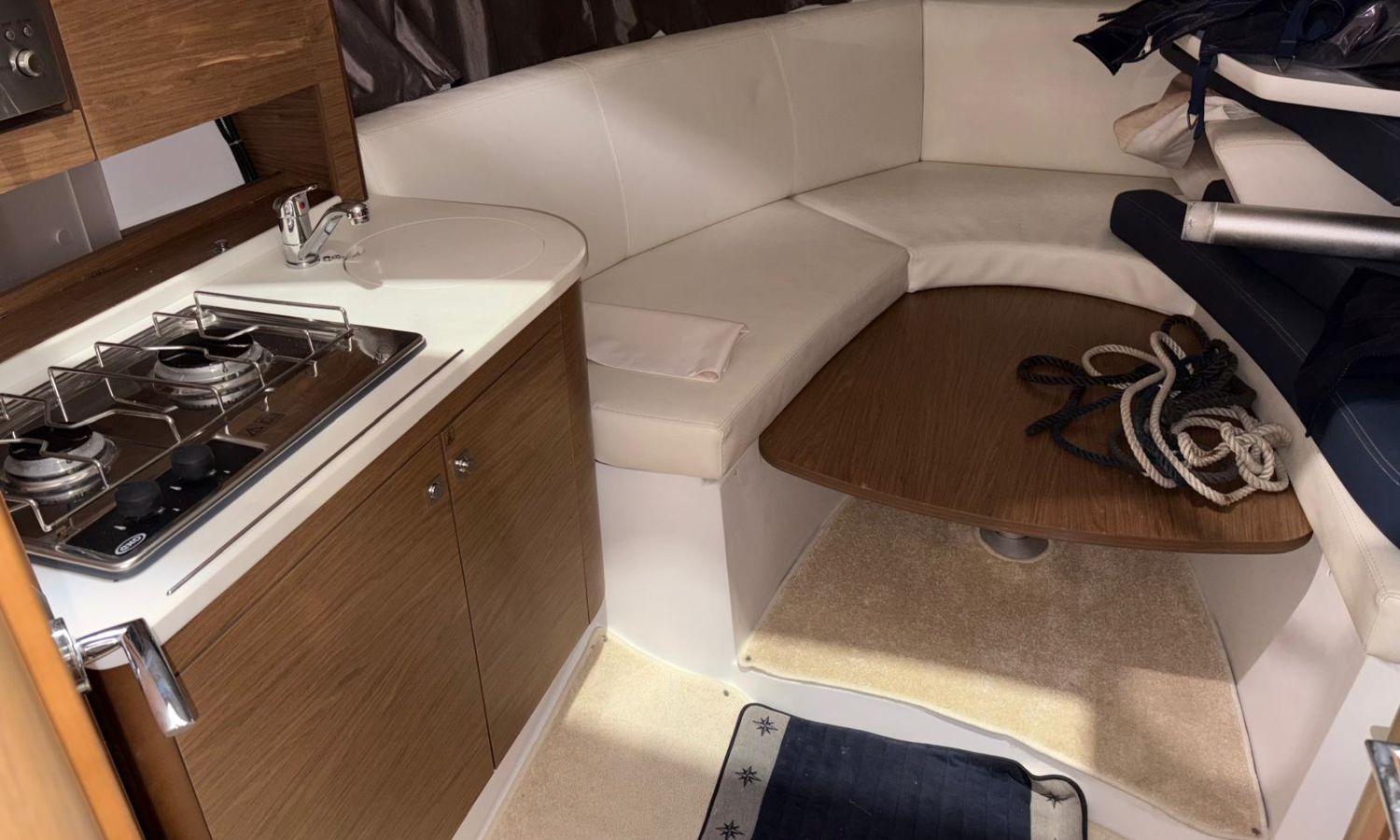 Toldo parasol - Plataforma de baño con escalera - Ducha en popa - Mesa en la bañera - Solárium de proa - Toma de puerto - Cargador de baterias - Gps/Plotter/Sonda - Vhf - Compas - Mando electrónico - 2 camarotes - Nevera 12 v. - Cocina de gas - Microondas - Fregadero - Wc marino con depósito de aguas negras - Molinete de ancla eléctrico - Antifouling.Descripción embarcación
