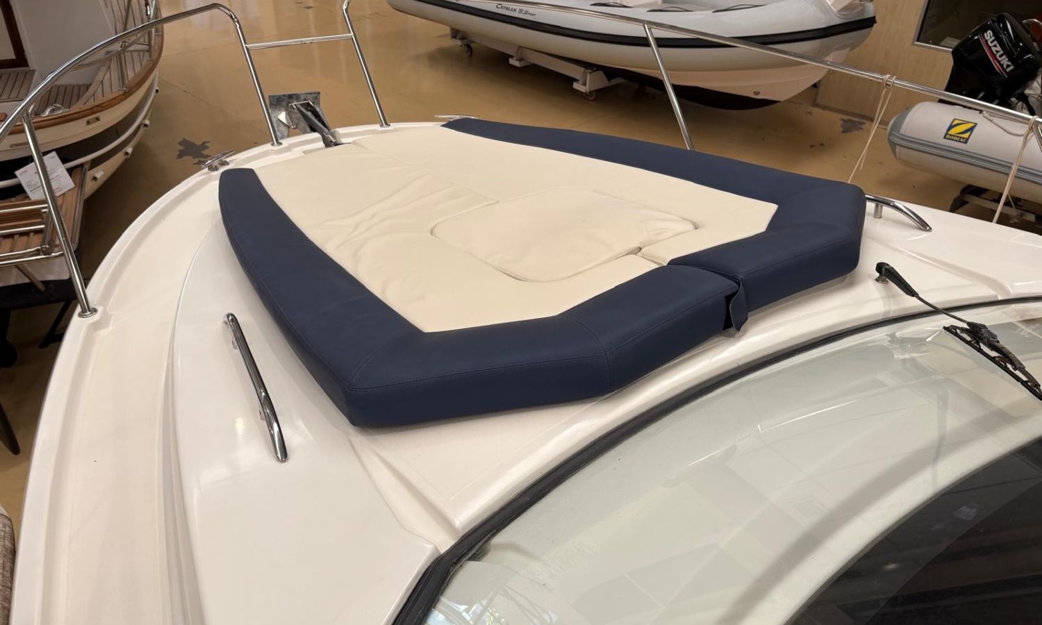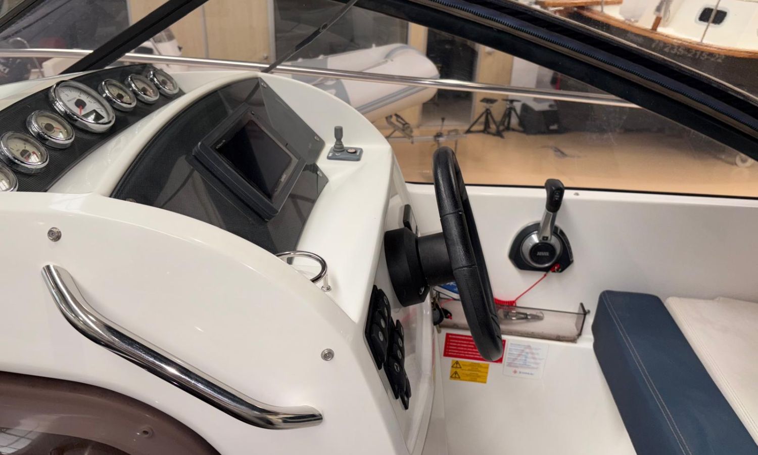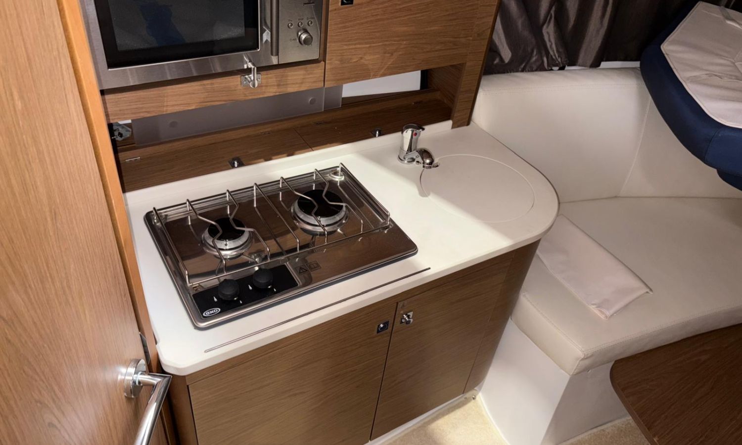Toldo parasol - Plataforma de baño con escalera - Ducha en popa - Mesa en la bañera - Solárium de proa - Toma de puerto - Cargador de baterias - Gps/Plotter/Sonda - Vhf - Compas - Mando electrónico - 2 camarotes - Nevera 12 v. - Cocina de gas - Microondas - Fregadero - Wc marino con depósito de aguas negras - Molinete de ancla eléctrico - Antifouling.Descripción embarcación