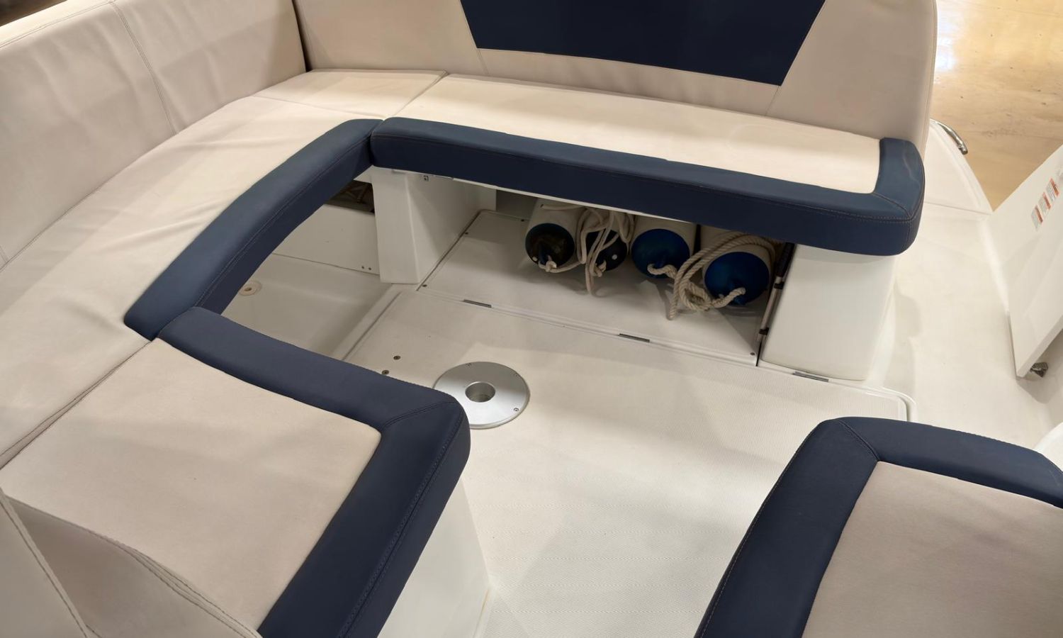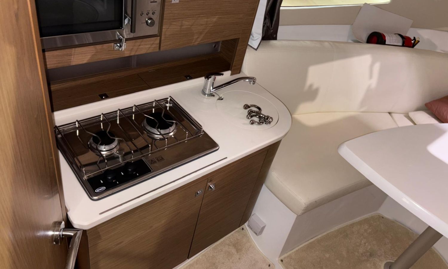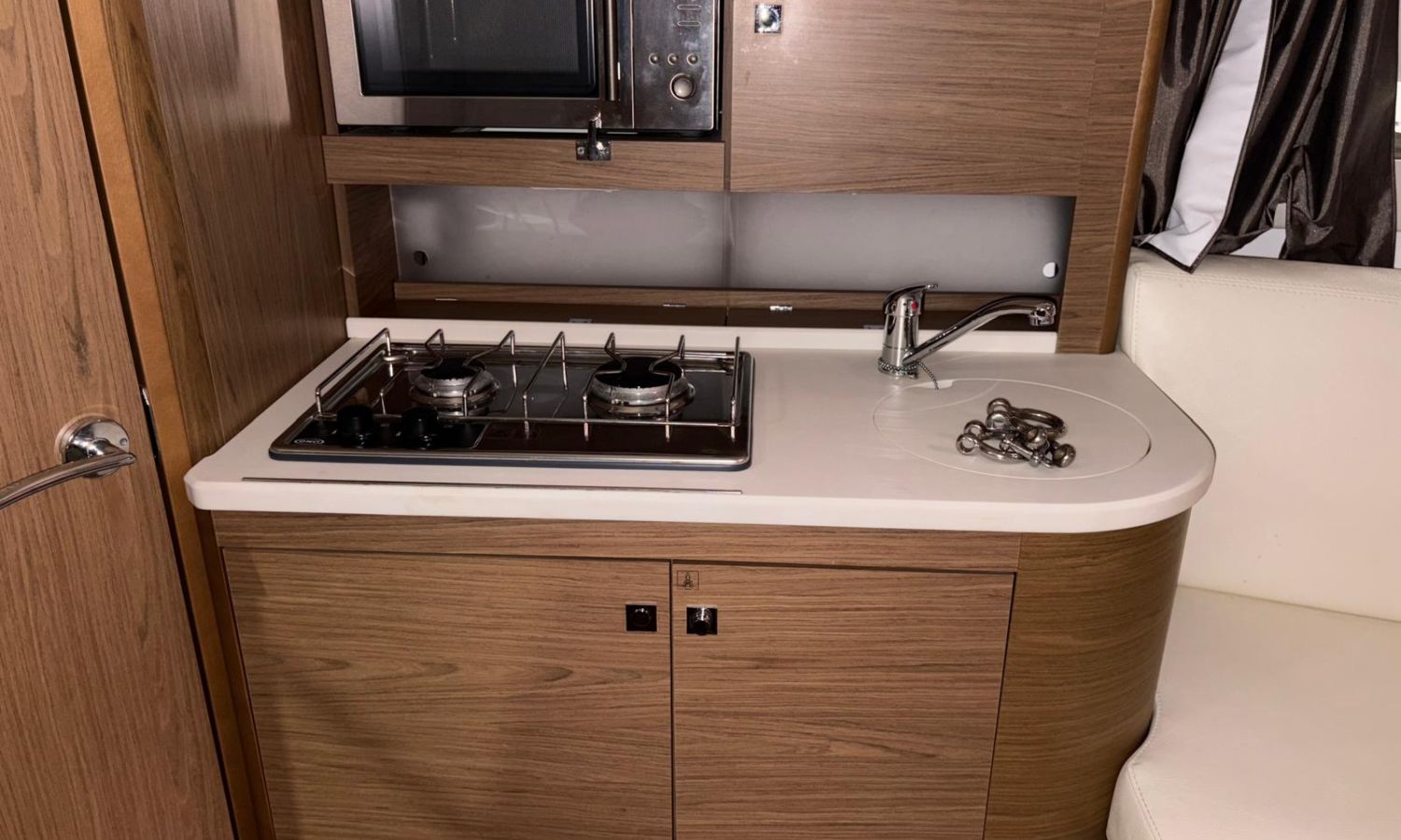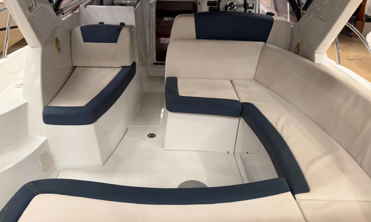 Toldo parasol - Plataforma de baño con escalera - Ducha en popa - Mesa en la bañera - Solárium de proa - Toma de puerto - Cargador de baterías - Gps/Plotter/Sonda - Vhf - Compás - Mando electrónico - 2 camarotes - Nevera 12 v. - Cocina de gas - Microondas - Fregadero - Wc marino con depósito de aguas negras - Molinete de ancla eléctrico - Antifouling.Descripción embarcación