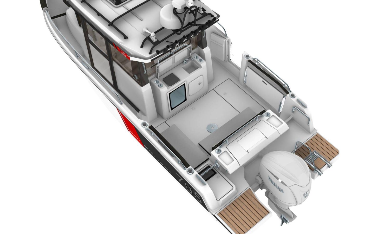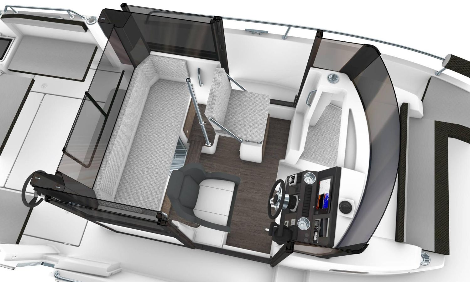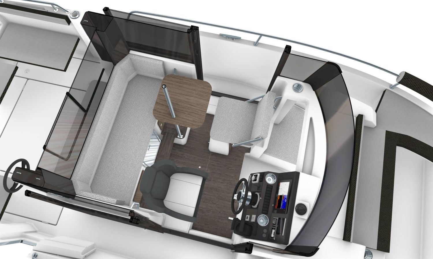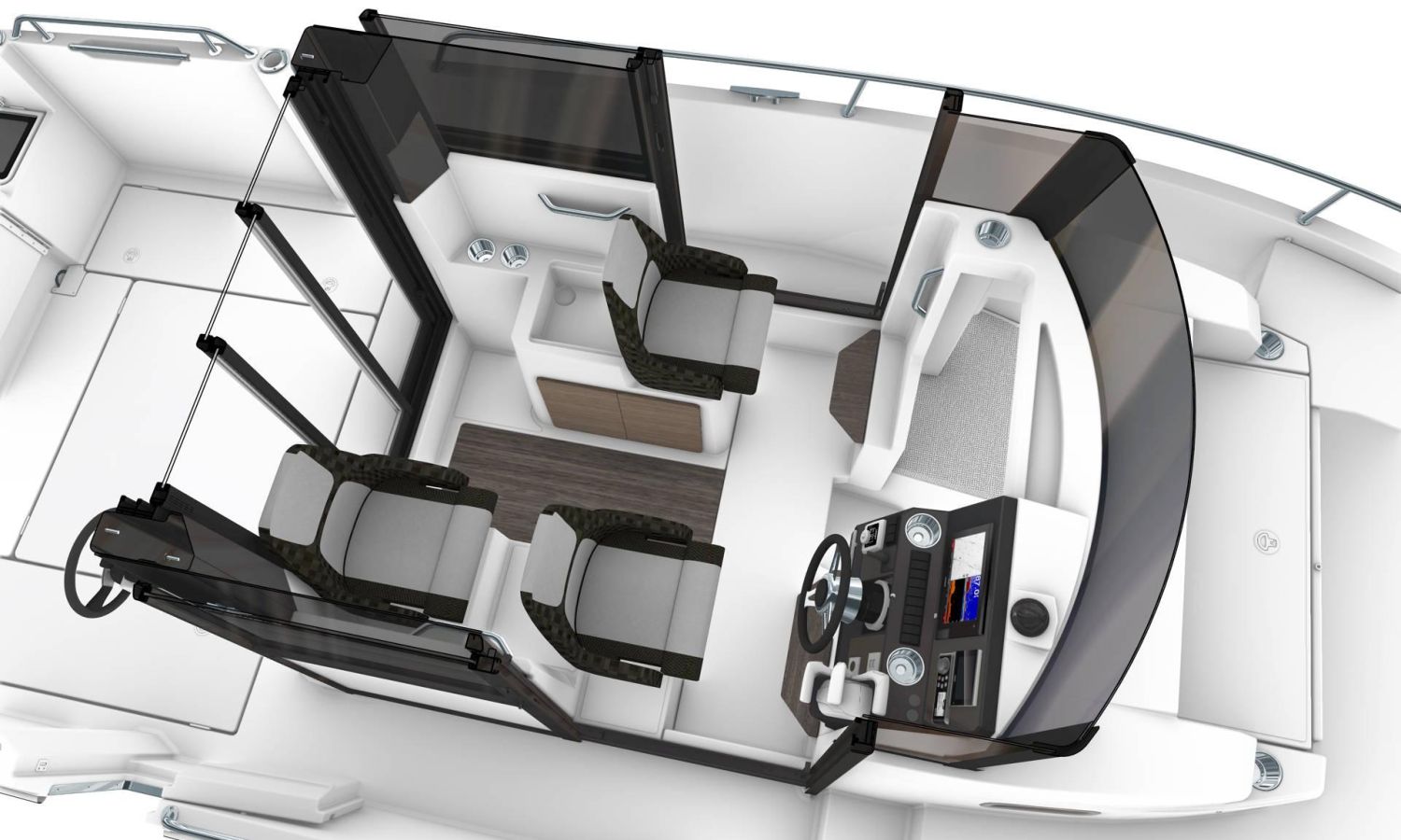 La cabina de popa grande y sin obstáculos tiene un magnífico salón, completamente convertible según sea necesario. La cabina delantera ofrece un nivel de confort nunca visto en este tipo de embarcación, ya que este amplio espacio, seguro para la pesca, se puede transformar a su vez en un salón de proa familiar o zona para tomar el sol.