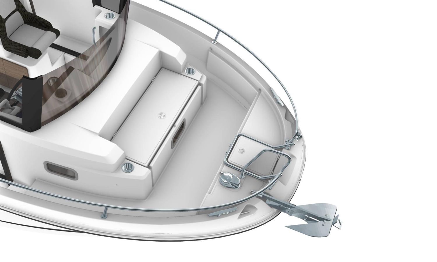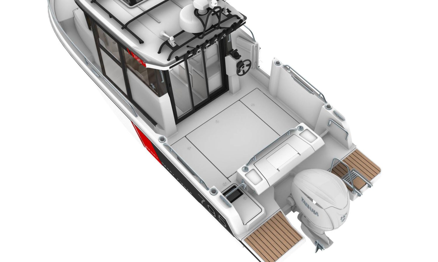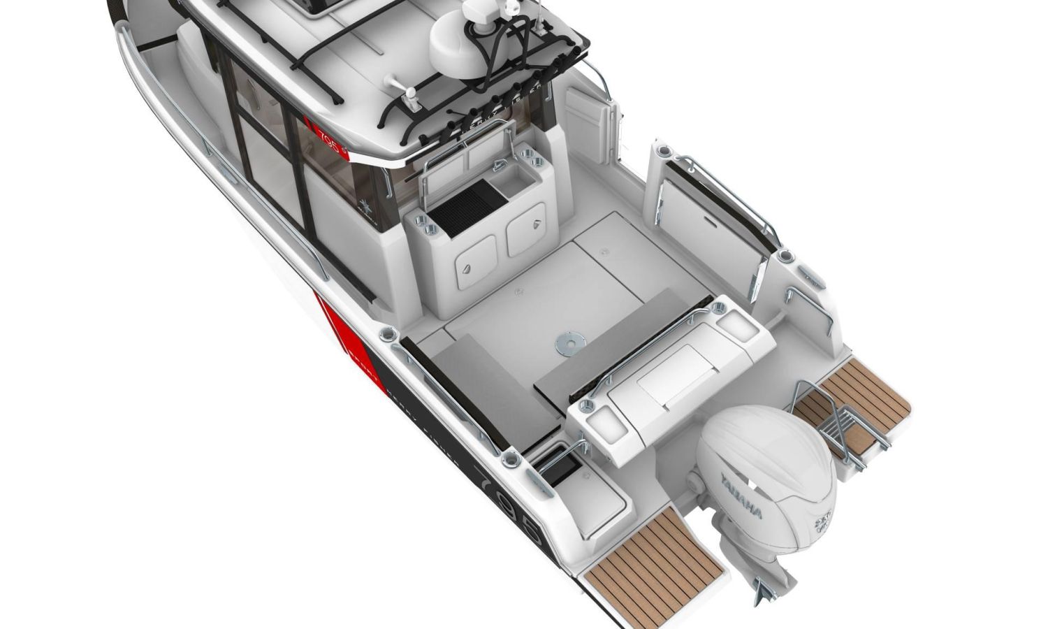 La cabina de popa grande y sin obstáculos tiene un magnífico salón, completamente convertible según sea necesario. La cabina delantera ofrece un nivel de confort nunca visto en este tipo de embarcación, ya que este amplio espacio, seguro para la pesca, se puede transformar a su vez en un salón de proa familiar o zona para tomar el sol.