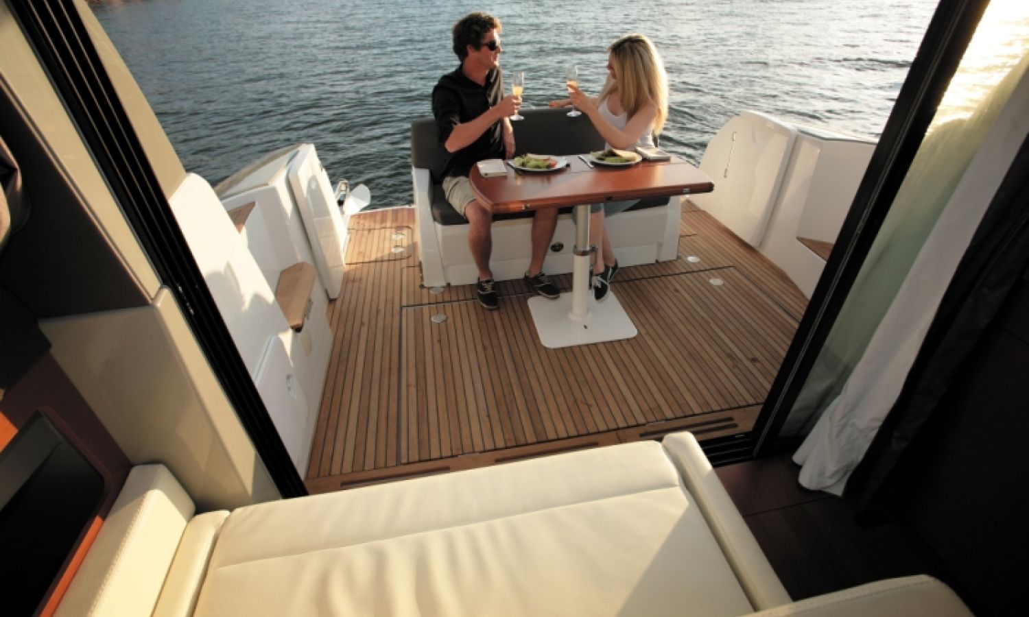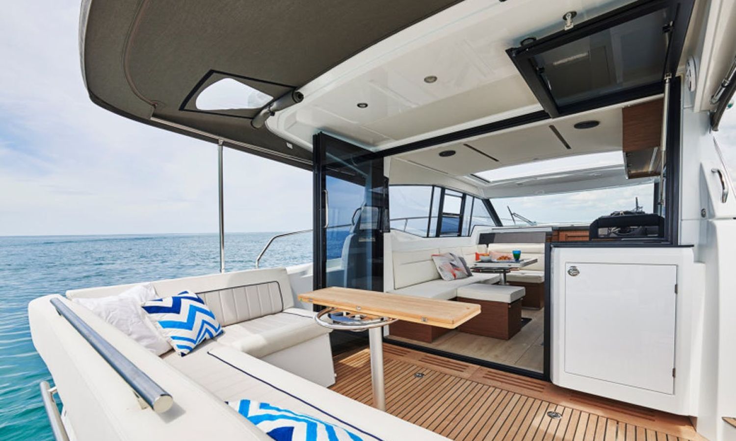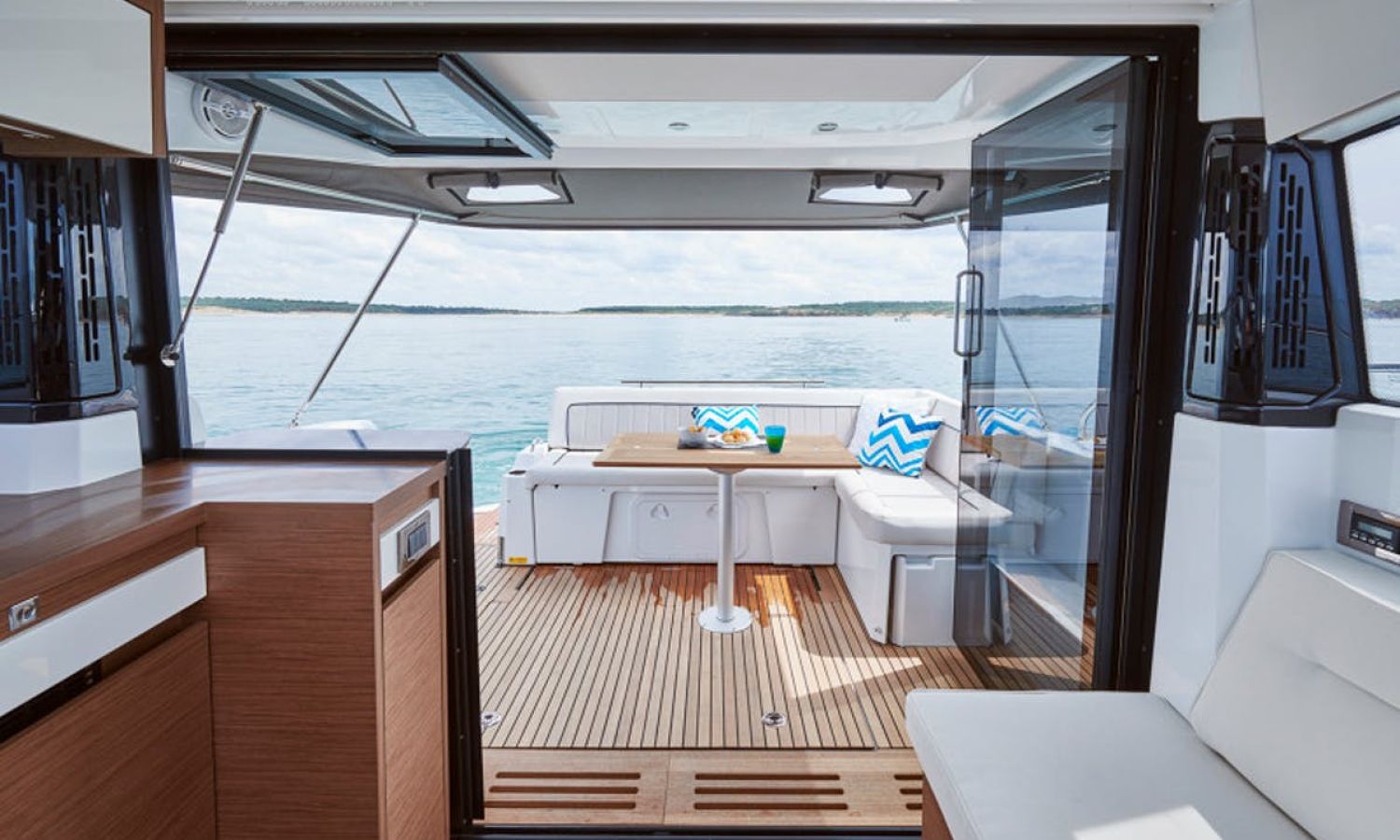 PENSADO PARA VIVIR CON EL MAR, EL NC 37 ES MUY ABIERTO POR FUERA. EL MODELO TOMA LA DNA DE LA GAMA DISEÑADA PARA EL CRUCERO CÓMODO Y ARMONIOSO.