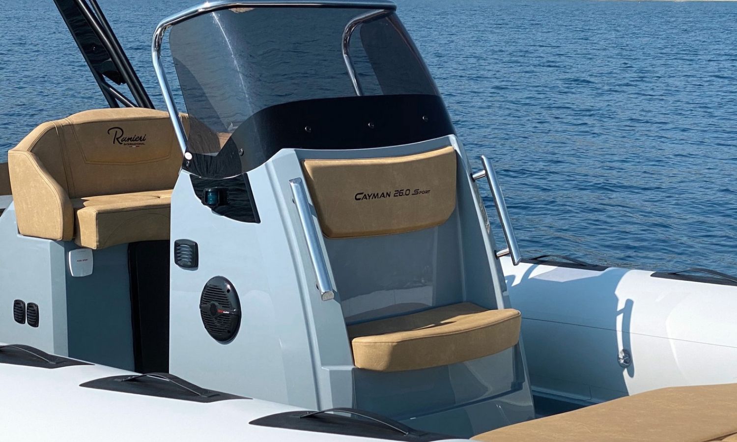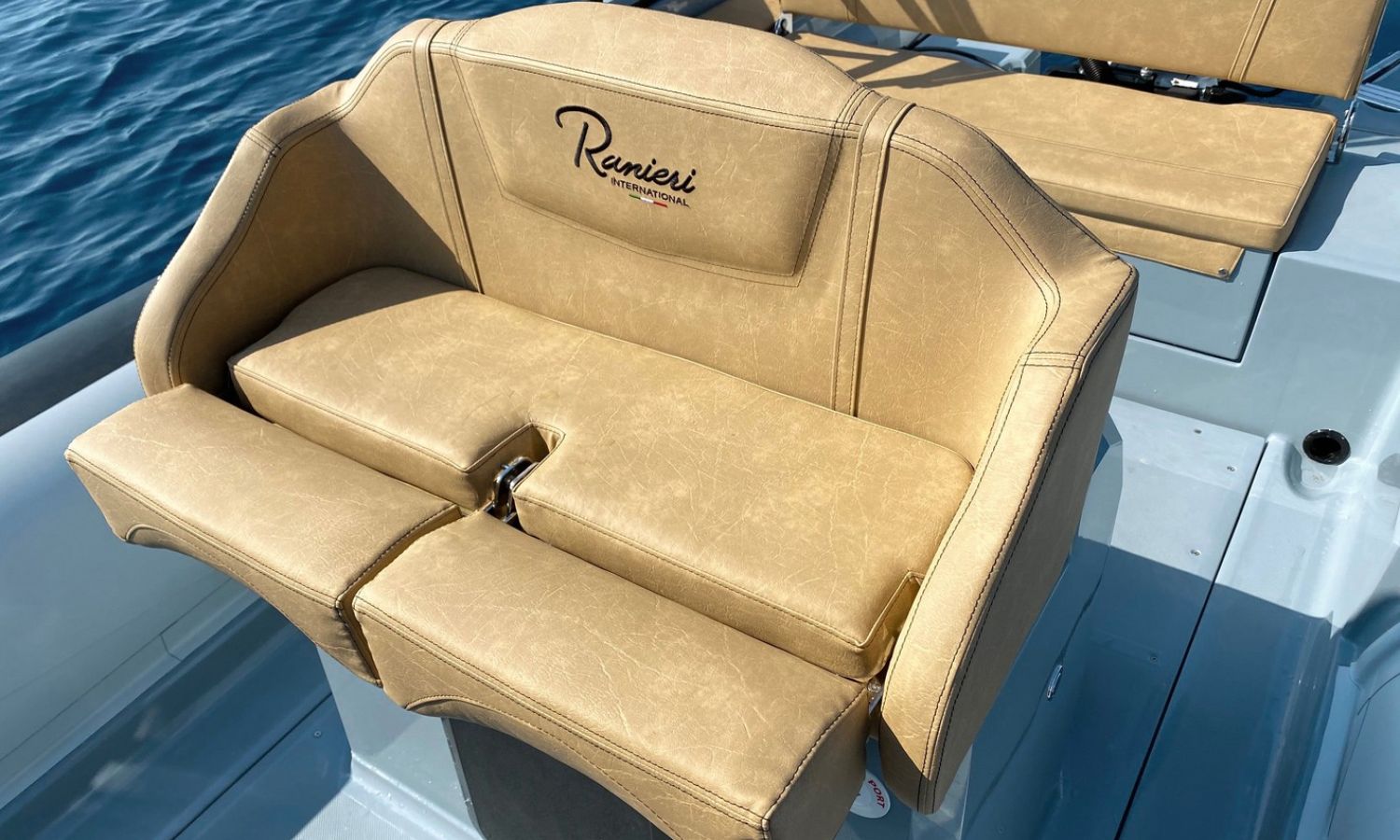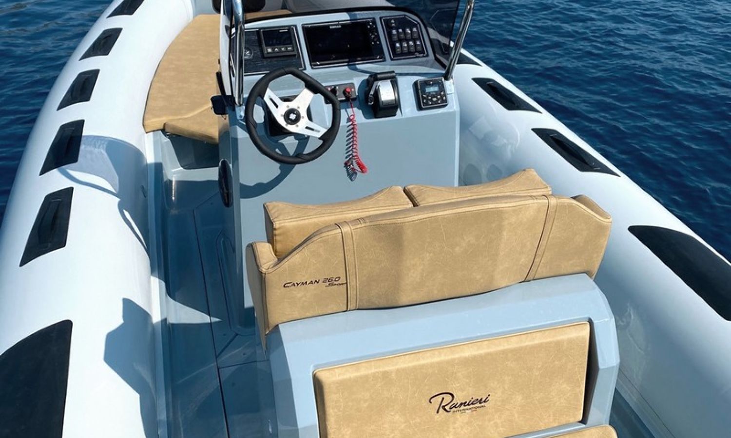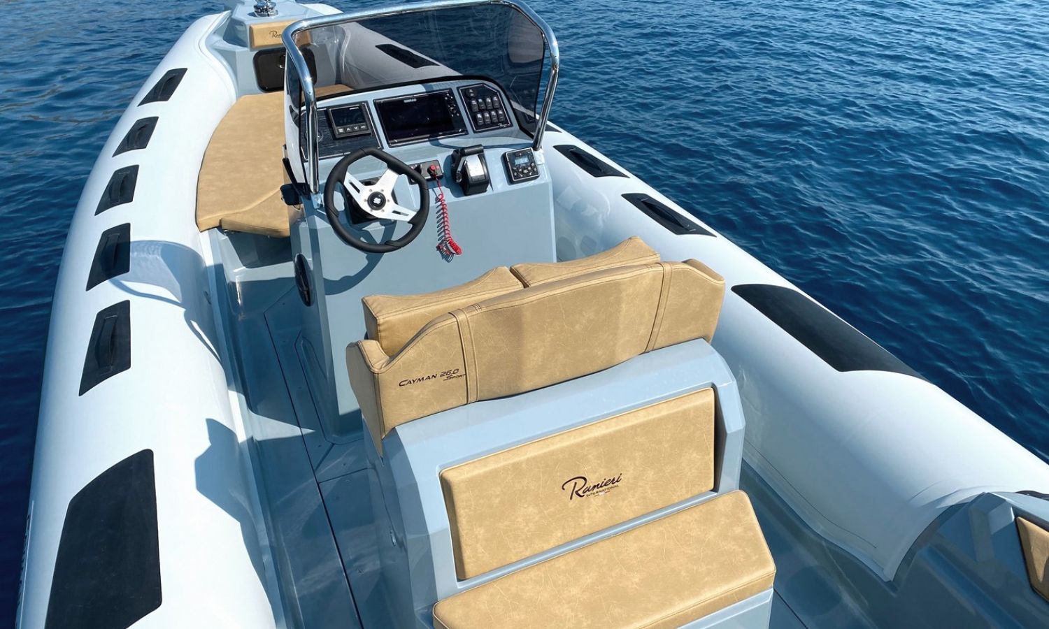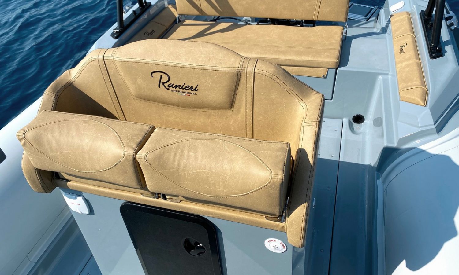 Ranieri lanza al mercado semirrígidas de 26 pies en adelante. Estilo, confort y potencia garantizados.Algunos accesorios estándar de este modelo son la consola completa con cuadro de mandos Luxury, el amplio solárium de proa con colchonetas, luces de navegación, panel eléctrico, plataformas de popa en fibra de vidrio y escalera telescópica, varios cofres para estiba, desconectador de batería, mesa de popa, dirección hidráulica, etc. ¡Complete la configuración de este barco a su gusto con los accesorios opcionales!
