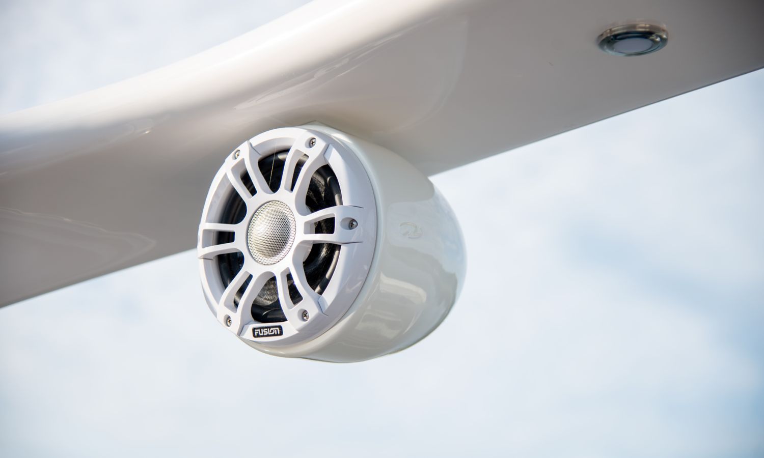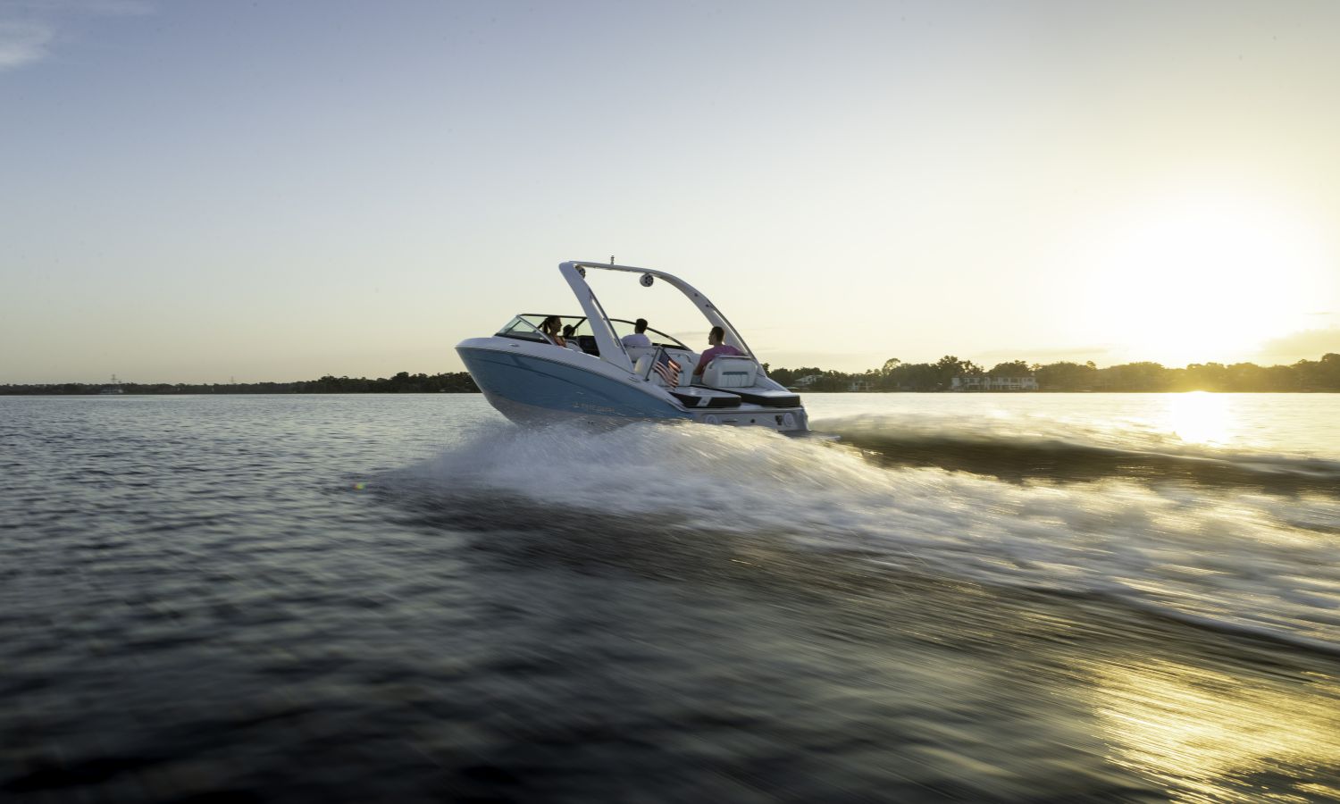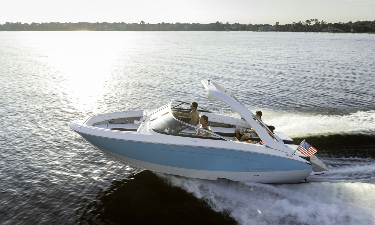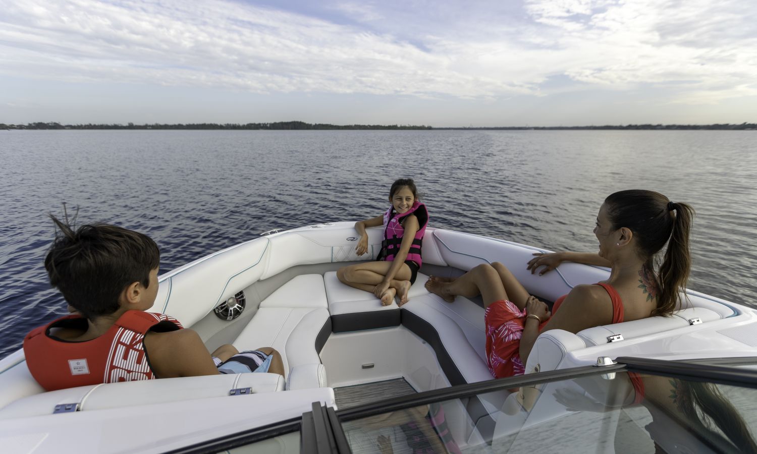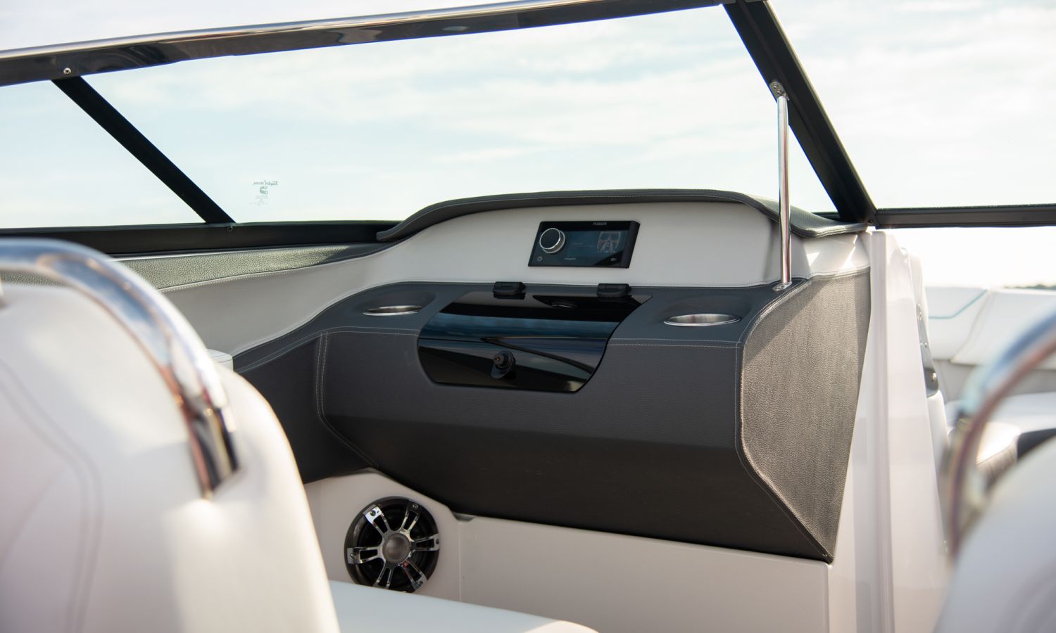 Casco diseño FasTrack. Más velocidad y menos consumo. El amplio solárium de popa se complementa con un cojín que al levantarlo crea un cómodo pasillo de acceso a la bañera. Provista de múltiples asientos como el sofá de 3 plazas, el asiento individual para el piloto y el amplio asiento del acompañante convertible en diván o los de proa en forma de V y convertibles en solárium, el toldo parasol y el equipo de sonido, hacen que la bañera de esta embarcación proporcione el confort necesario para disfrutar del mar.