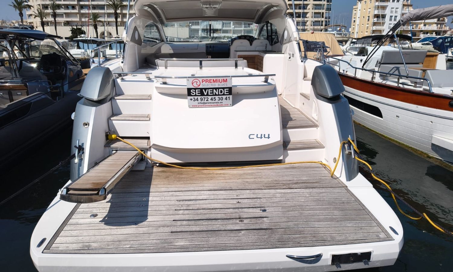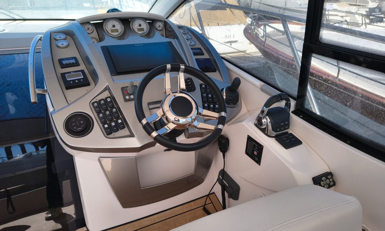 Hard Top - Toldo bimini - Hélice de proa - Flaps - Toma de puerto 220 V - Cargador de baterías - Generador - Solárium de proa - WC con depósito de aguas negras - 2 Cabinas - 2 Baños - Molinete eléctrico - Pasarela hidráulica - Mesa en la bañera - Mueble bar con fregadero - VHF - GPS/Plotter/Sonda - Piloto automático - Mandos electrónicos - Equipo de audio - Flaps - Ducha en popa - Vitro - Nevera 12 V/220 V - Microondas - Toma de agua exterior - Plataforma de baño hidráulica - JoystickDescripción embarcación