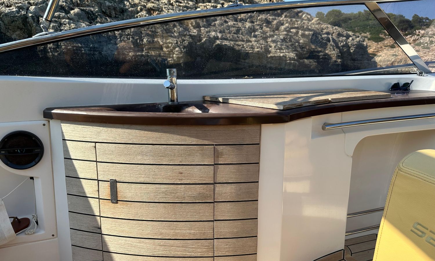 Toldo bimini - Molinete de ancla eléctrico - Ducha en popa - Solárium de popa - Wc eléctrico - Luces de navegación - Flaps - 2 baterías - fregadero - Nevera - Equipo de audio - Gps/Sonda - Vhf - Garmin - Antifouling.Descripción embarcación