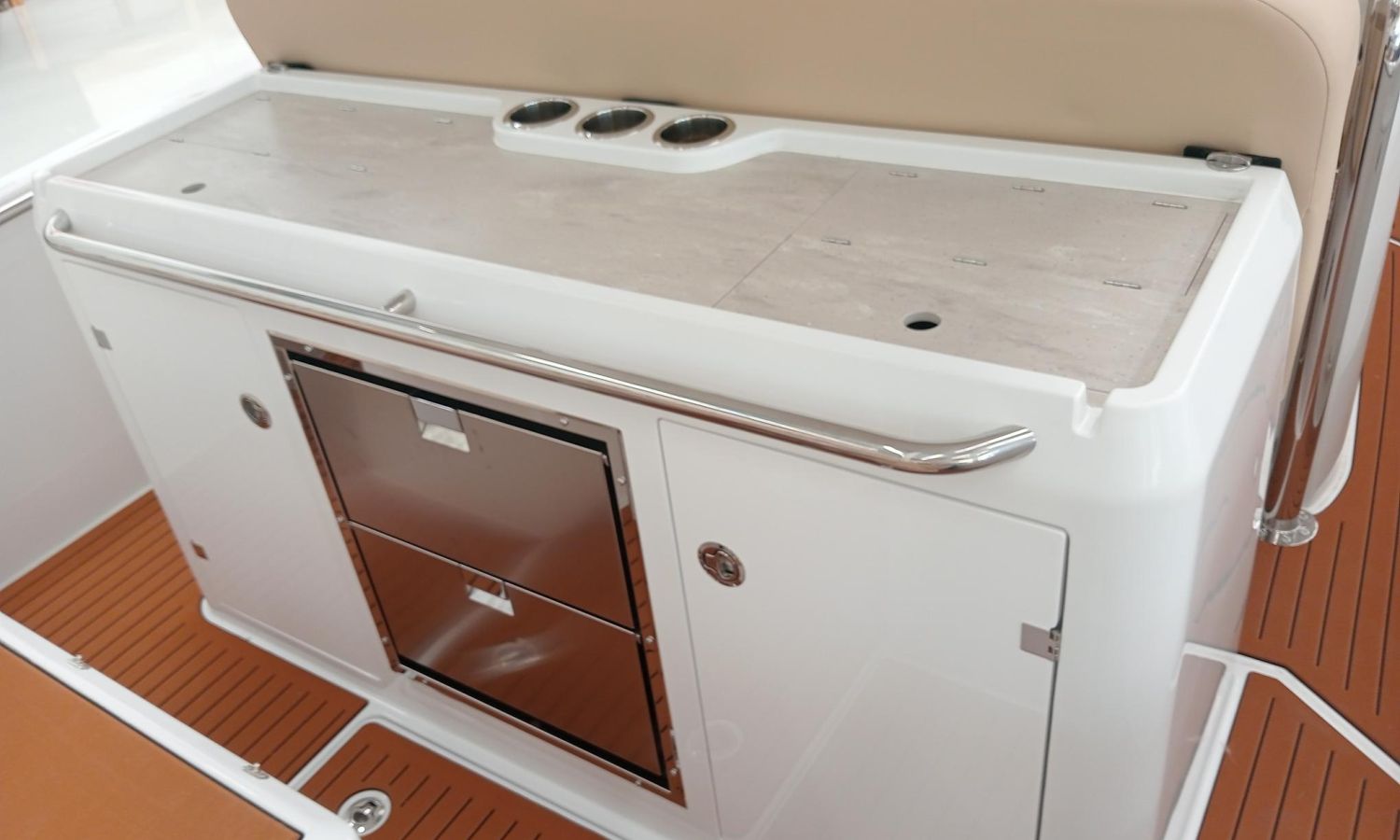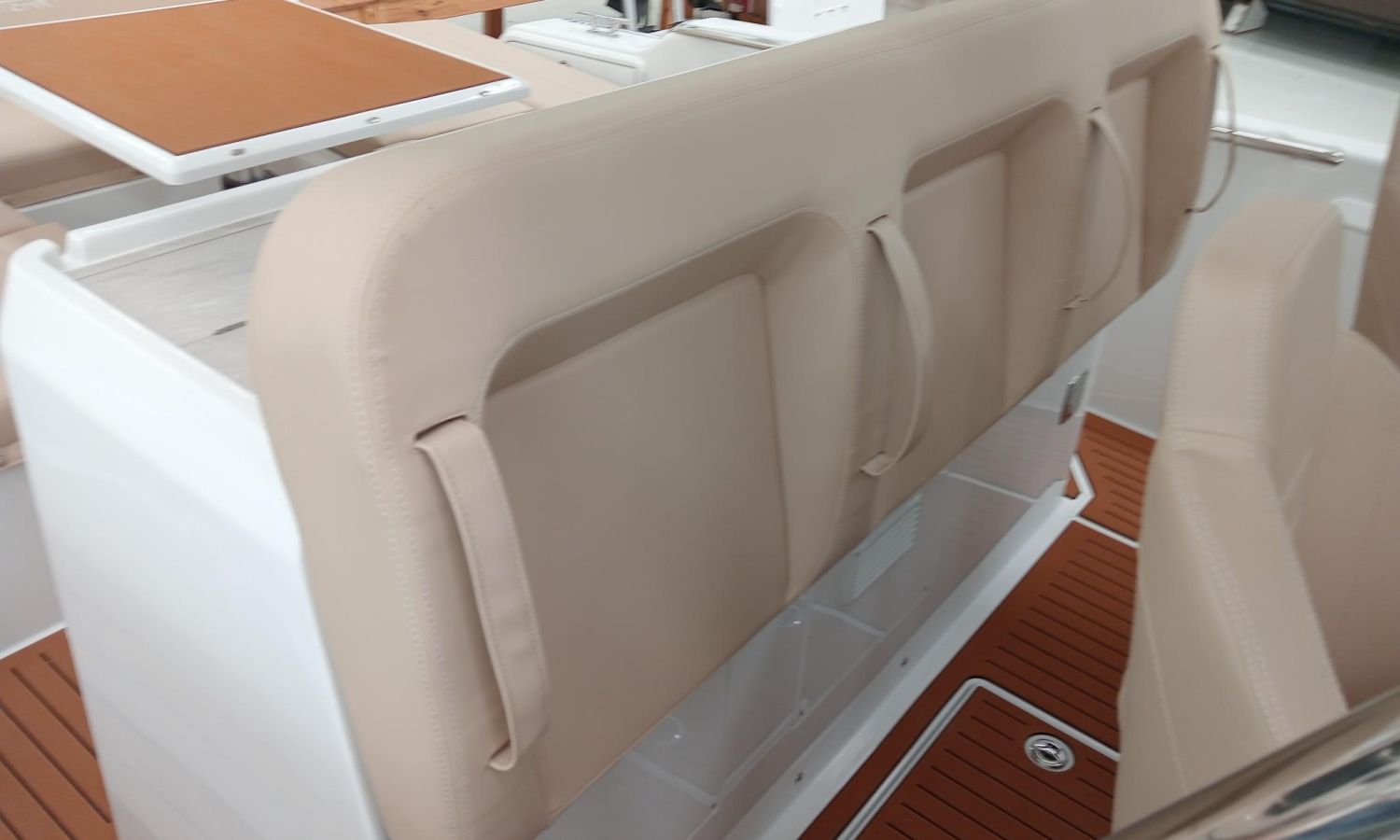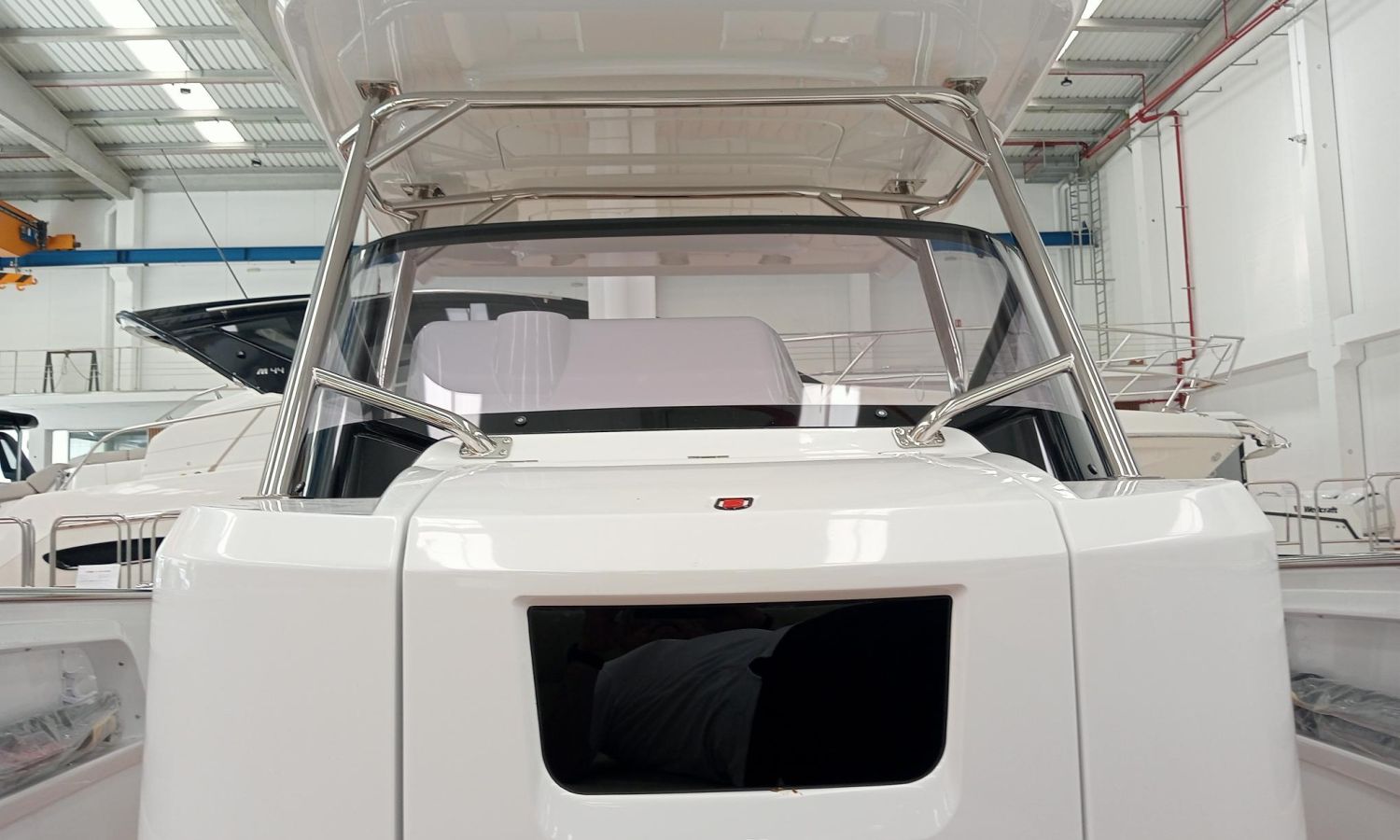 Pre-rigging para 2 motores Yamaha - T- top fabricado en PRFV con estructura de acero inoxidable - Molinete eléctrico + kit de fondeo - Sistema de agua a presión con ducha en popa y tanque de agua dulce 130 L. - Mesa en proa con pie convertible en solarium - Luces de navegación - Toldo Bimini en popa - Paquete Hifi con 2 altavoces - Frigorifico 30l con compresor y 2 cajones - Envoltura vinilica de rayas superiores - Raya vinilica envolvente en T-Top - Helice de proa - Certificado de constructor - Transporte desde el Astillero - Costa-Brava - Preparación botadura y entrega en el mar.Descripción embarcación