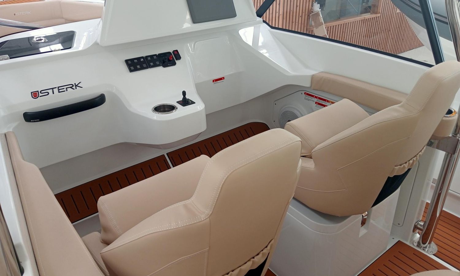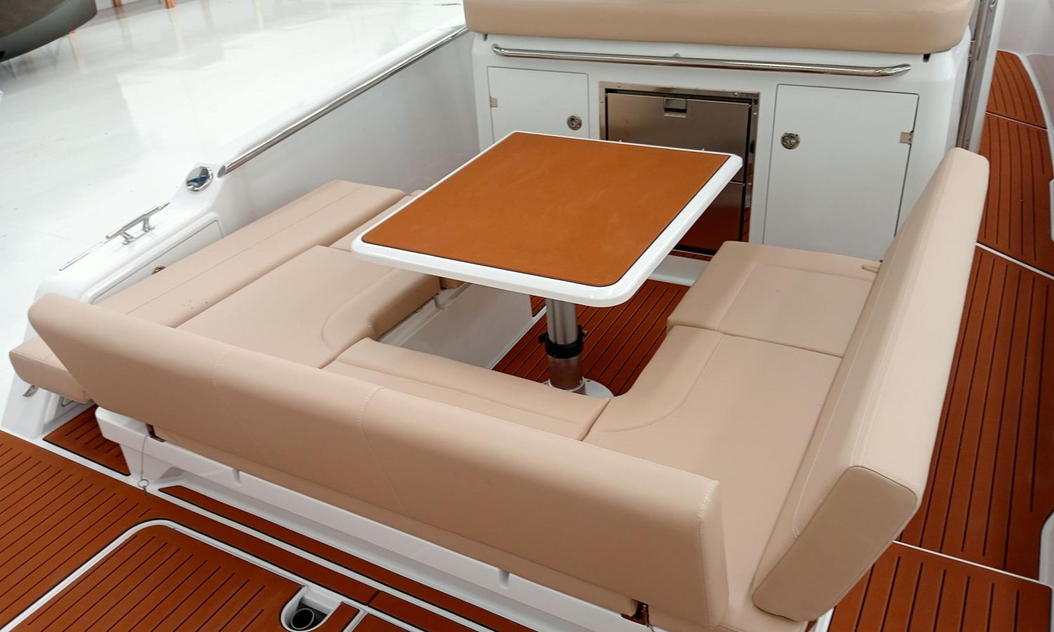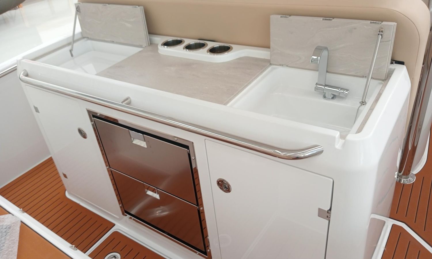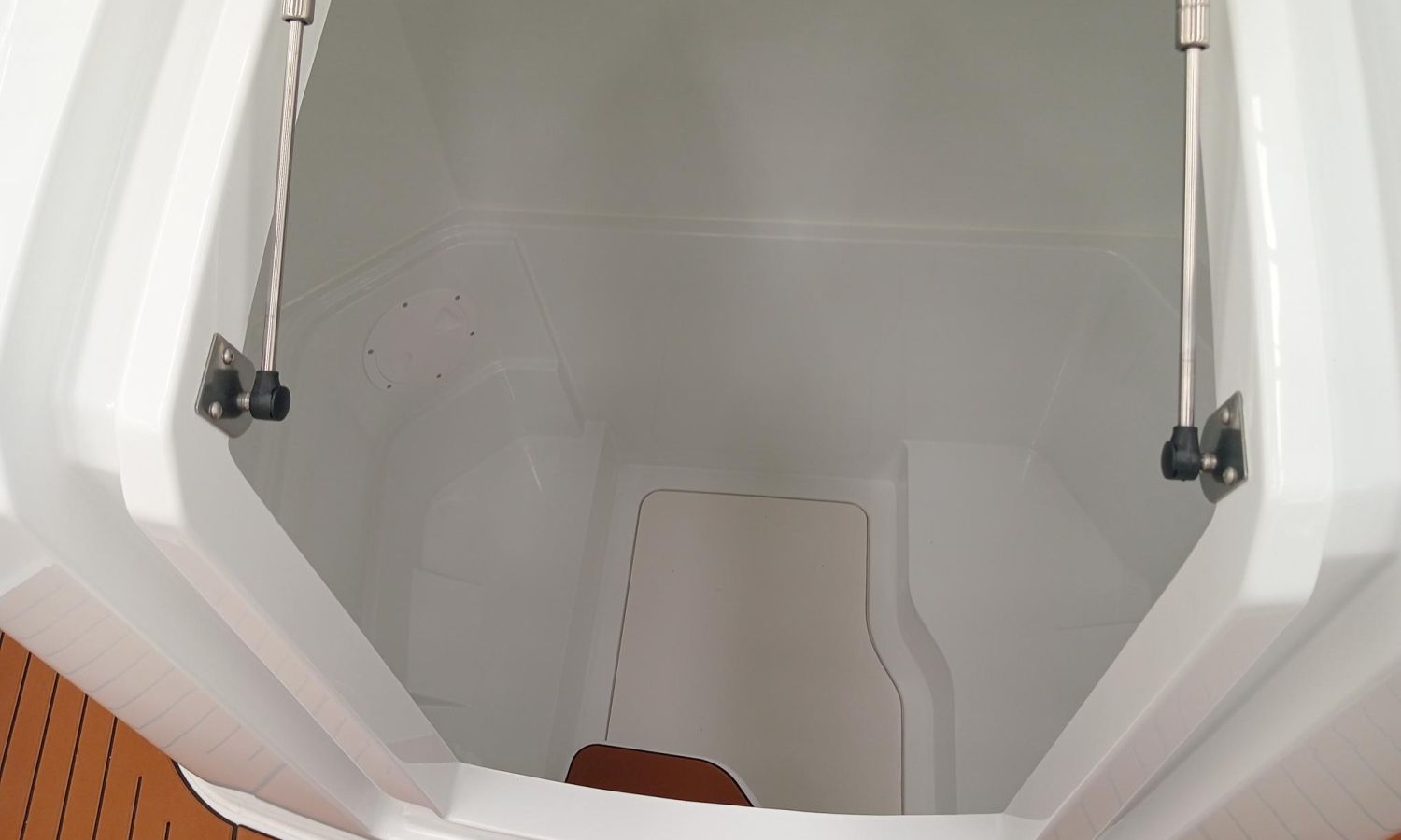 Pre-rigging para 2 motores Yamaha - T- top fabricado en PRFV con estructura de acero inoxidable - Molinete eléctrico + kit de fondeo - Sistema de agua a presión con ducha en popa y tanque de agua dulce 130 L. - Mesa en proa con pie convertible en solarium - Luces de navegación - Toldo Bimini en popa - Paquete Hifi con 2 altavoces - Frigorifico 30l con compresor y 2 cajones - Envoltura vinilica de rayas superiores - Raya vinilica envolvente en T-Top - Helice de proa - Certificado de constructor - Transporte desde el Astillero - Costa-Brava - Preparación botadura y entrega en el mar.Descripción embarcación